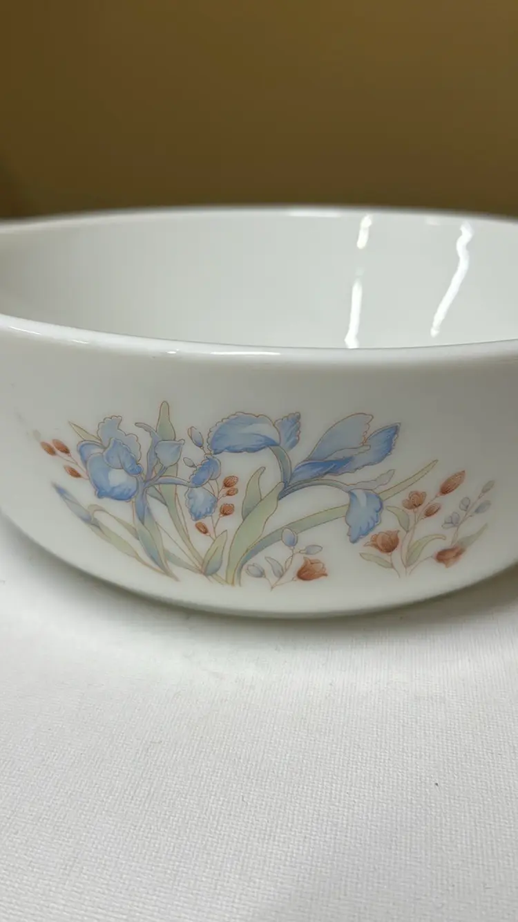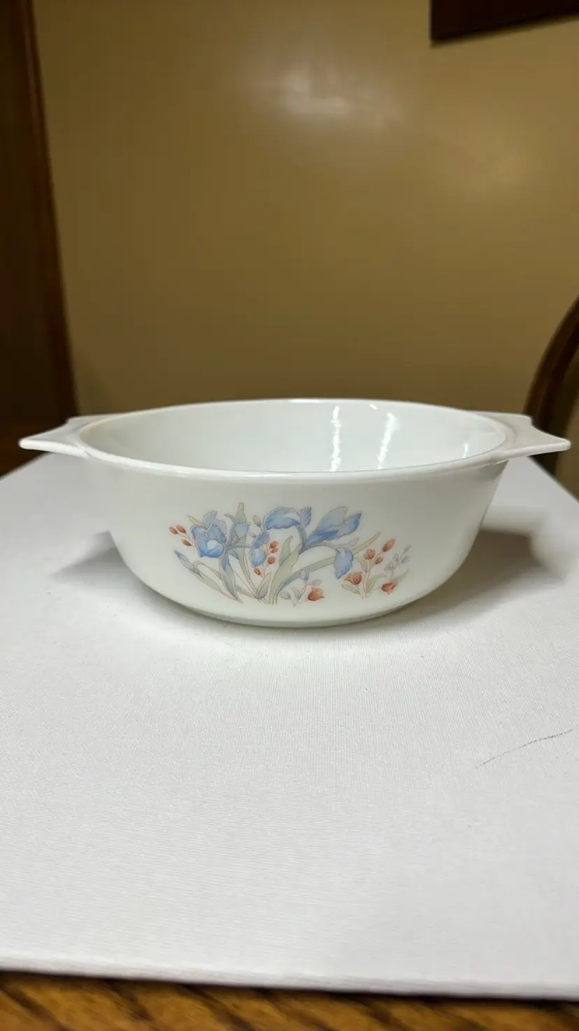 VTG Pyrex Blue Iris Round Casserole Baking Dish 8 x 3" Made in England Excellent condition there are some really light scratches on the inside from use (16112124a)