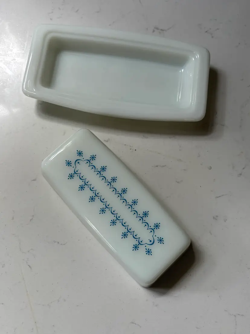 Vintage Pyrex butter dish with lid, blue snowflakes