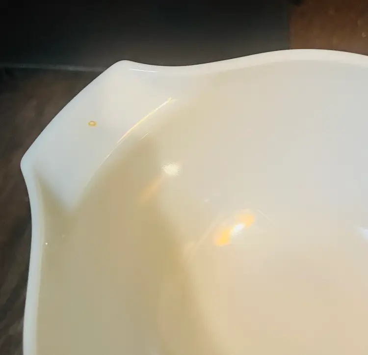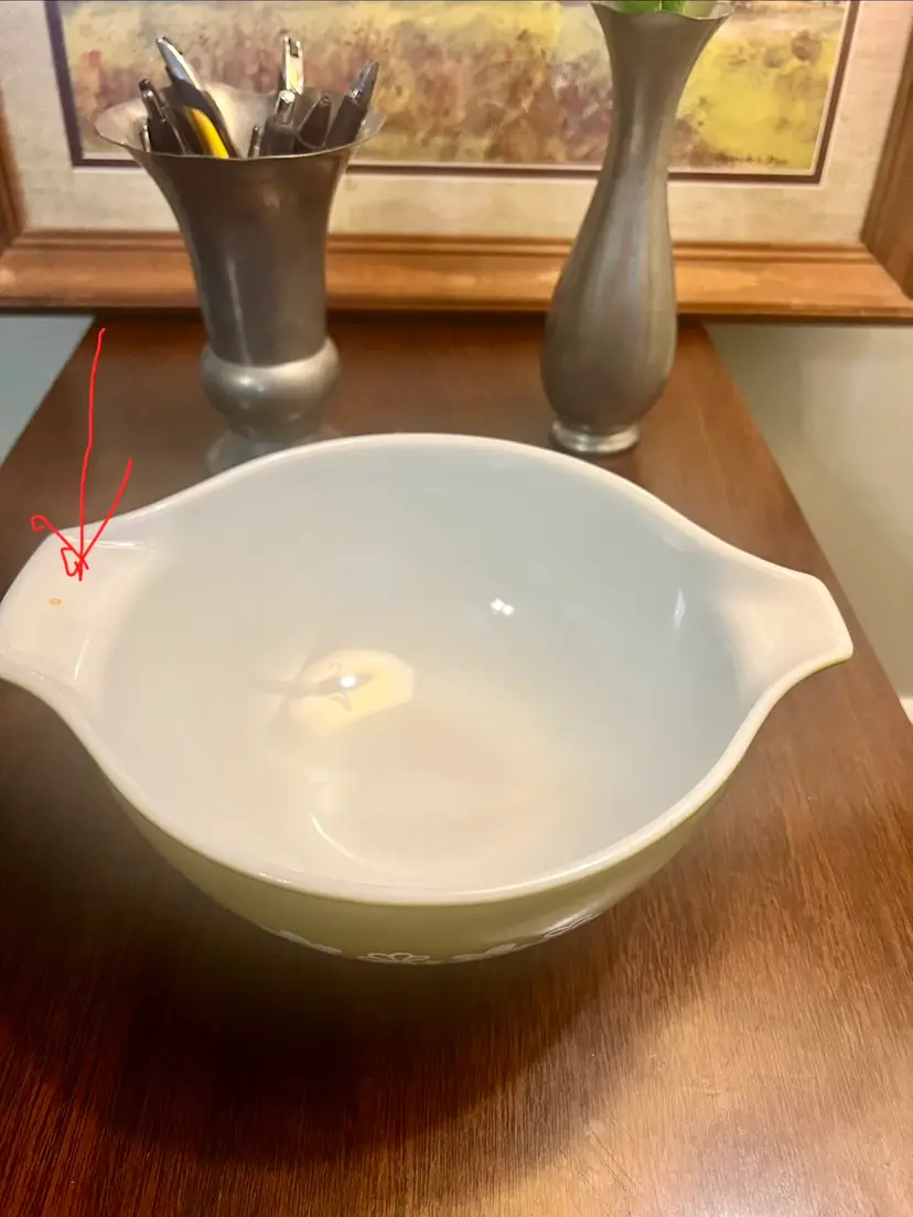 This bowl screams Thanksgiving dinner at Grandma’s house! She looks like she’s been used for cooking and serving green beans, honey carrots or cream corn since before Mila Kunis and Ashton Kutcher were born. Of course this is a vintage Pyrex Cinderella mixing bowl in the "Spring Blossom" pattern, often called "Crazy Daisy.” She’s typical 70’s avocado green with white floral "Spring Blossom” pattern. She comes standardly equipped with convenient handles on either side. Bonus: These handles also function as spouts for draining veggies or pouring batter easily! Durable heat-resistant glass produced in the 1970’s. This bowl has no chips or cracks but does have a tiny rust spot on one spout and slight scuffing on the bottom (both pictured and price reflects this). Honestly, the inside of this bowl is pristine which is amazing since I can attest to how many dinners she has served. She’s the 2nd smallest bowl that was sold in a set of 4. The perfect size for serving sides at every meal!