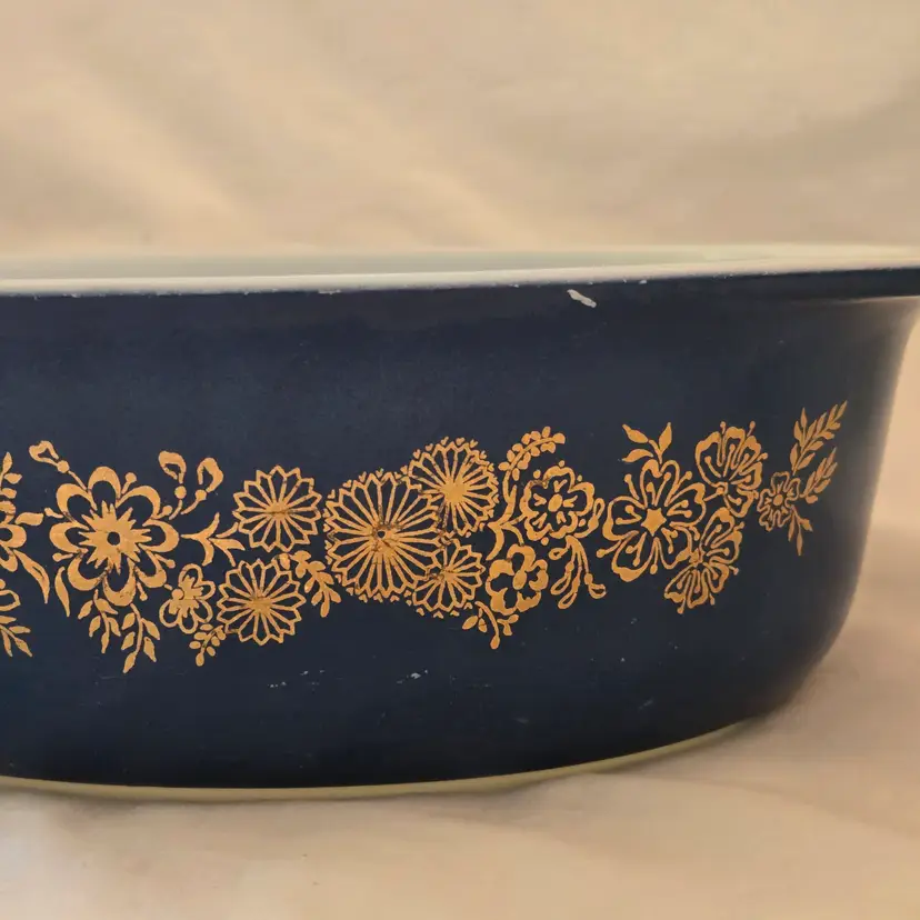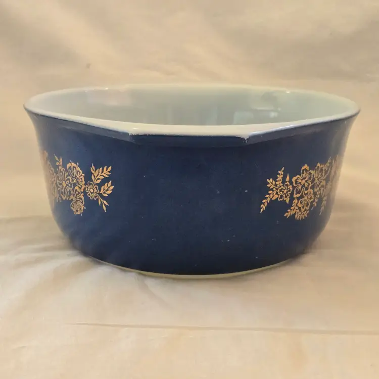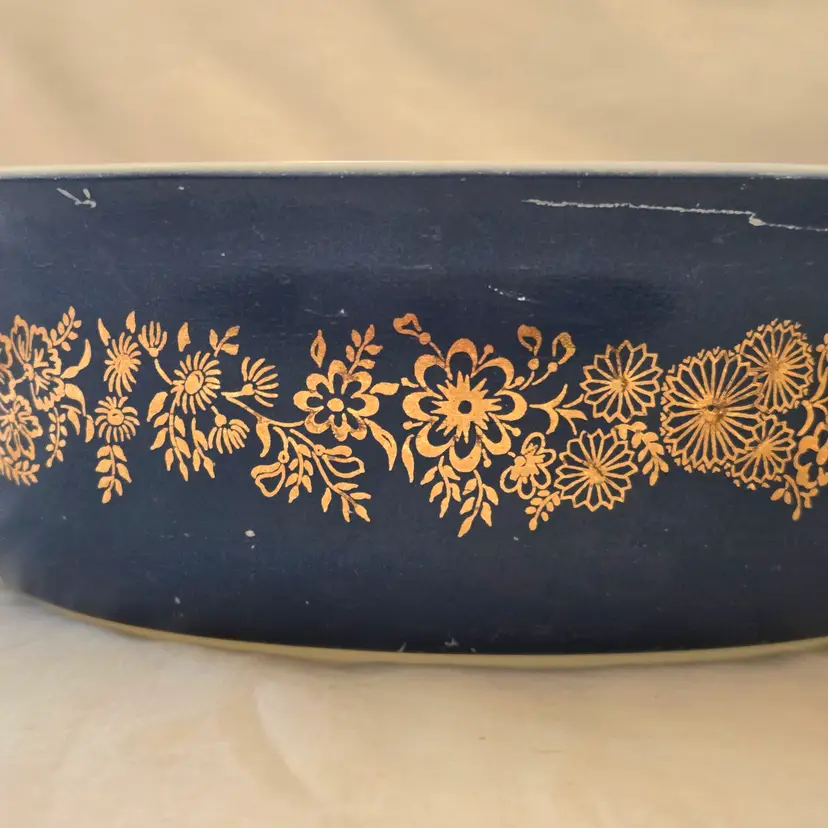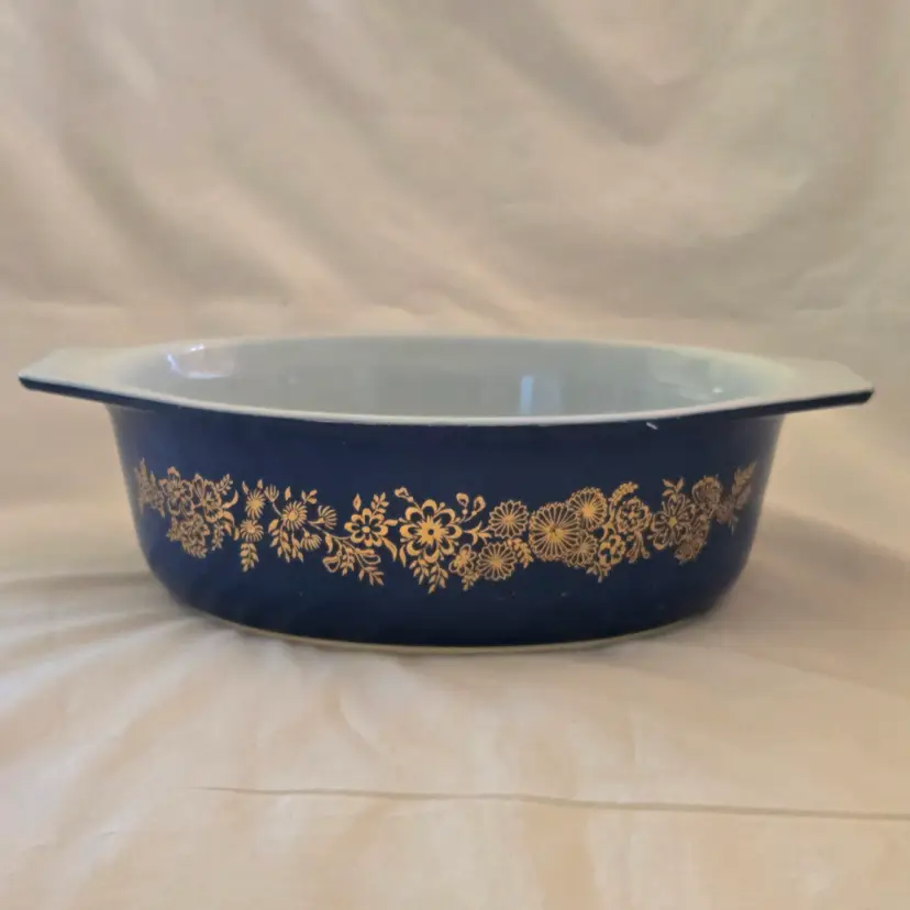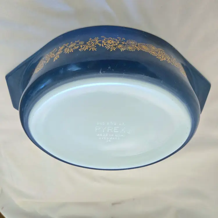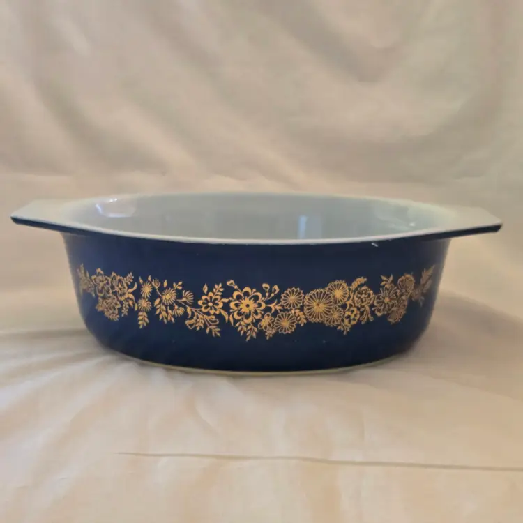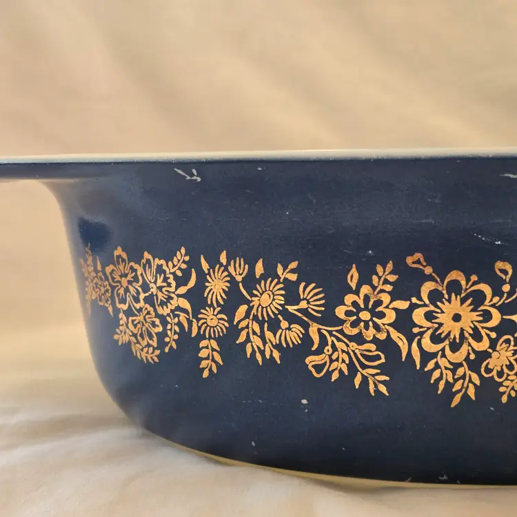 PYREX Golden Bouquet #043 Oval 1½Qt Casserole DISH ONLY NO LID Promo Blue Gold with Condition Issues Vintage. Used condition with numerous scratches in the color and a bit of dirt. Please view all the photos and please ask any questions prior to purchase when possible. NOTE: color rendition may differ slightly from the actual item photos to what you receive due to lighting conditions.