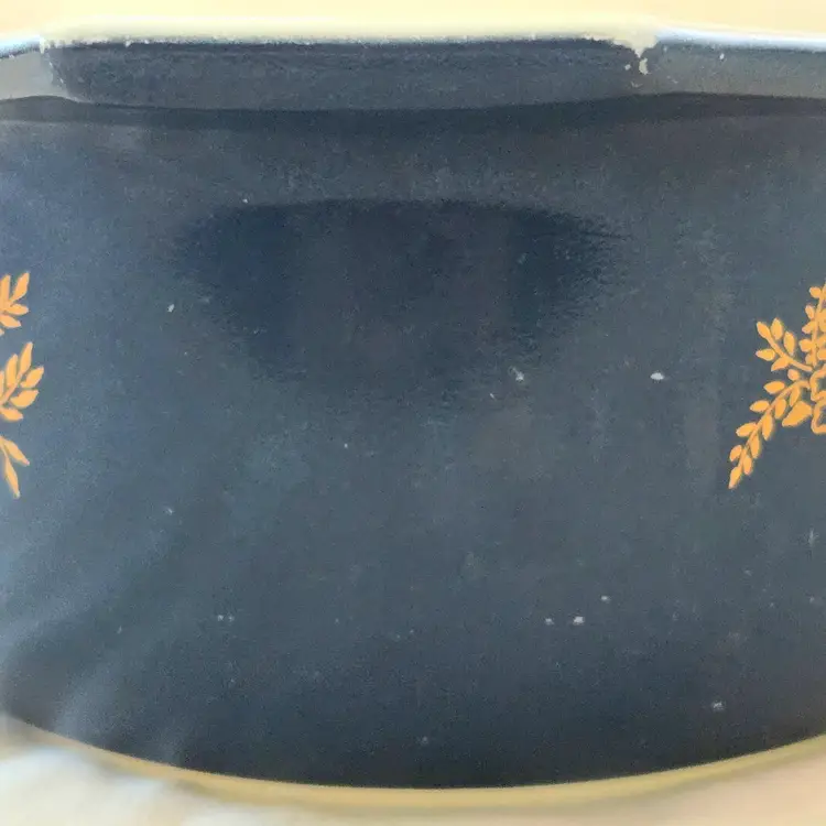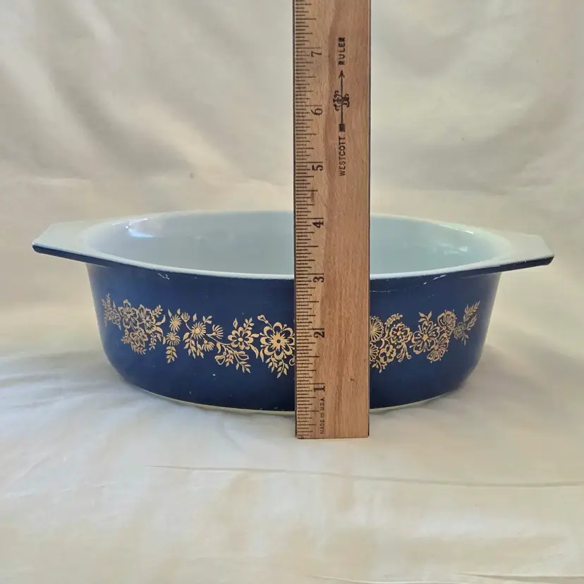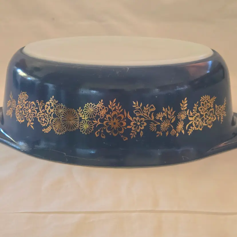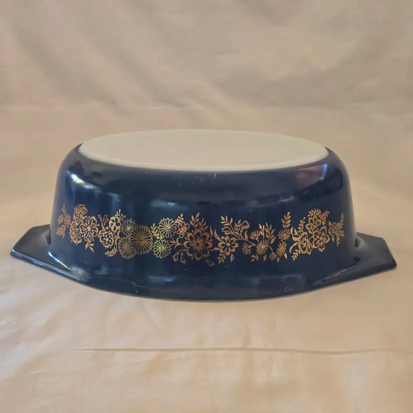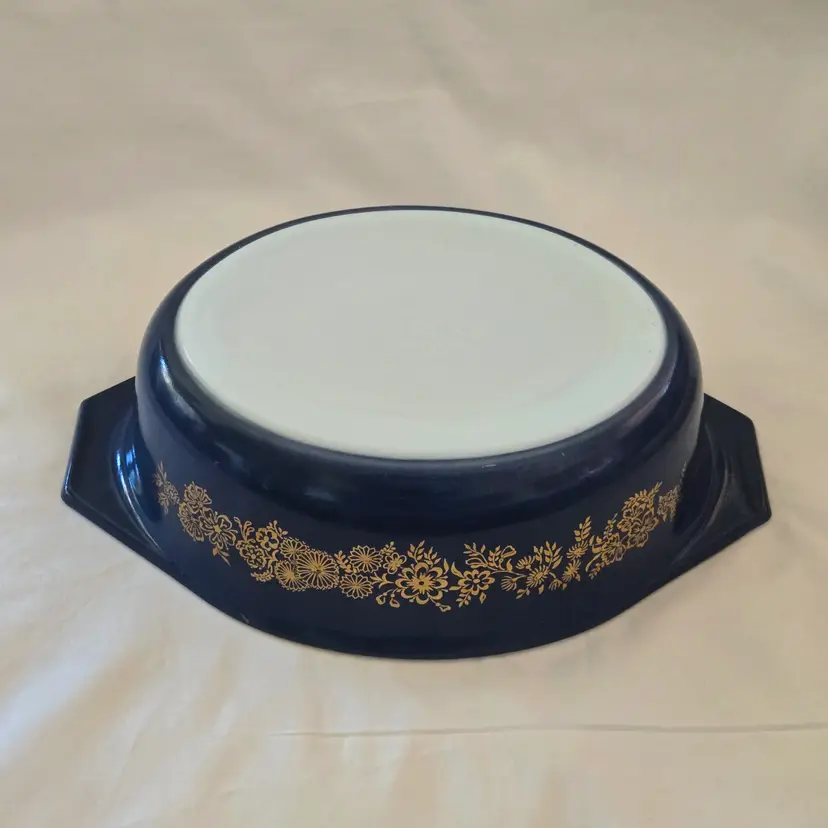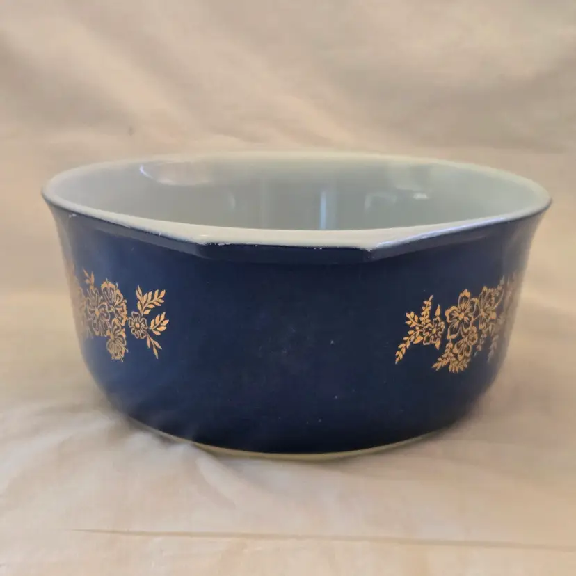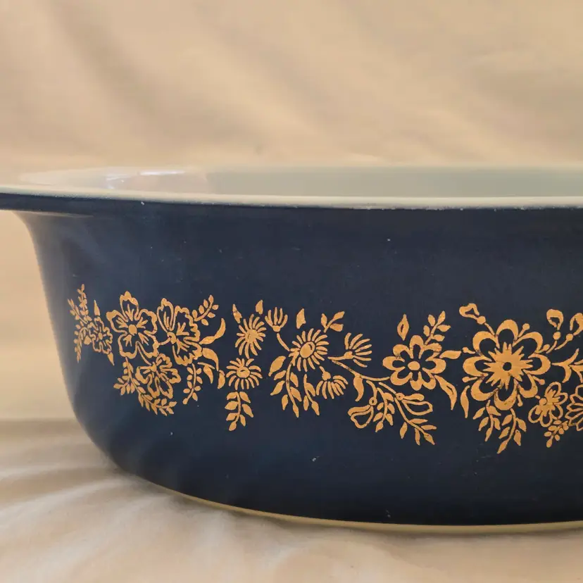 PYREX Golden Bouquet #043 Oval 1½Qt Casserole DISH ONLY NO LID Promo Blue Gold with Condition Issues Vintage. Used condition with numerous scratches in the color and a bit of dirt. Please view all the photos and please ask any questions prior to purchase when possible. NOTE: color rendition may differ slightly from the actual item photos to what you receive due to lighting conditions.