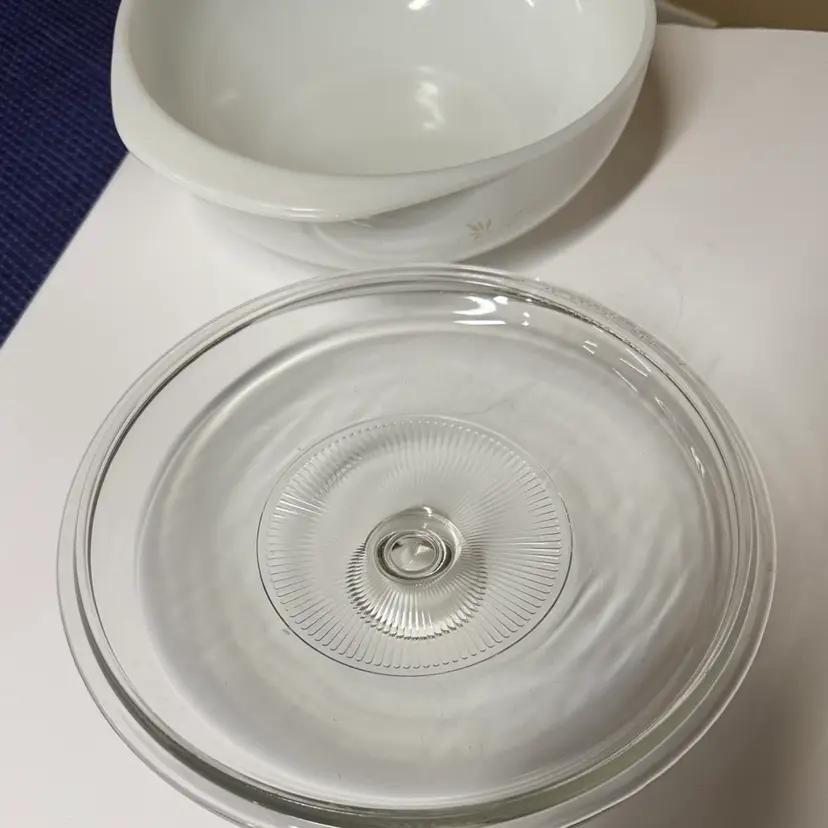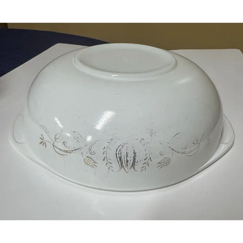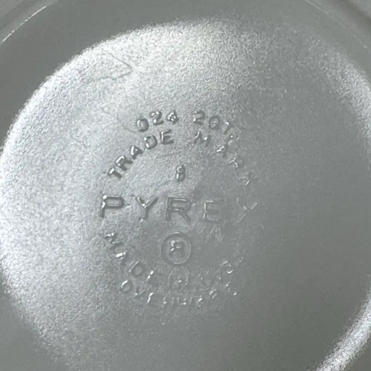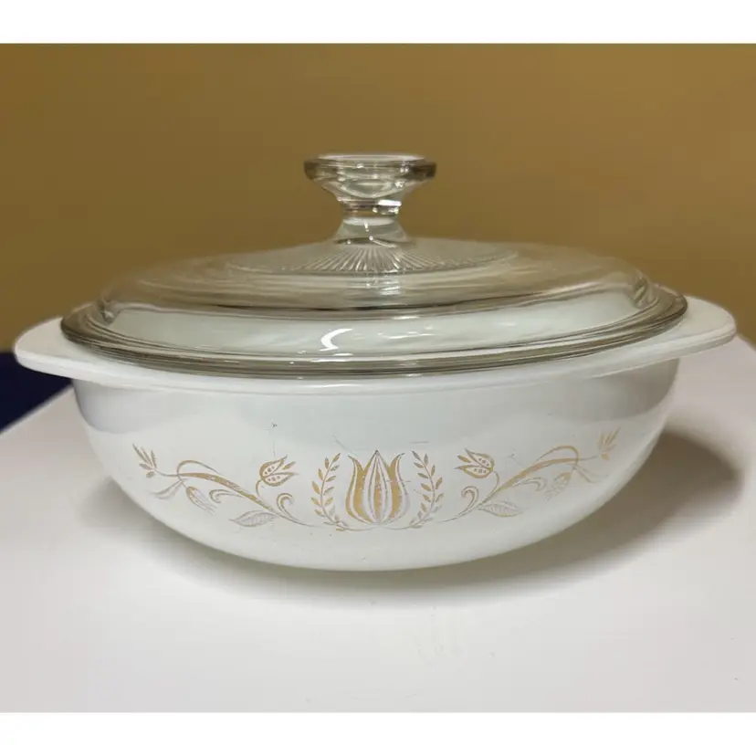 Clear glass with embossed Pyrex branding. Ideal for kitchen use. Vintage Pyrex Golden Tulip Casserole & Lid 2 Qt 024 Promotional Casserole 10” across at the handles 8.75 diameter 3” tall Both pieces are in excellent condition the dish has fading on the design more on one side, the lid has a tiny bit of rough edge on the inside edge. (13912926a)