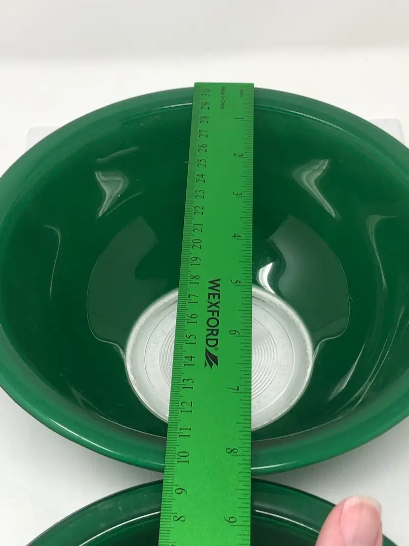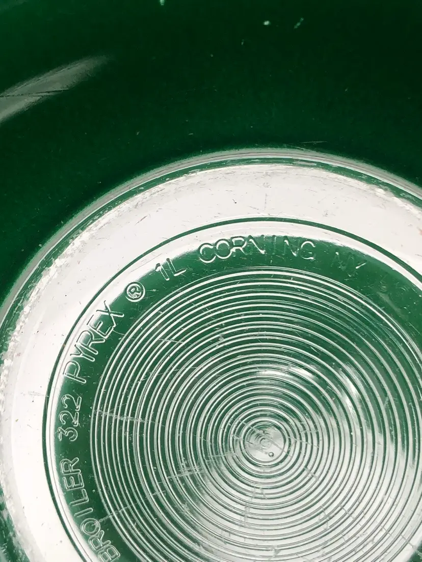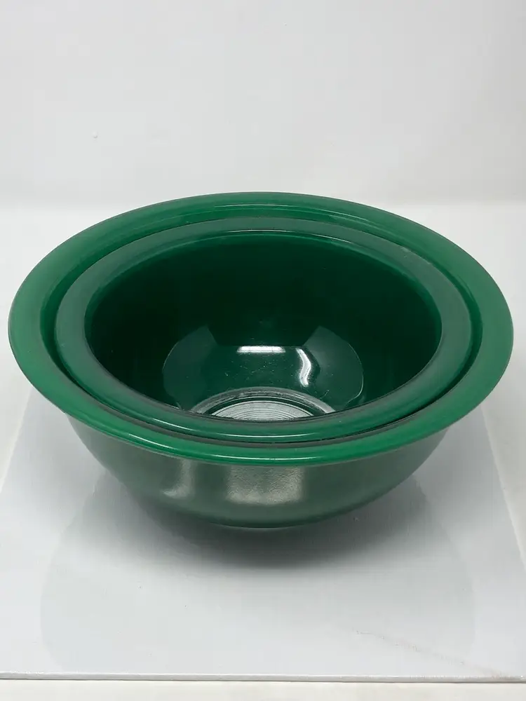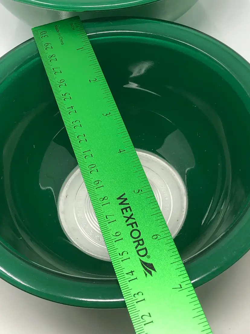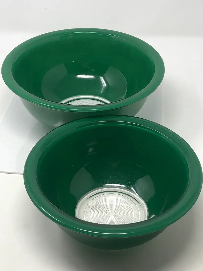1.5 Liter and 1 Liter green glass mixing bowls from Pyrex. Oven and microwave safe. Some scratches in the paint as shown in photos. No chips or cracks.