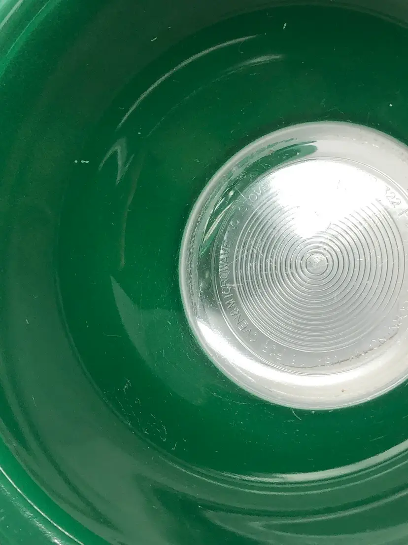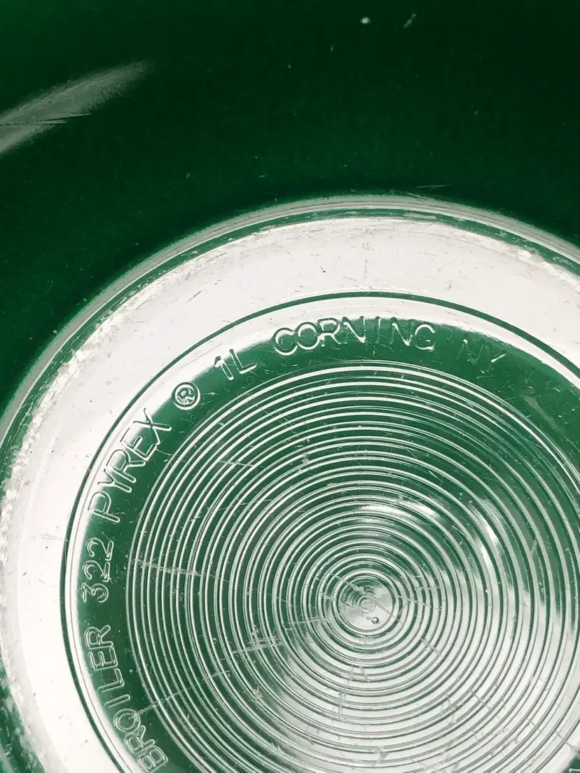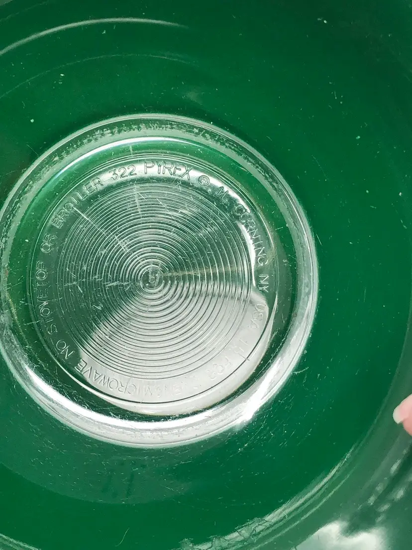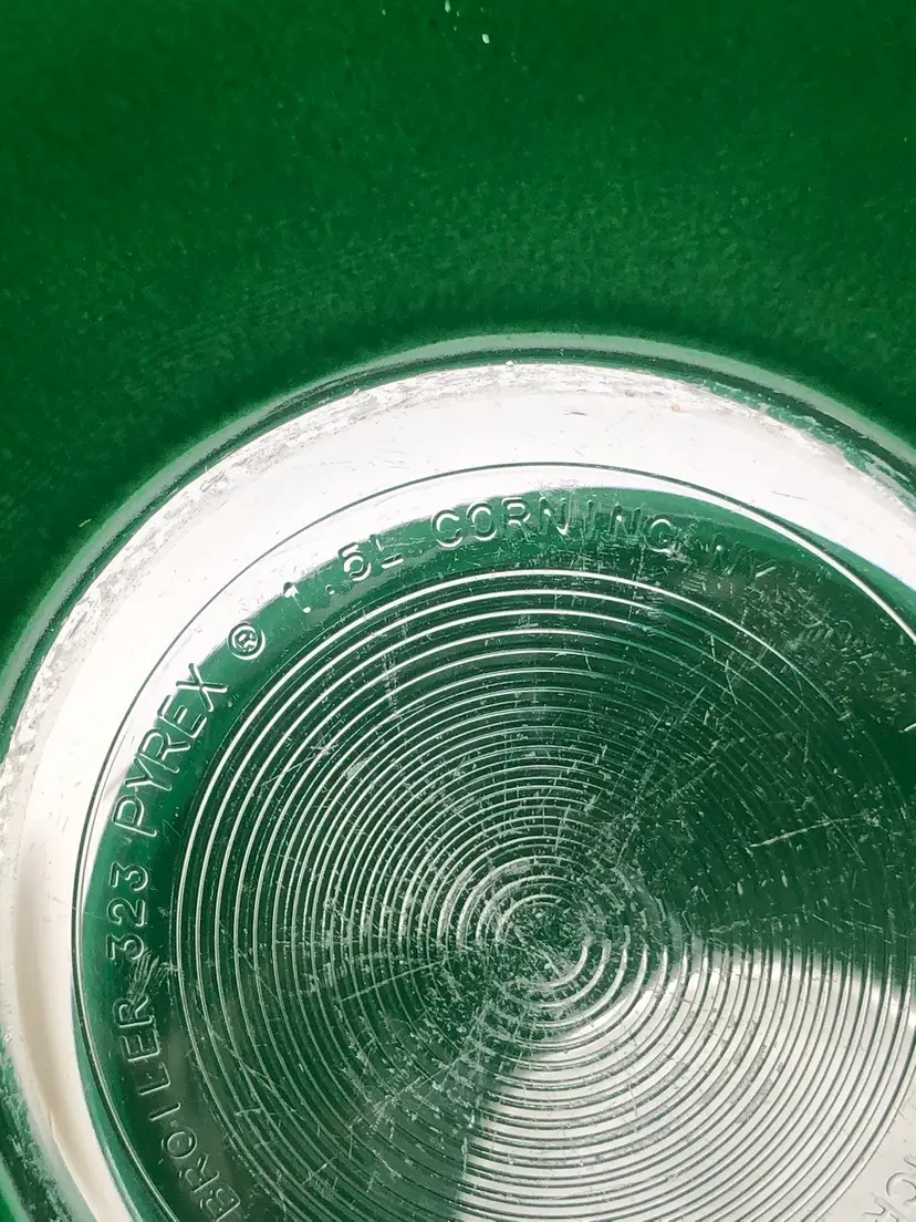 1.5 Liter and 1 Liter green glass mixing bowls from Pyrex. Oven and microwave safe. Some scratches in the paint as shown in photos. No chips or cracks.