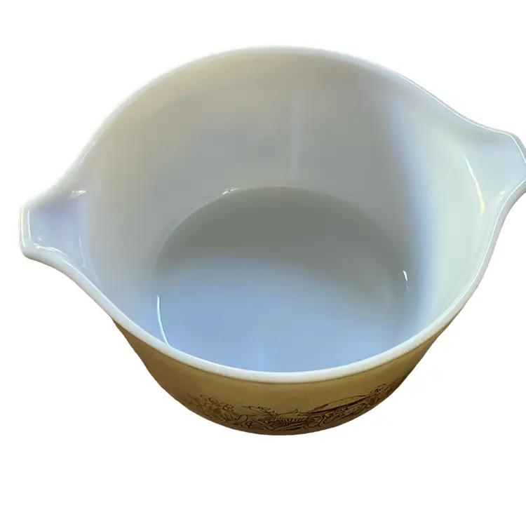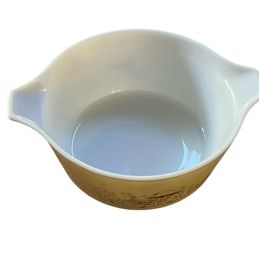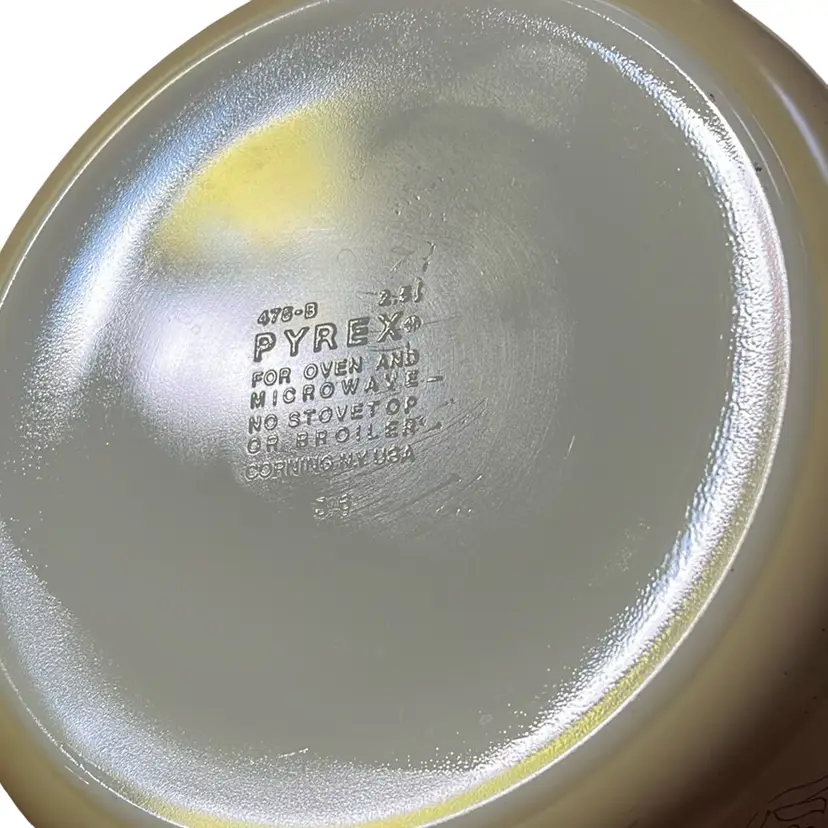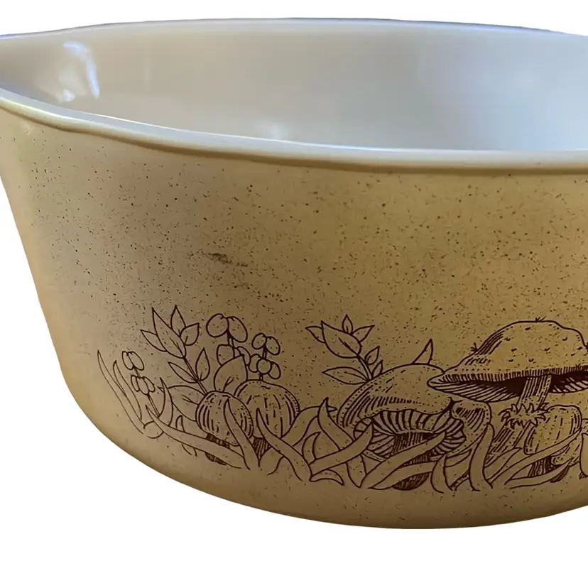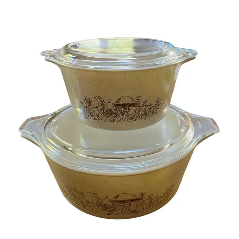 Great vintage Pyrex casseroles with lids, from the 80’s, in the Mushroom Brown Beige Forest Fancies pattern. Cinderella Round Casseroles 475-B is 2.5 qt and the 473-B is 1 qt. Graphics in good condition, there is some haziness to the glass lids that I was unable to capture in pictures, the larger casserole has one small area of discoloration above the mushroom graphic on one side - see 3rd picture. No chips or cracks. Good vintage condition.
