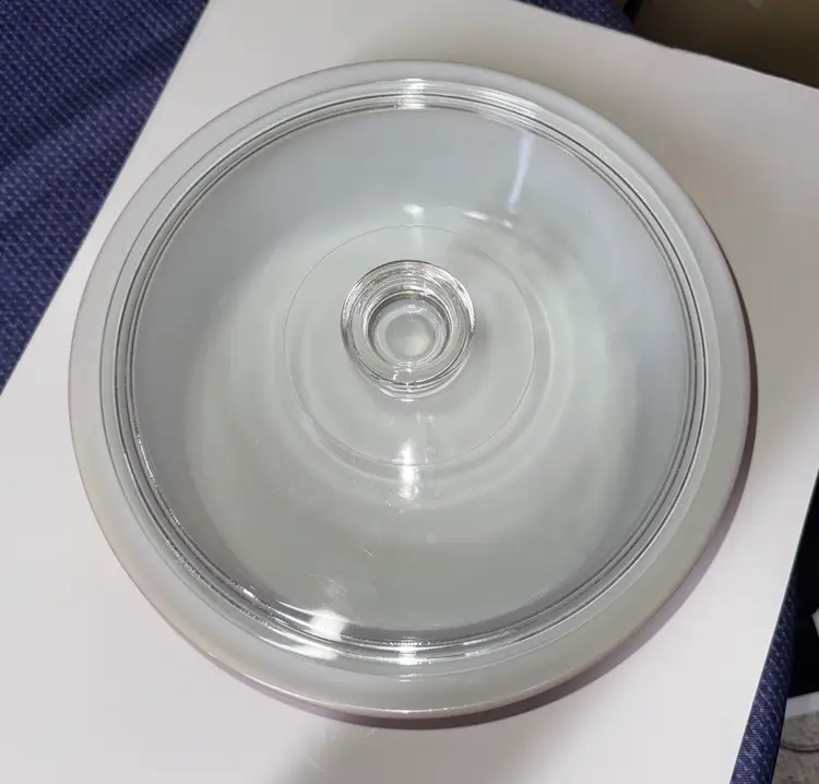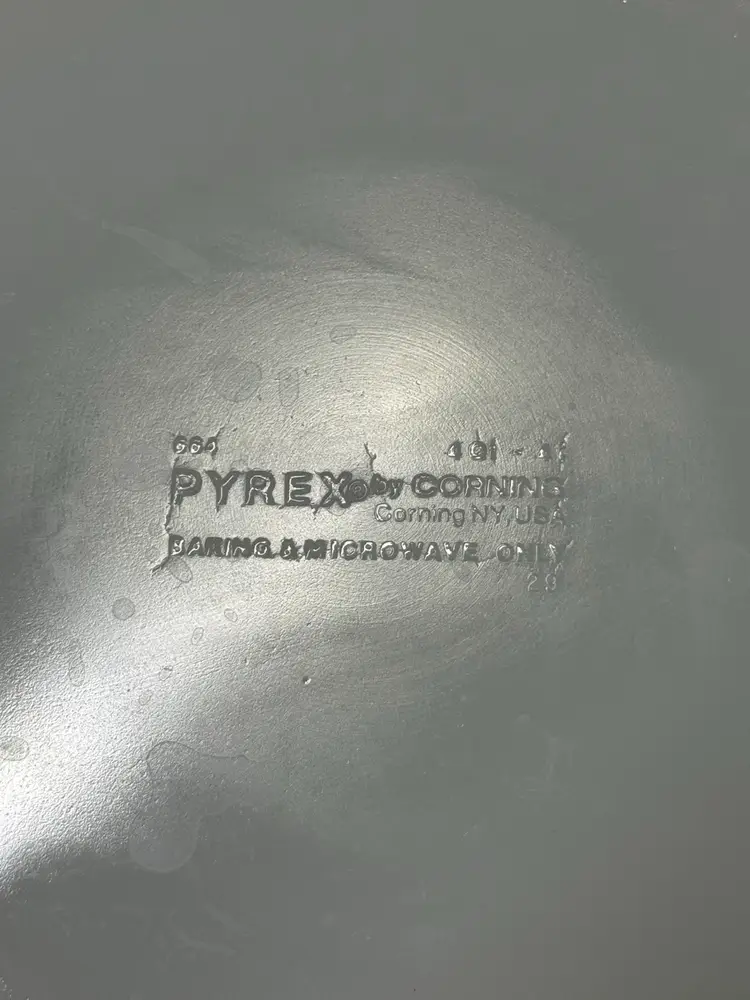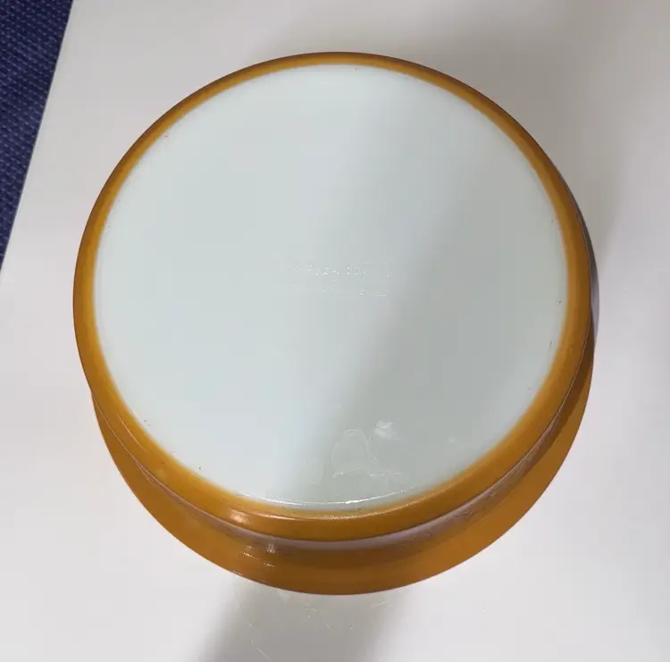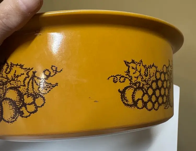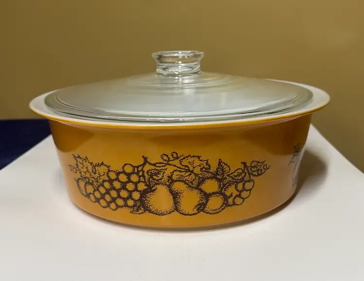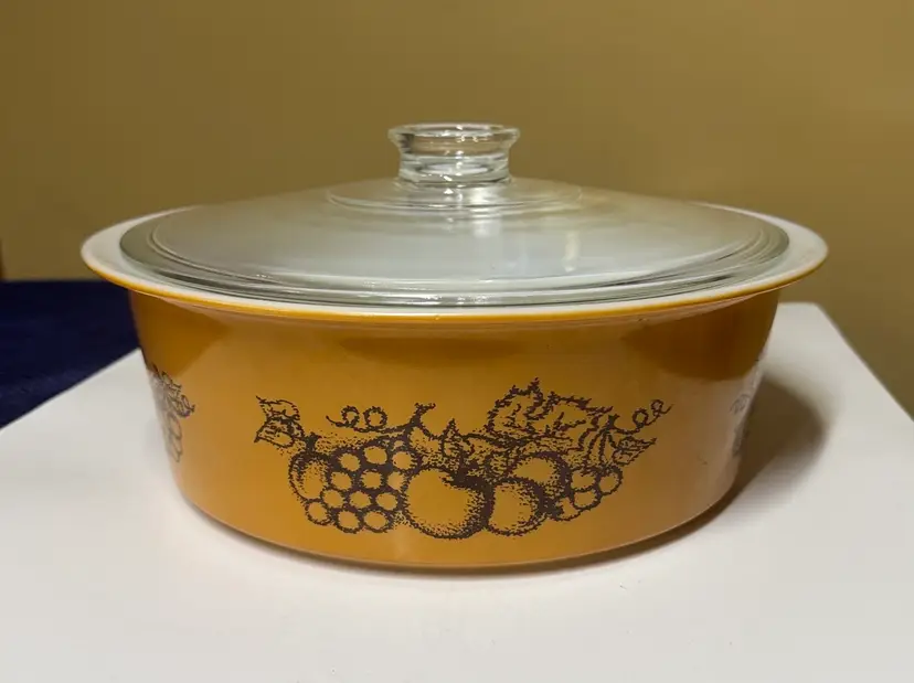 Durable Pyrex glassware featuring an embossed logo. Ideal for baking and microwaving. VINTAGE PYREX OLD ORCHARD BIG BERTHA 4-QUART CASSEROLE WITH LID 664 The dish is made of milk glass with a gold/amber exterior and a fruit pattern (grapes, apples, pears, etc.) on the sides. It measures approximately 10 inches across the bowl and 11.5 inches across the rim. Excellent condition with no breaks or chips I found one scratch outside (pictured) and some but not a lot inside. (1412126a)