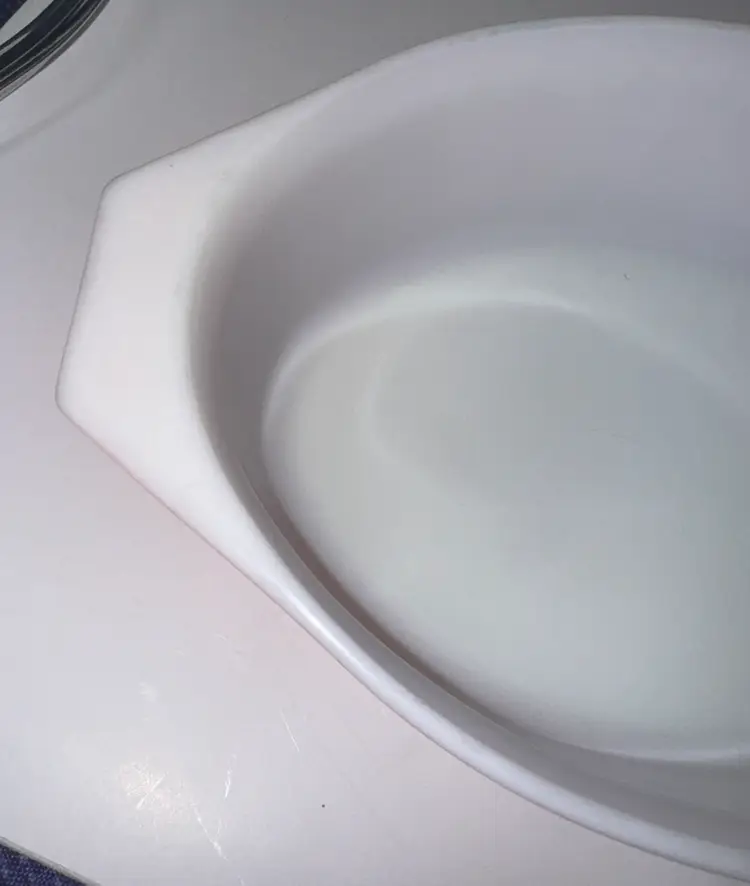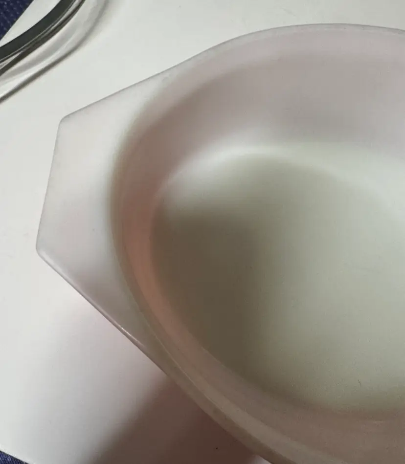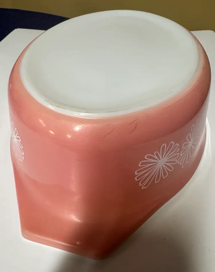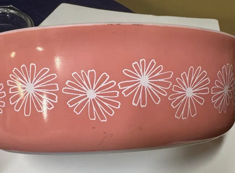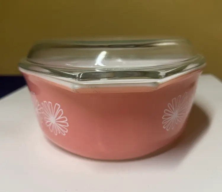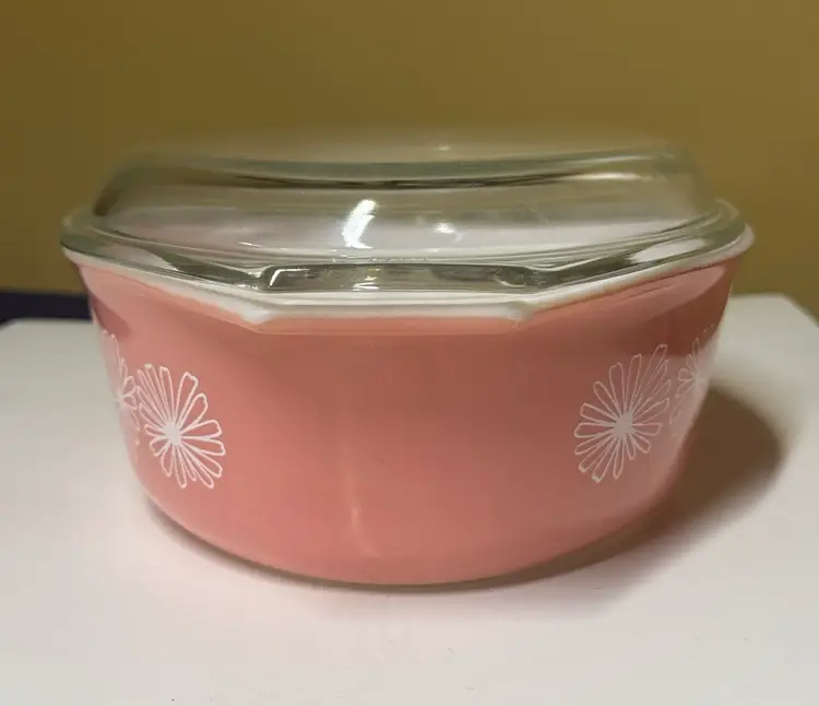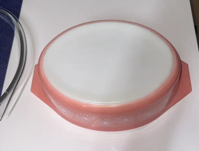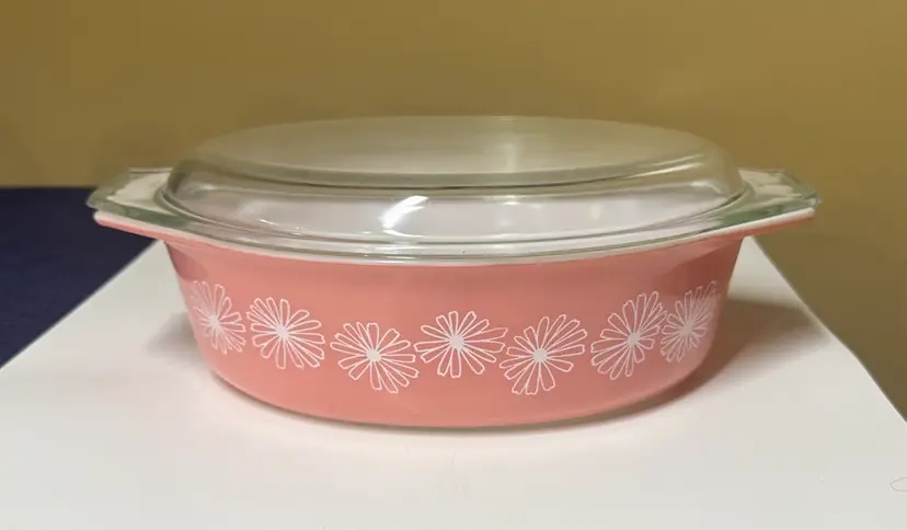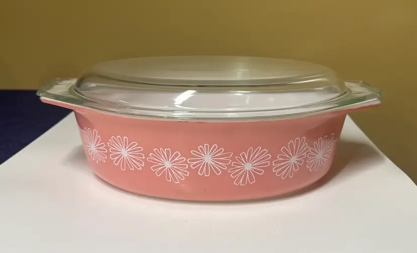 Brighten your kitchen with this Pyrex pink casserole dish. Features a charming daisy pattern. Includes a clear lid for convenience. PYREX Pink Daisy 2 1/2 Qt Oval Casserole Dish w/ Lid • Rare • Vintage 045 12.75” across at handles by 8.5” 3.5” deep Excellent condition with no breaks or chips there are some use spots but not a lot. (14113126a)