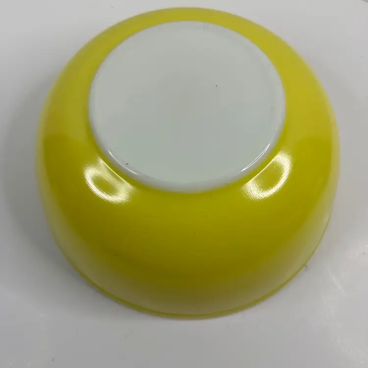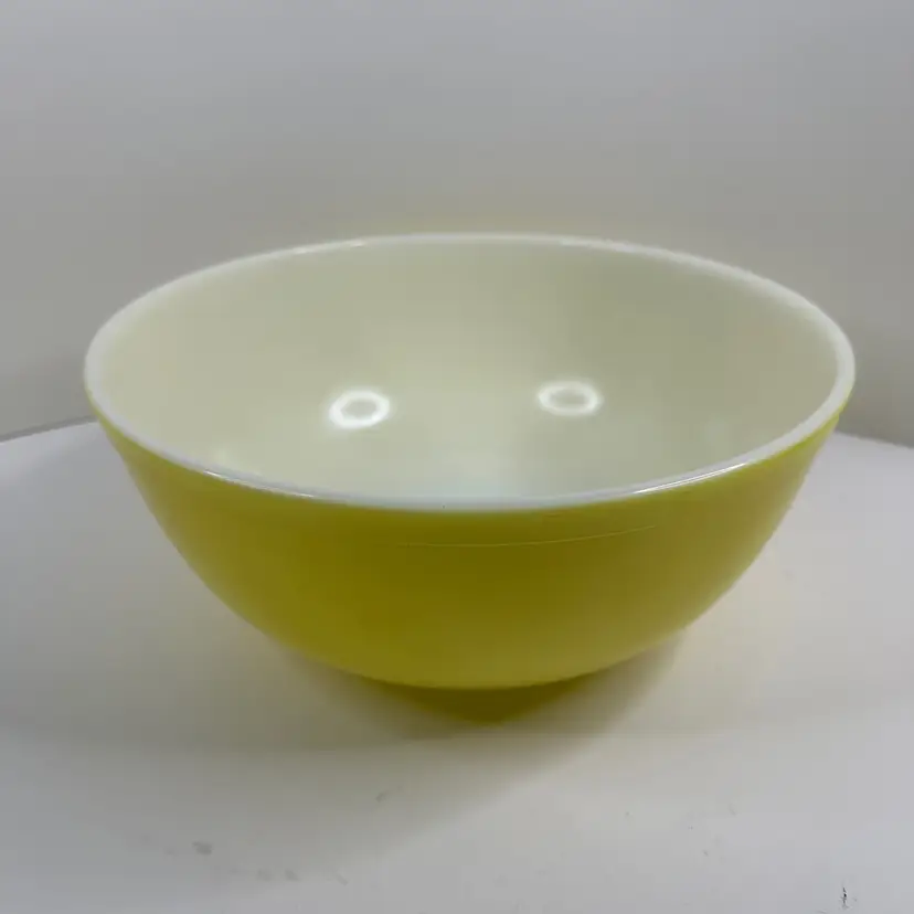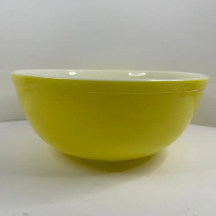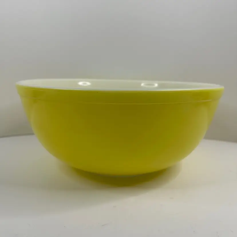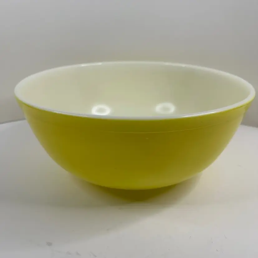 Vintage 1940s Pyrex Primary Colors Yellow Nesting Mixing Bowl 4 quart #404 in good preowned condition. The bowl has a diameter of approximately 10” and stands 4” tall. Bowl has no chips or cracks but is does have tiny spots of missing color and some scratches in the finish. Bowl is not dishwasher dead. Please see photos for all the details.