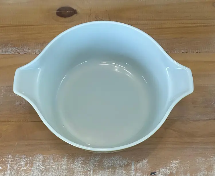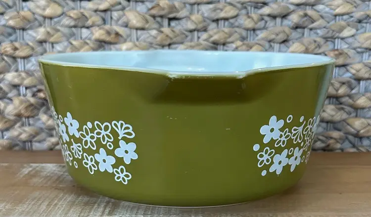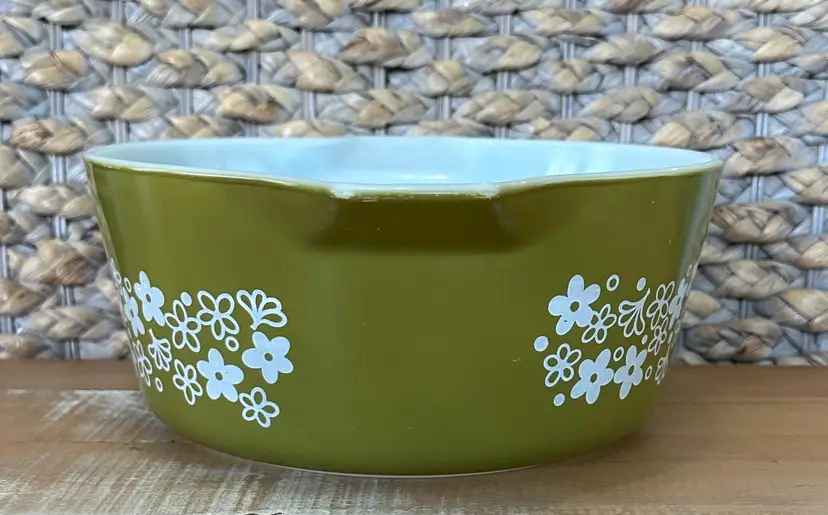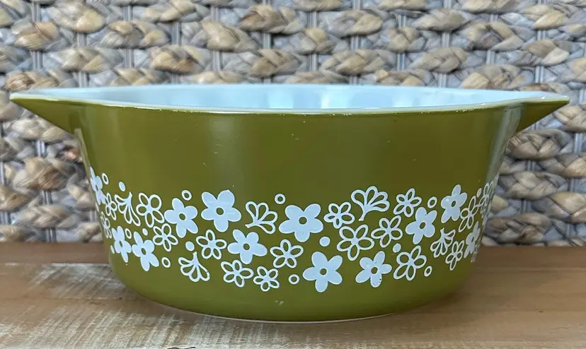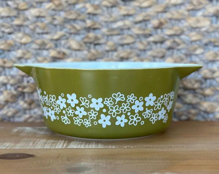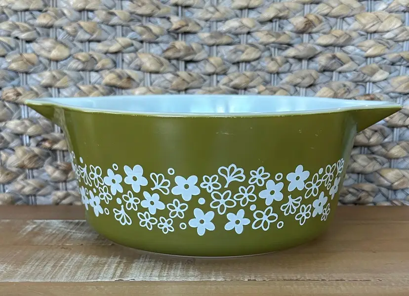 Add a touch of retro charm to your kitchen with this vintage Pyrex casserole dish. Featuring a lovely green color with a white daisy pattern, it's perfect for baking or serving. A must-have for any Pyrex collector. Please note that this does not have a lid. W: 10.75" D: 8.75" H: 3.75"