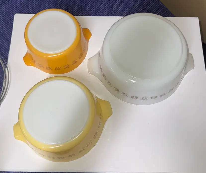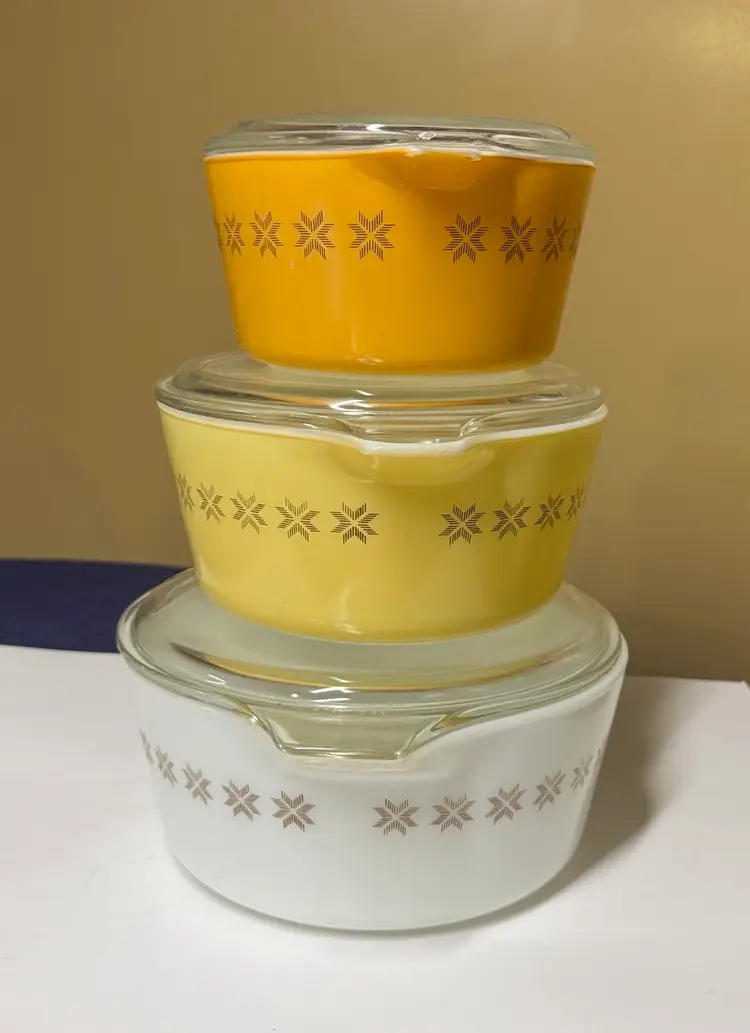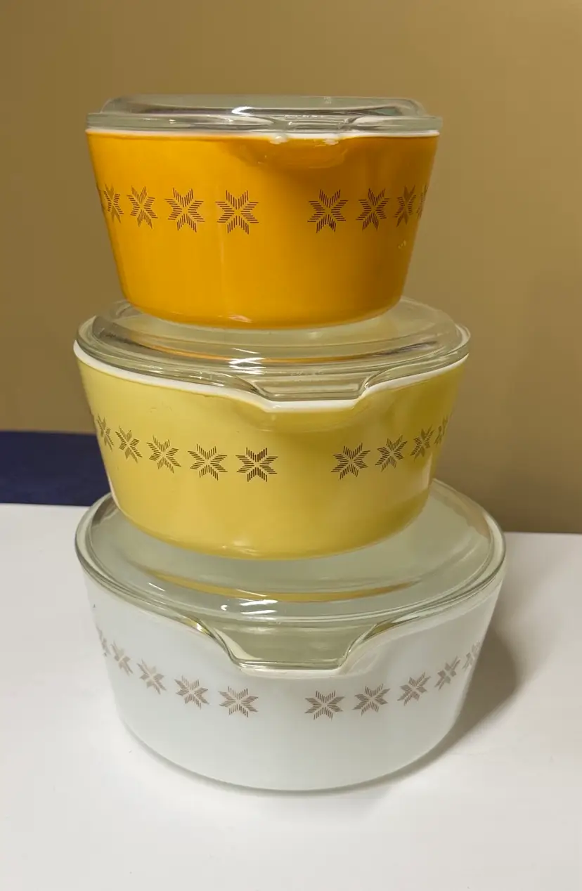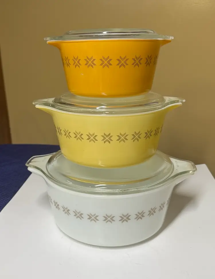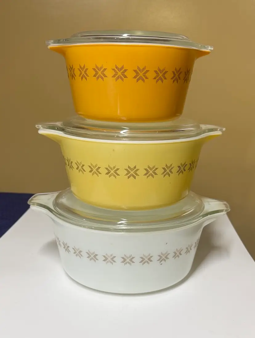 Charming Pyrex casserole dishes with starburst design. Includes orange, yellow, and white dishes. Perfect for baking and serving. Vintage Pyrex Town & Country 473, 474 & 475 Casserole Dishes set all with Lids The set includes three different sizes, typically numbered 475 (2 1/2 qt), 474 (1 1/2 qt), and 473 (1 qt). They feature the "Cross Stitch Star" pattern and were produced in the 1960s, starting in 1963. The dishes are made from opalware glass and were designed for baking, serving, and storage. The color scheme for this set includes orange, yellow, and white dishes. All of the dishes are in excellent condition with no breaks or chips with some minor use scratches. The lids all work but each one has a chip on the inside rim. (142212620)