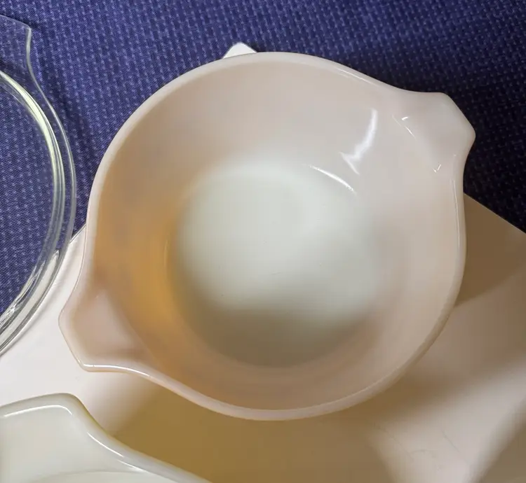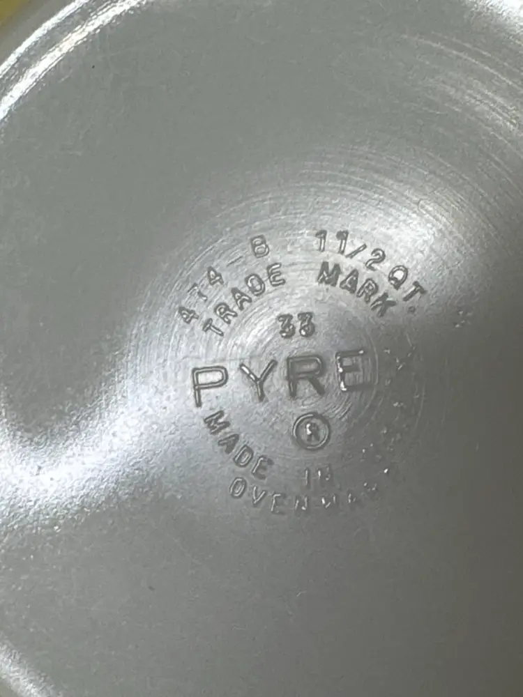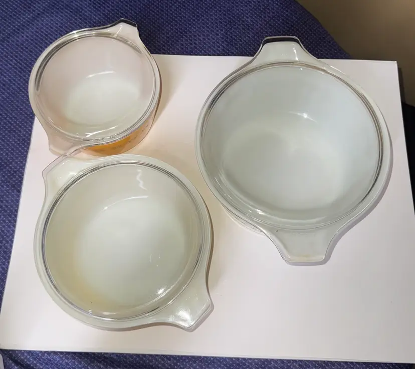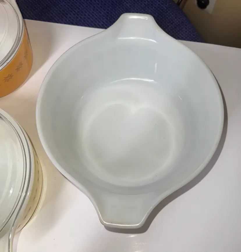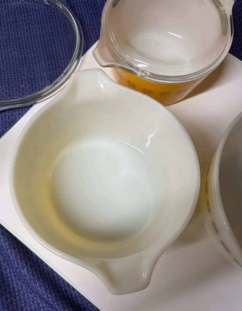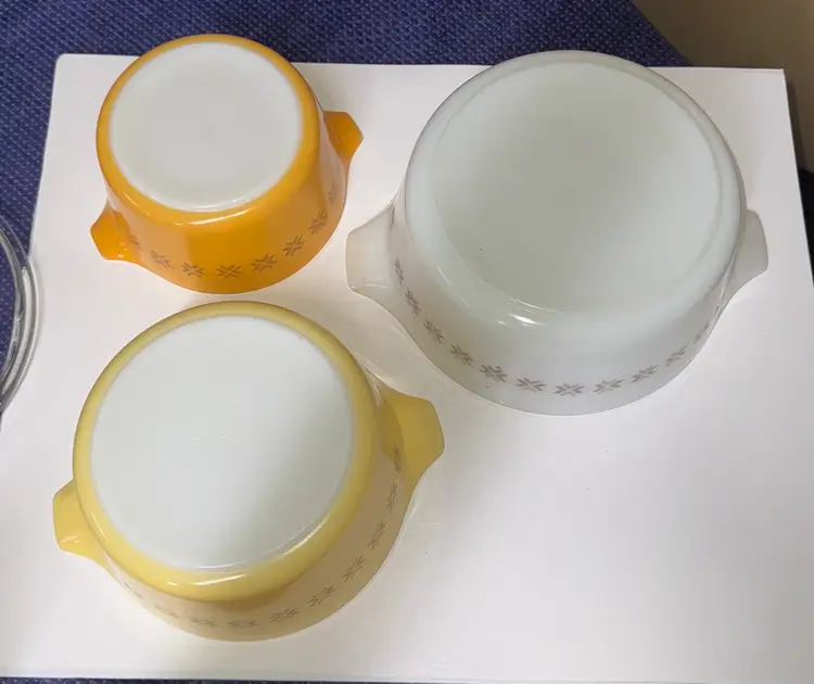 Charming Pyrex casserole dishes with starburst design. Includes orange, yellow, and white dishes. Perfect for baking and serving. Vintage Pyrex Town & Country 473, 474 & 475 Casserole Dishes set all with Lids The set includes three different sizes, typically numbered 475 (2 1/2 qt), 474 (1 1/2 qt), and 473 (1 qt). They feature the "Cross Stitch Star" pattern and were produced in the 1960s, starting in 1963. The dishes are made from opalware glass and were designed for baking, serving, and storage. The color scheme for this set includes orange, yellow, and white dishes. All of the dishes are in excellent condition with no breaks or chips with some minor use scratches. The lids all work but each one has a chip on the inside rim. (142212620)
