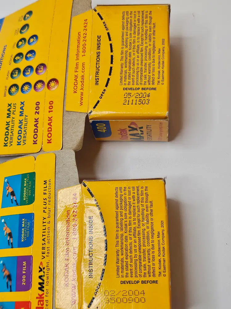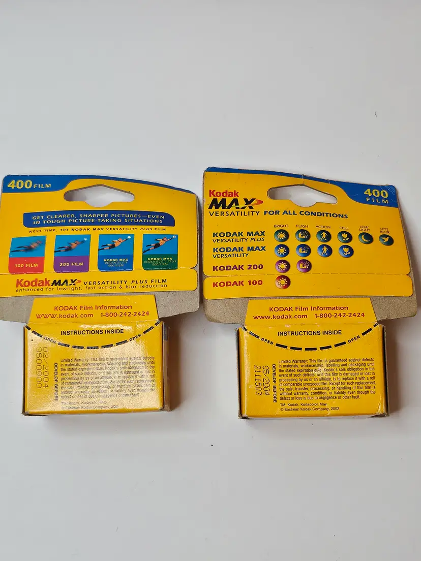 This product is a set of two new Kodak MAX Versatility 400 color films with 24 exposures each. The films are for 35mm cameras and have an expiration date of 02/2004 and 05/2004. Manufactured in the United States, these films offer a film speed of 400 ISO and are part of the Kodak Max Versatility series. Perfect for capturing vivid and detailed images, these films are an ideal choice for photography enthusiasts.