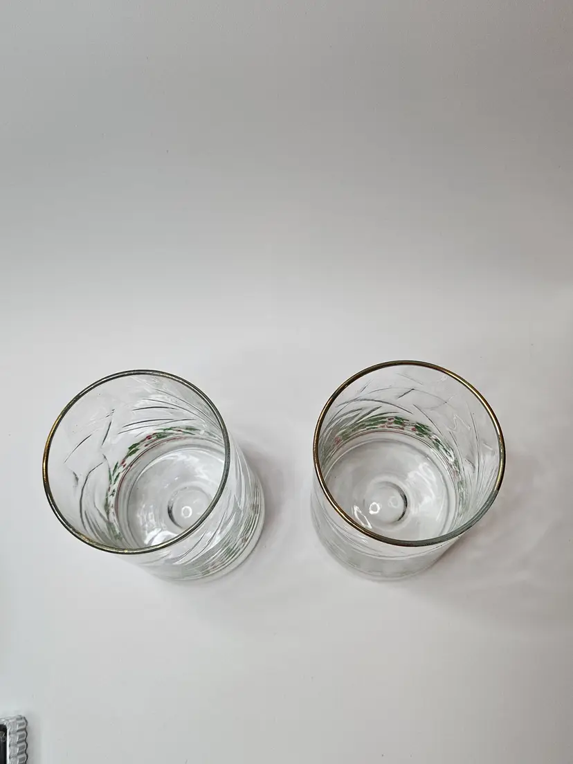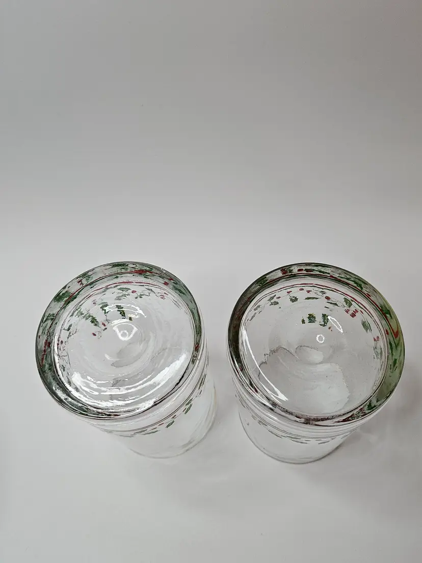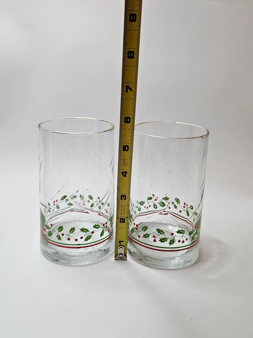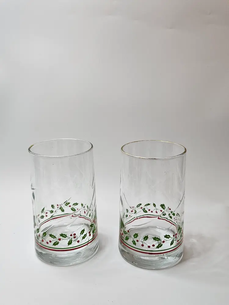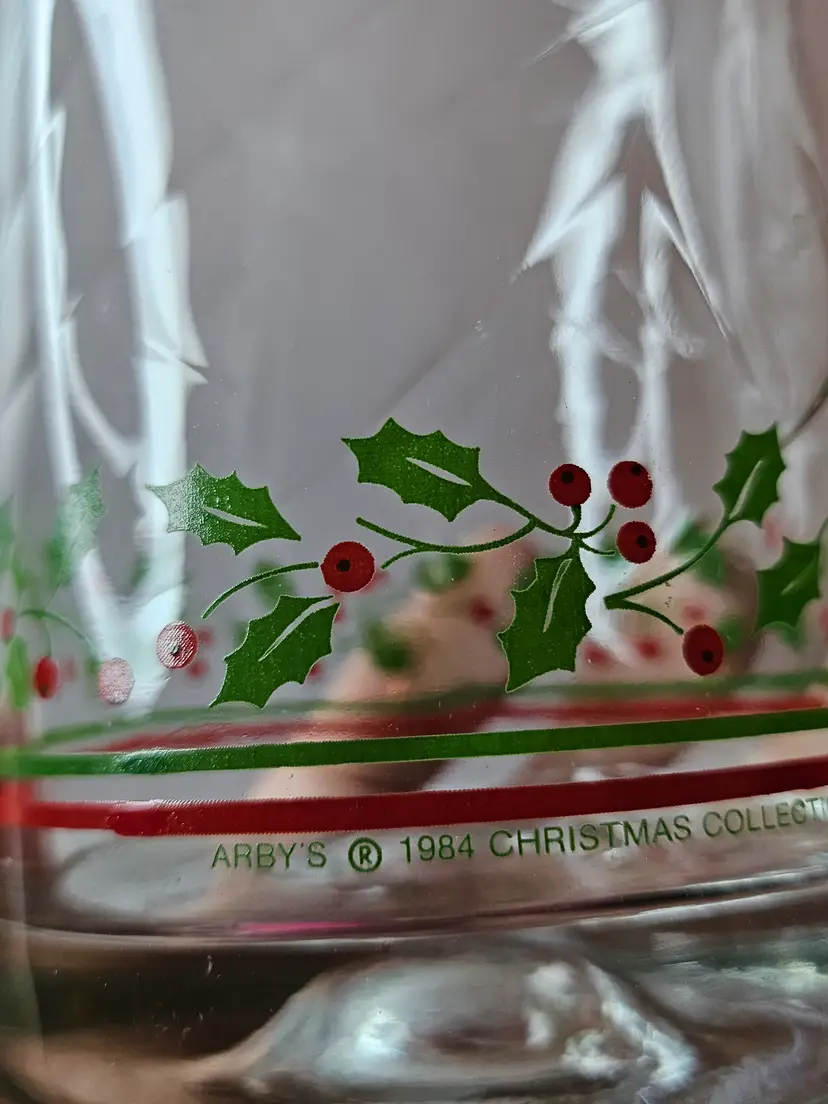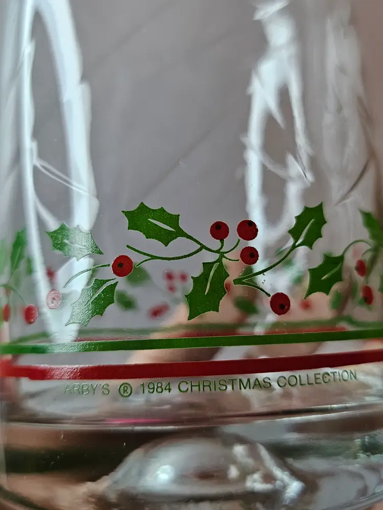 The product is a set of two vintage 1984 Arby's Christmas Holly Berry drinking glasses/tumblers. These glasses feature red and green holly berry motifs, perfect for adding a festive touch to holiday celebrations. The original glasses were made in the United States and are part of advertising merchandise from Arby's, a well-known fast-food restaurant chain.