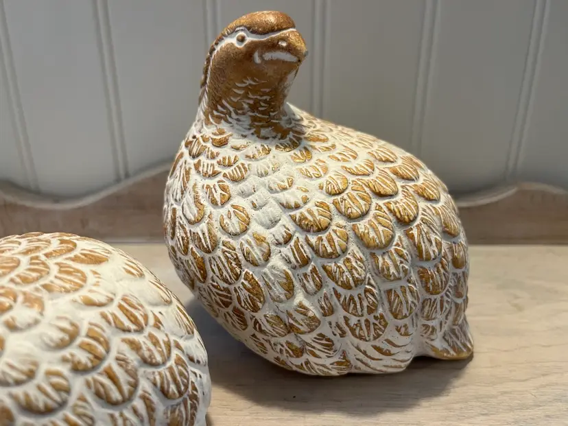 Set of two clay or resin quail figurines. They have a textured, whitewashed finish, giving them a rustic appearance.