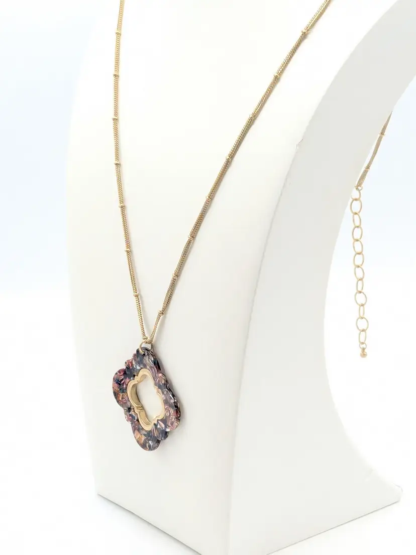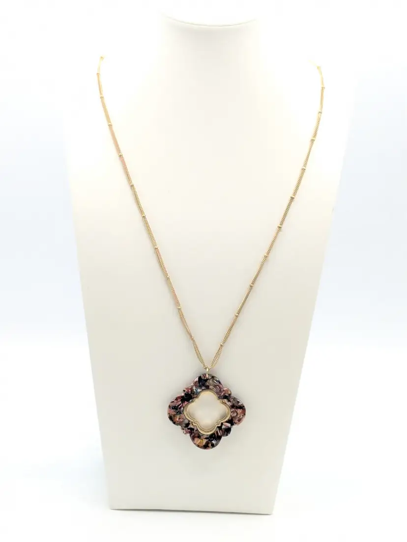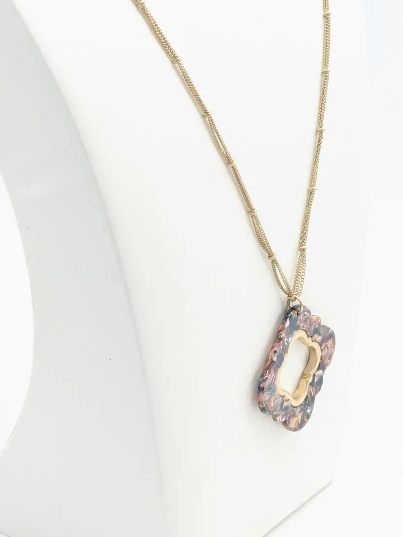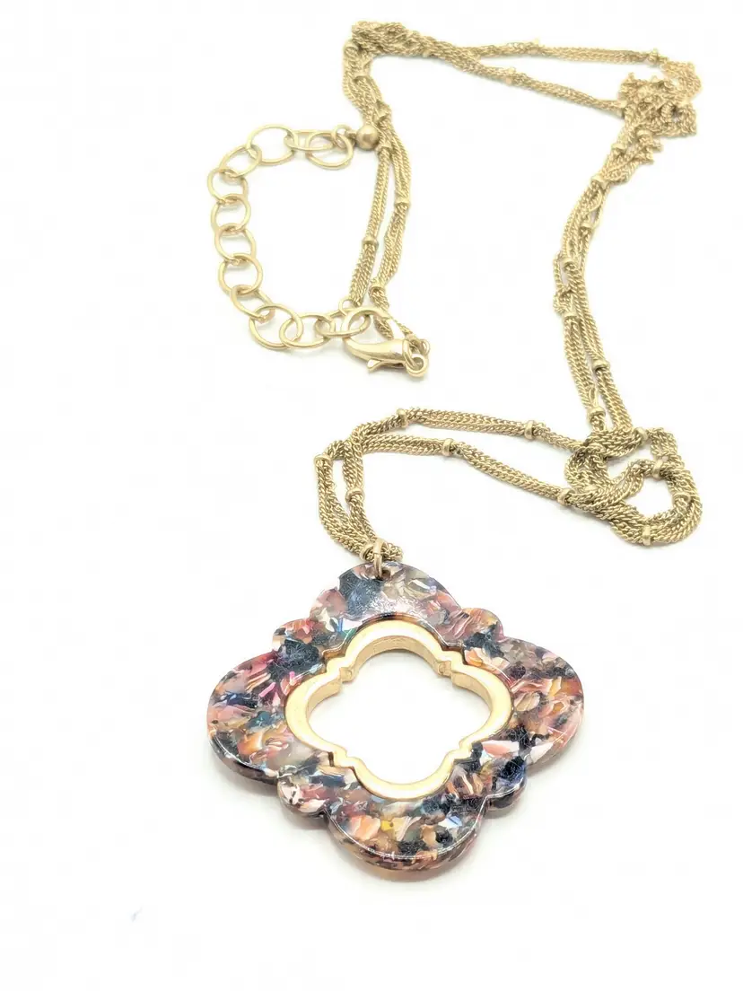 Good condition. Marble look quatrefoil pendant on a gold tone double chain. Chain measures 32" with a 3" extender. Pendant is 2" x 2". EN2