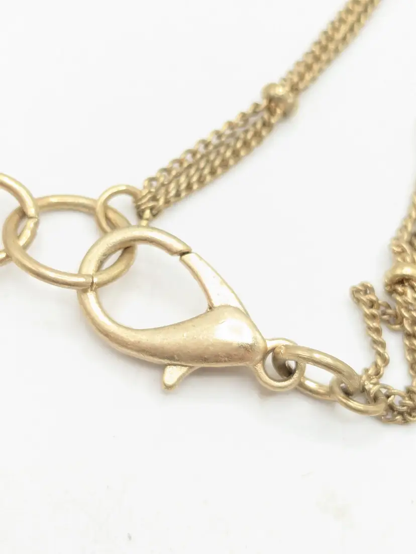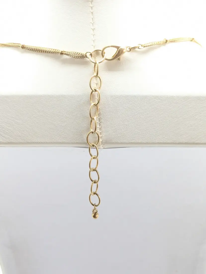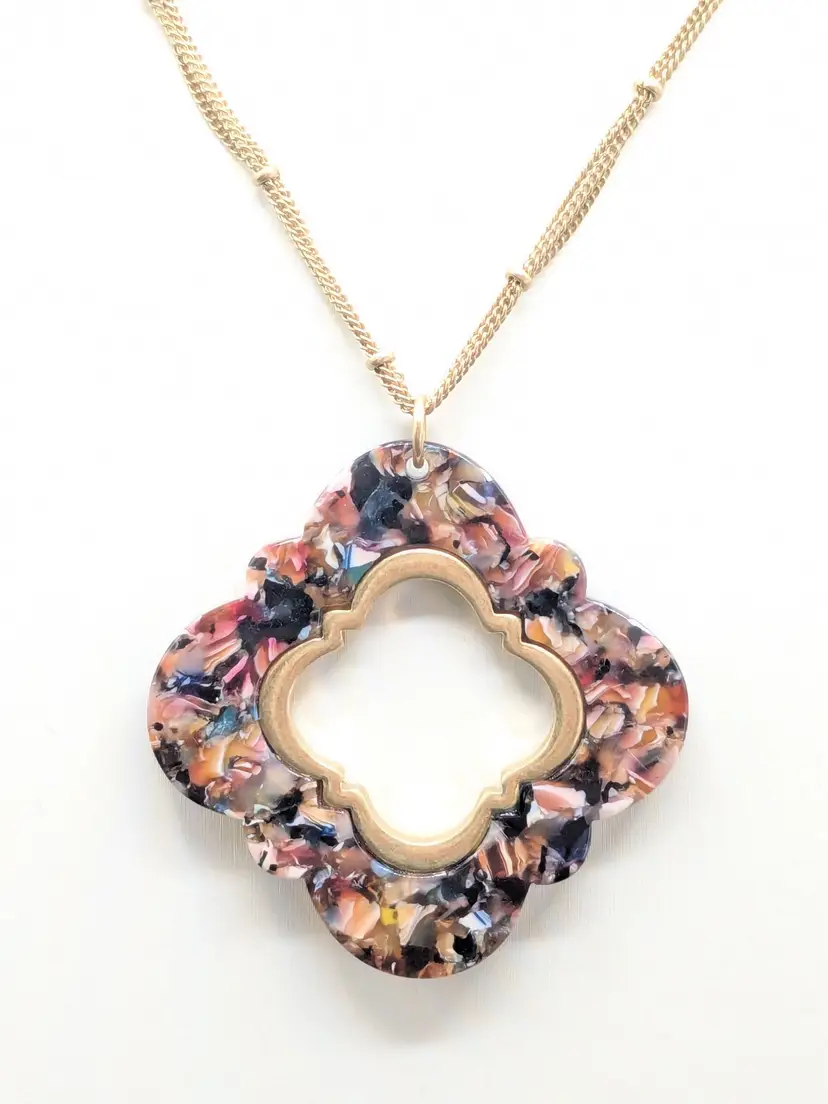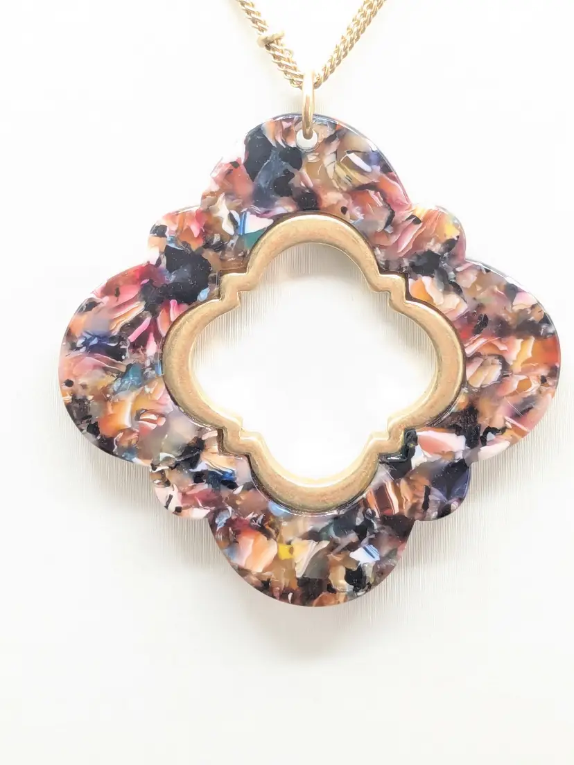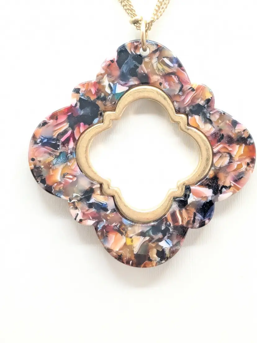 Good condition. Marble look quatrefoil pendant on a gold tone double chain. Chain measures 32" with a 3" extender. Pendant is 2" x 2". EN2