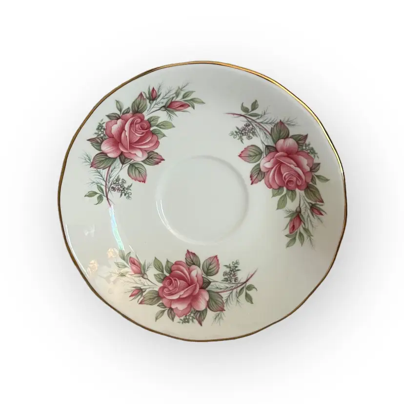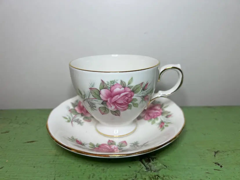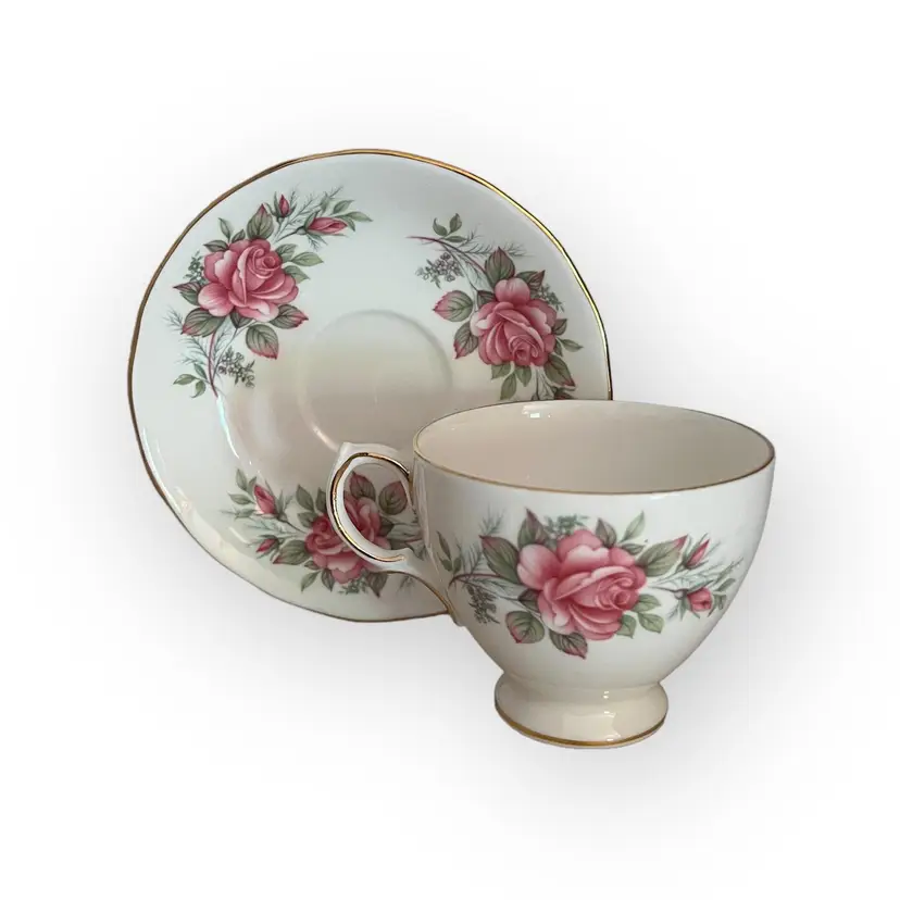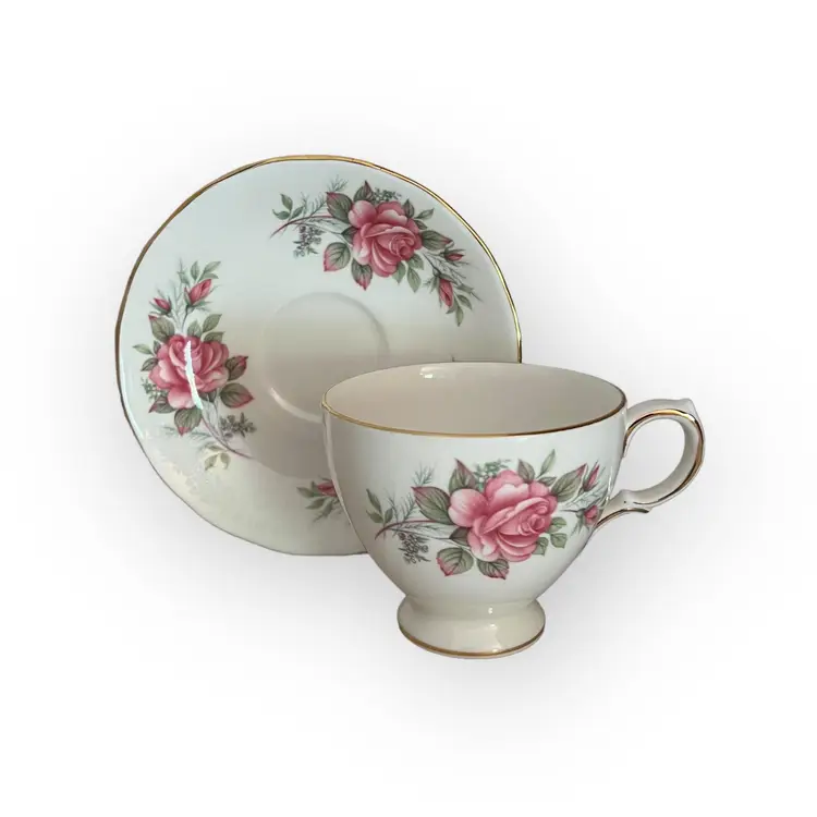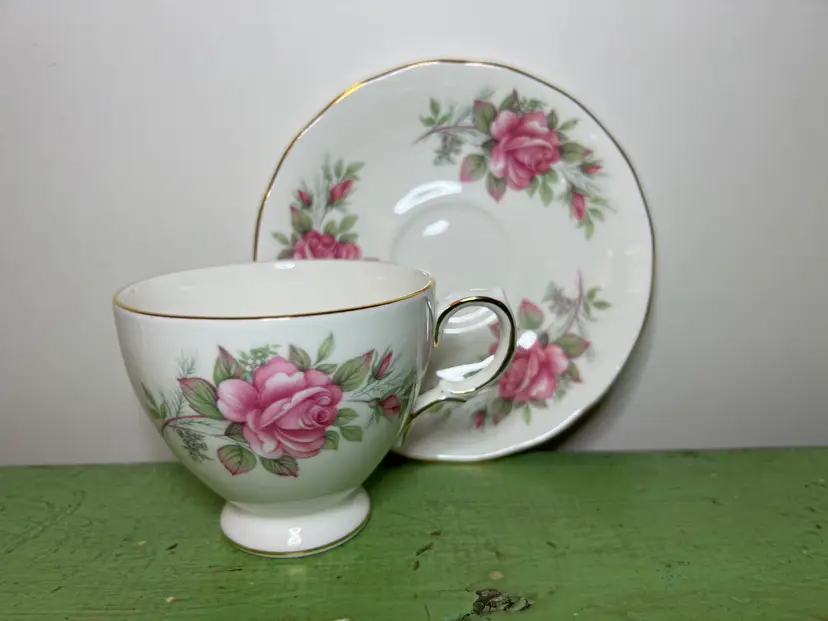 The Cup is decorated with one large pink rose and two rose buds on each side, the Saucer is decorated with three rose and bud sets, the edges are Gilt trimmed.