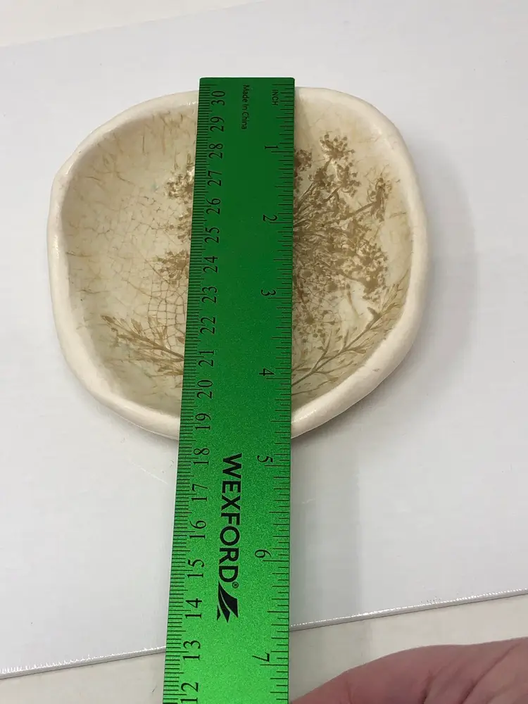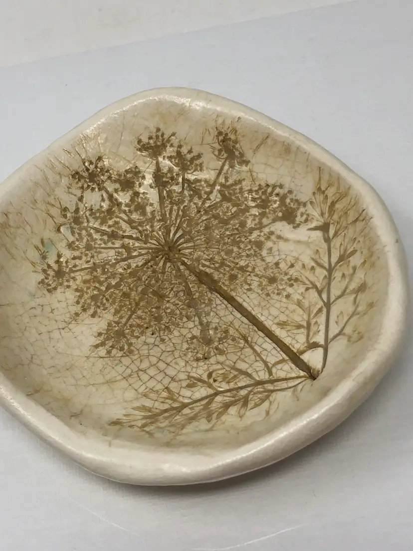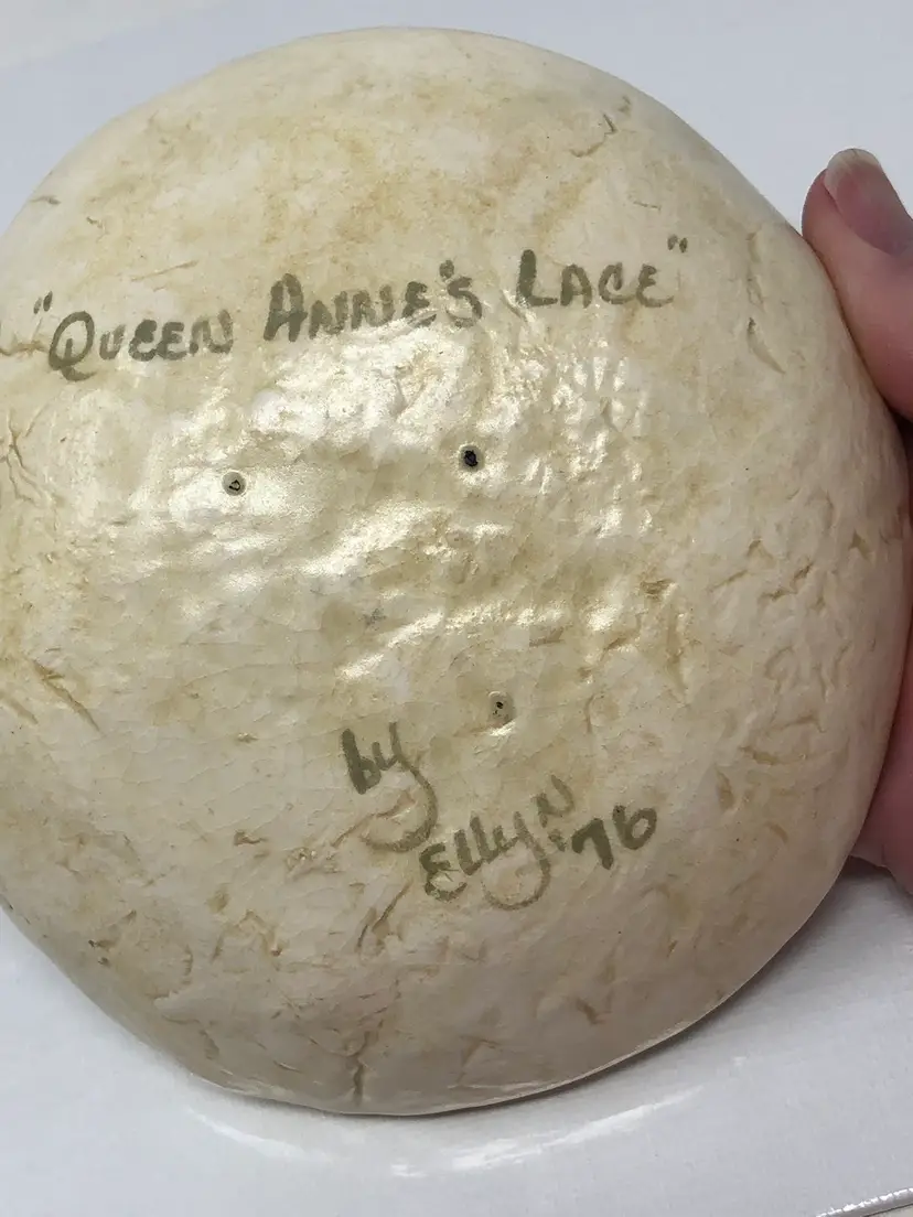 4 1/2" handmade pottery dish with pressed flower design. Signed on the back Queen Anne's Lace by Ellyn ‘76. Excellent condition.