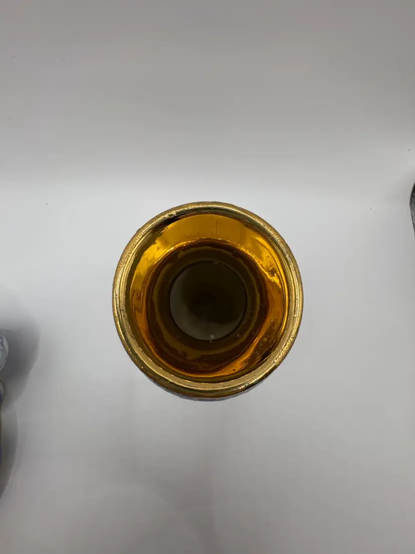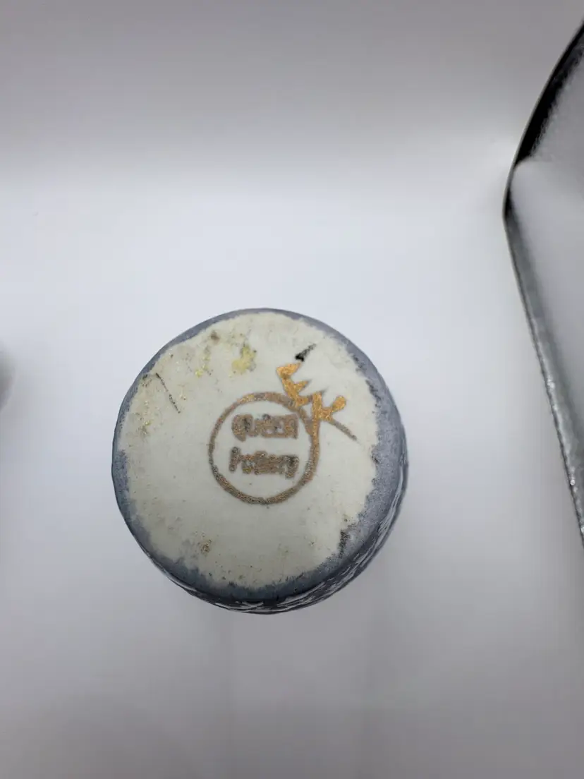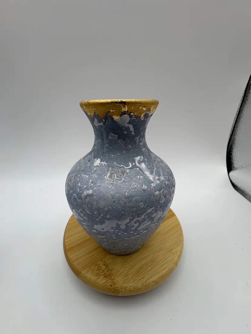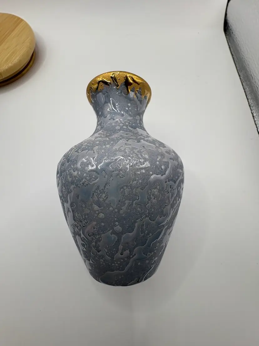 Queen Pottery Bud Vase Color is blue grey with gold accent Drip glazed gives 3D effect / texture Measures 4 inches tall No chips or cracks. Excellent condition