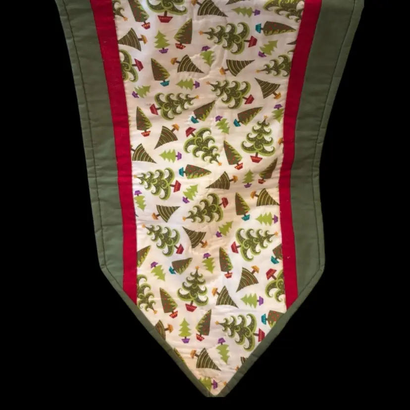 Festive quilted Christmas table runner featuring a cream center panel with colorful Christmas tree motifs, framed by a red border and finished with a green border edge. The pointed tips give it a classic runner style, perfect for adding holiday cheer to your dining or accent table. • Size: 41” tip to tip (approx. 14” wide) • Style: Quilted holiday runner • Pattern: Colorful Christmas trees with red and green borders • Condition: Very good vintage condition, no noted stains or damage