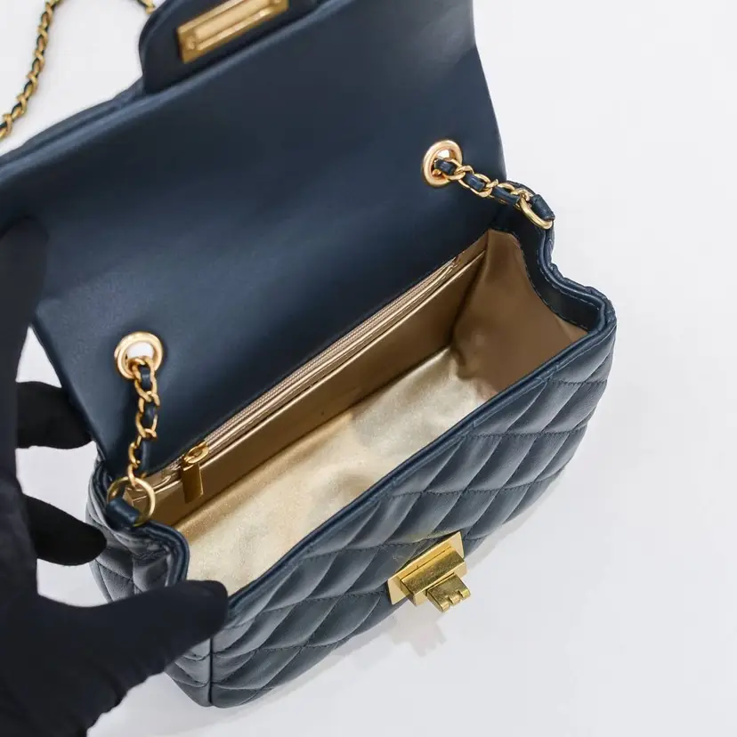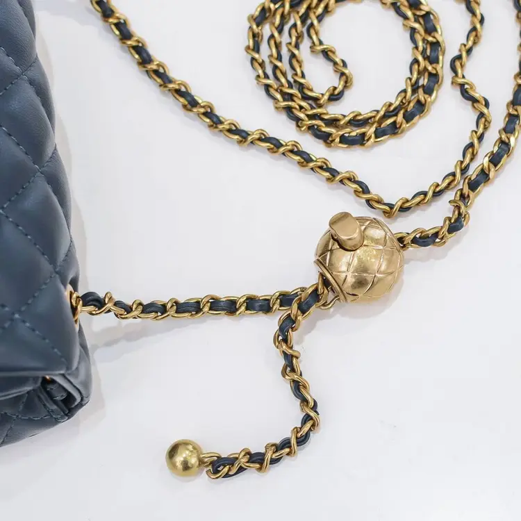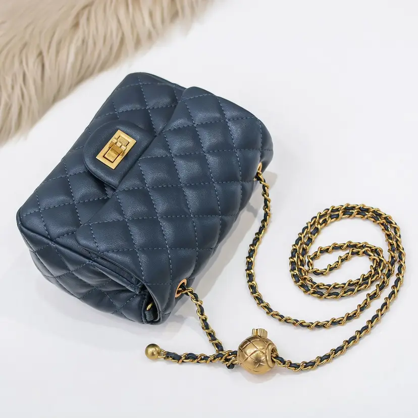Finished in a deep navy hue, it’s accented with polished gold-tone hardware, including a sleek turn-lock closure and a distinctive decorative ball charm on the chain strap. The leather-woven chain allows for versatile styling—wear it as a shoulder bag or crossbody for day-to-night ease.