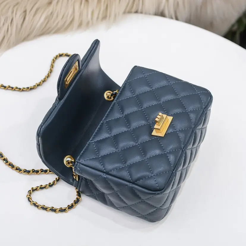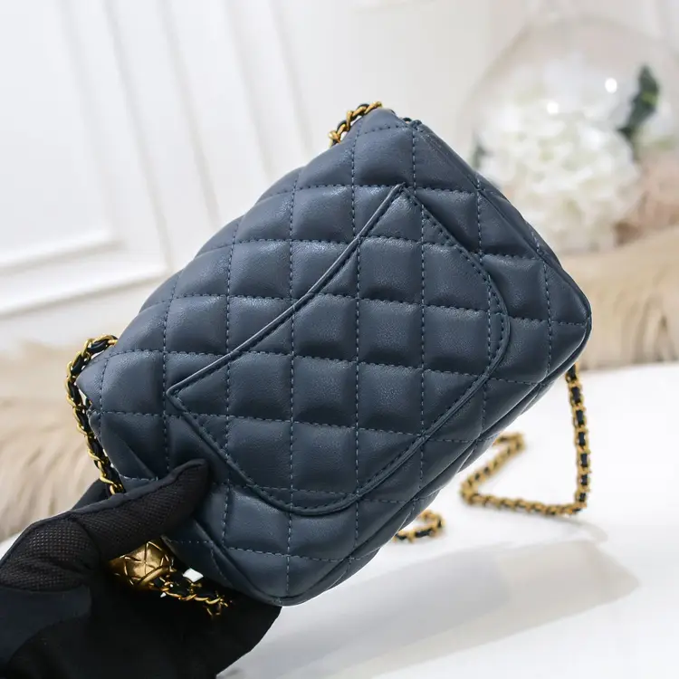 Chic, refined, and effortlessly elegant, the Leather Navy Small Bag with Ball Chain is a statement of modern quiet luxury. Crafted from premium leather, this compact bag features a classic quilted design that adds texture and timeless sophistication.