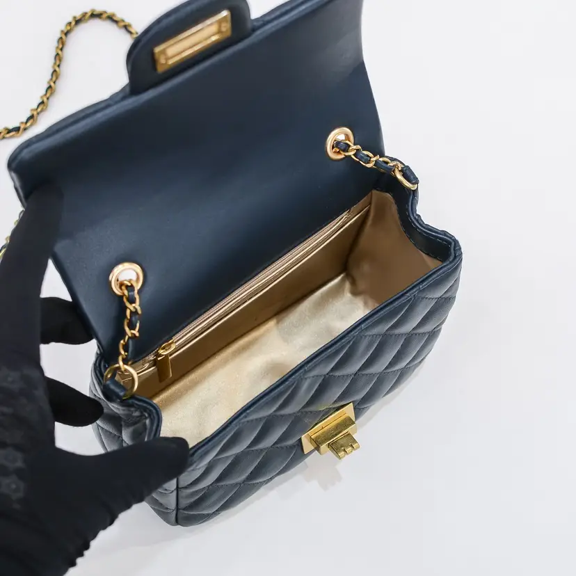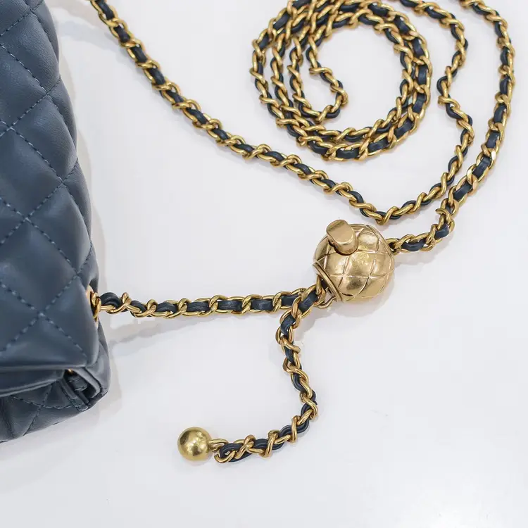 Finished in a deep navy hue, it’s accented with polished gold-tone hardware, including a sleek turn-lock closure and a distinctive decorative ball charm on the chain strap. The leather-woven chain allows for versatile styling—wear it as a shoulder bag or crossbody for day-to-night ease.