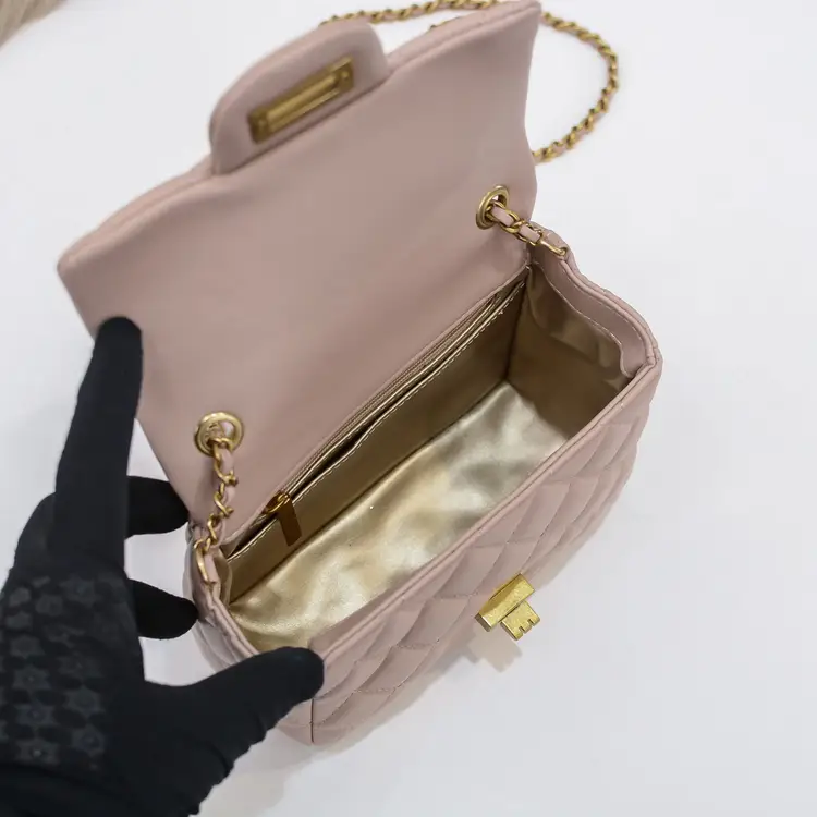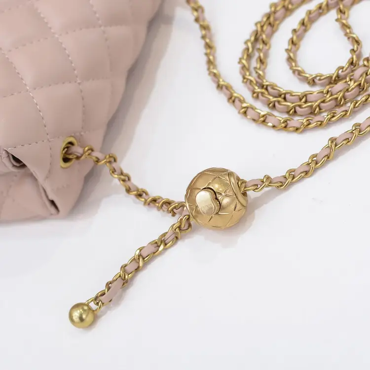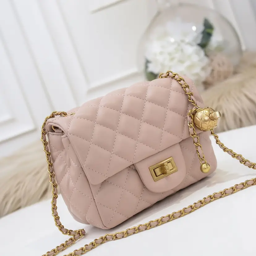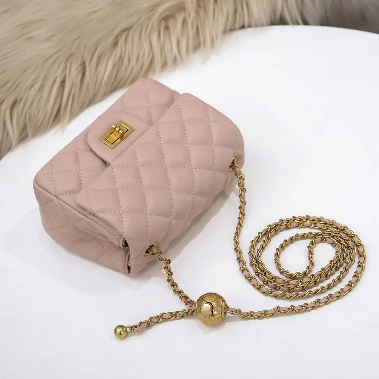 Indulge in a touch of luxury with our stunning Quilted Pink Leather Bag with Ball Chain. This exquisite piece is made from 100% genuine leather and adorned with a gold tone ball on chain, adding a touch of sophistication to any outfit. The quilted design gives the bag a classic and timeless appeal, making it a standout accessory for any fashion-forward individual. Perfect for both day and evening wear, this bag offers versatility and style in equal measure. Treat yourself to the epitome of elegance with this must-have addition to your luxury bag collection.