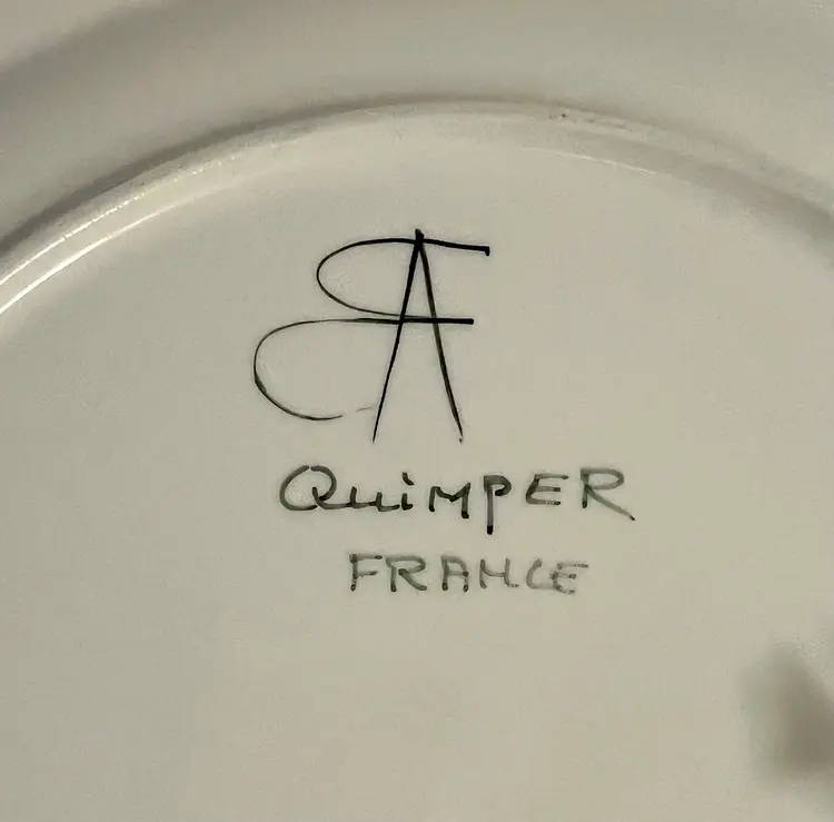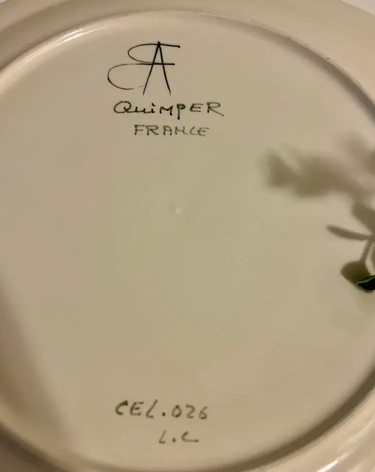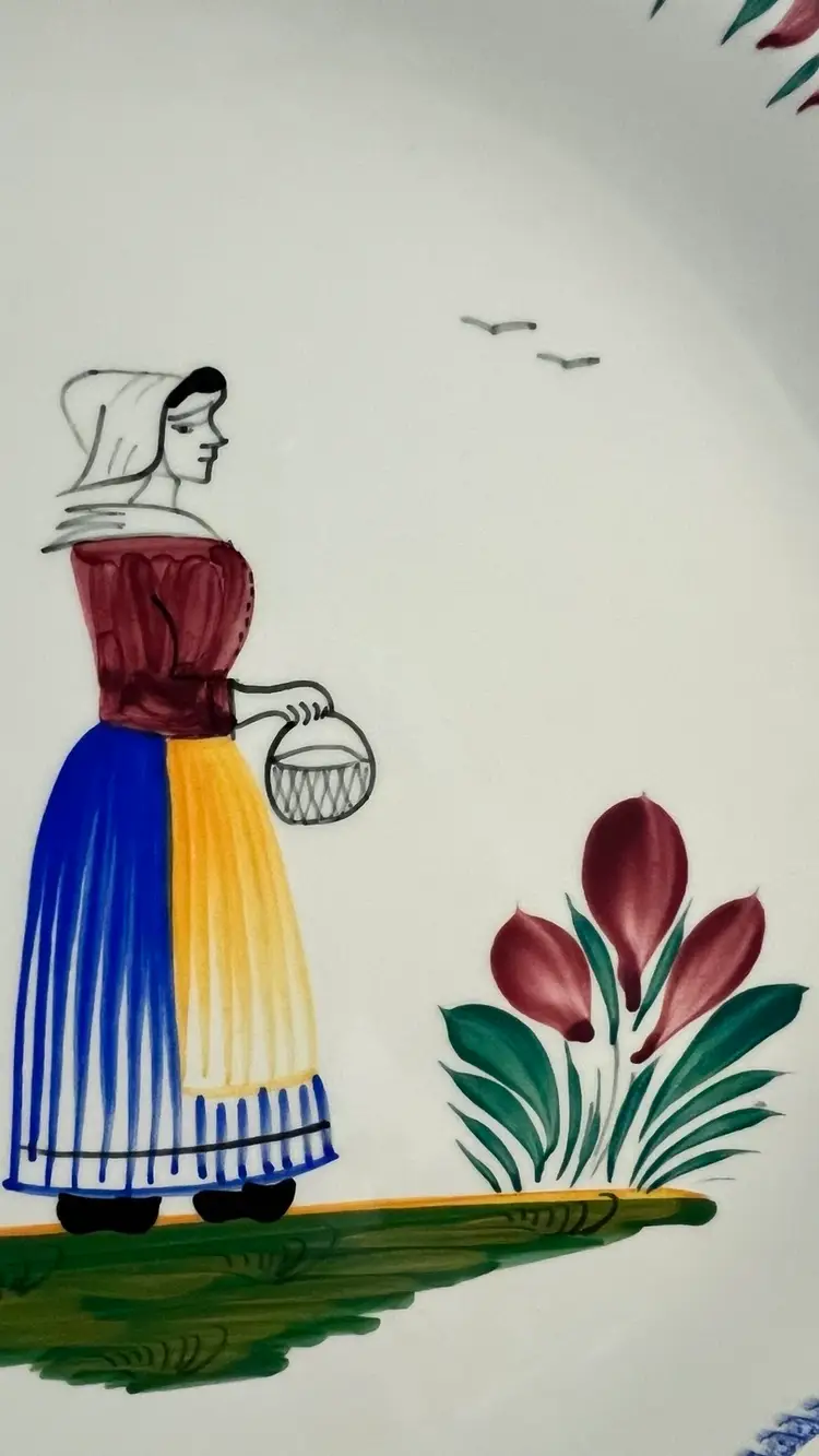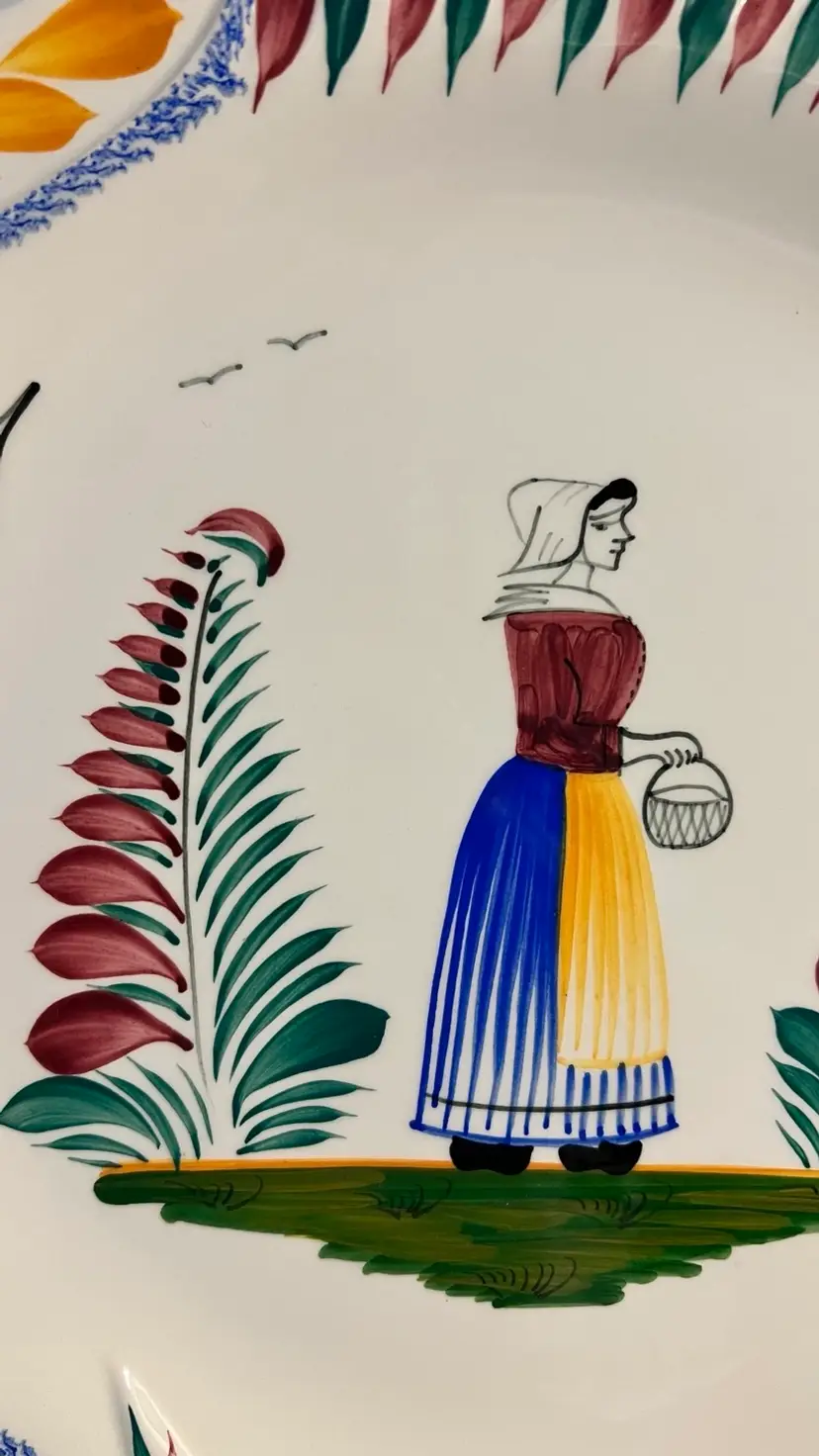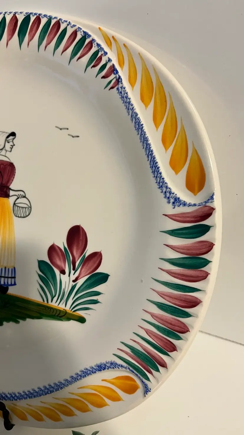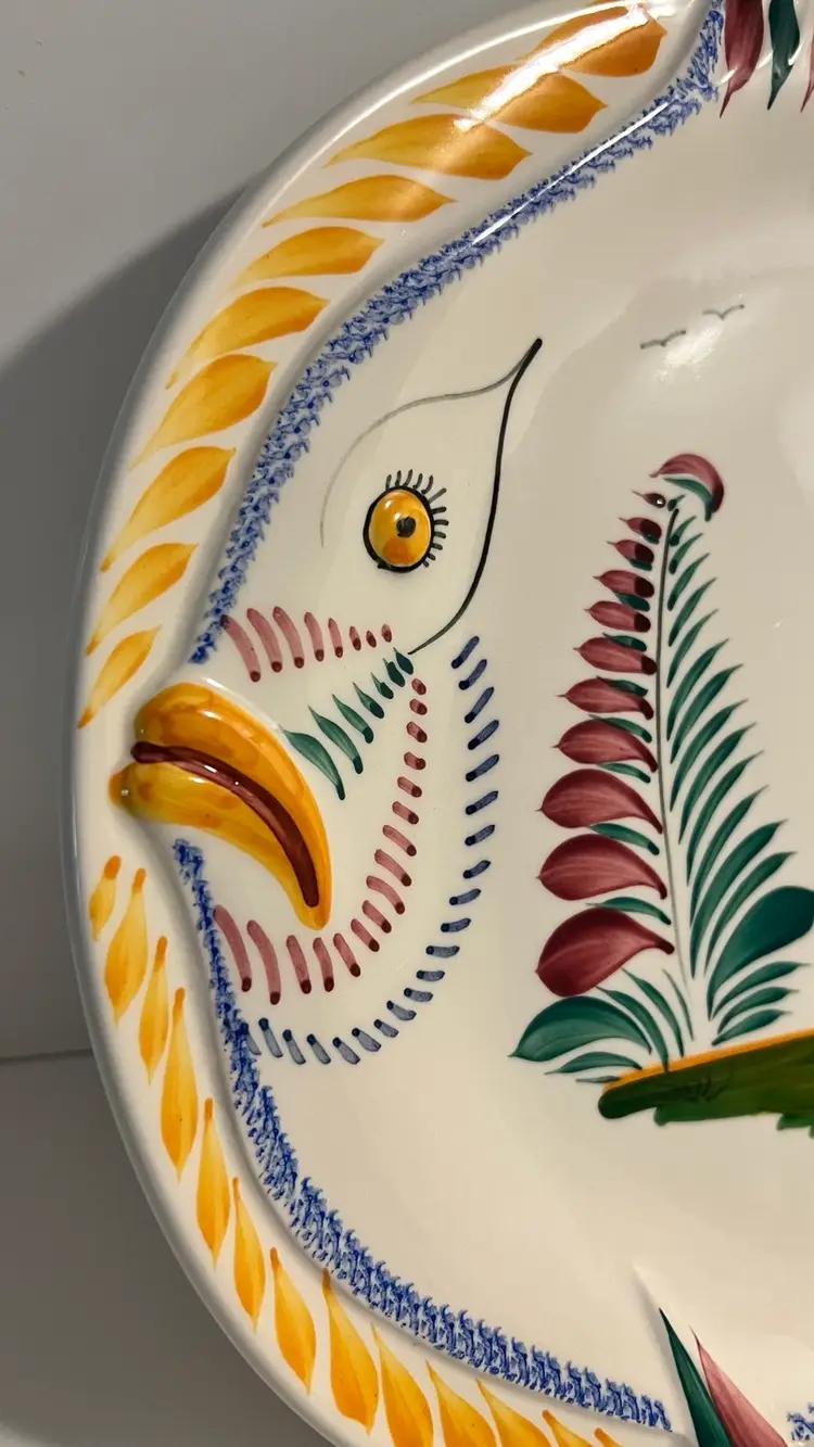 Raised design fish details on this colorful Quimper lady fish platter. 12” x 10”. Lovely in person.
