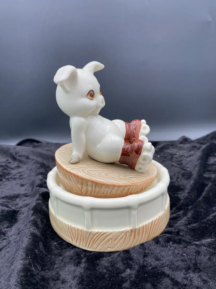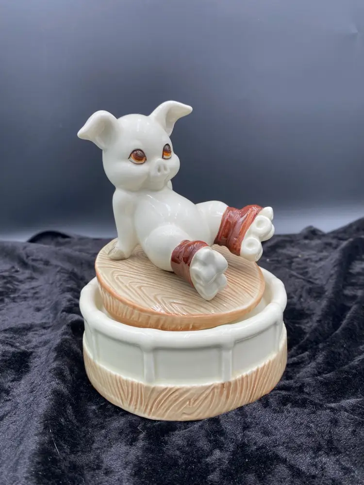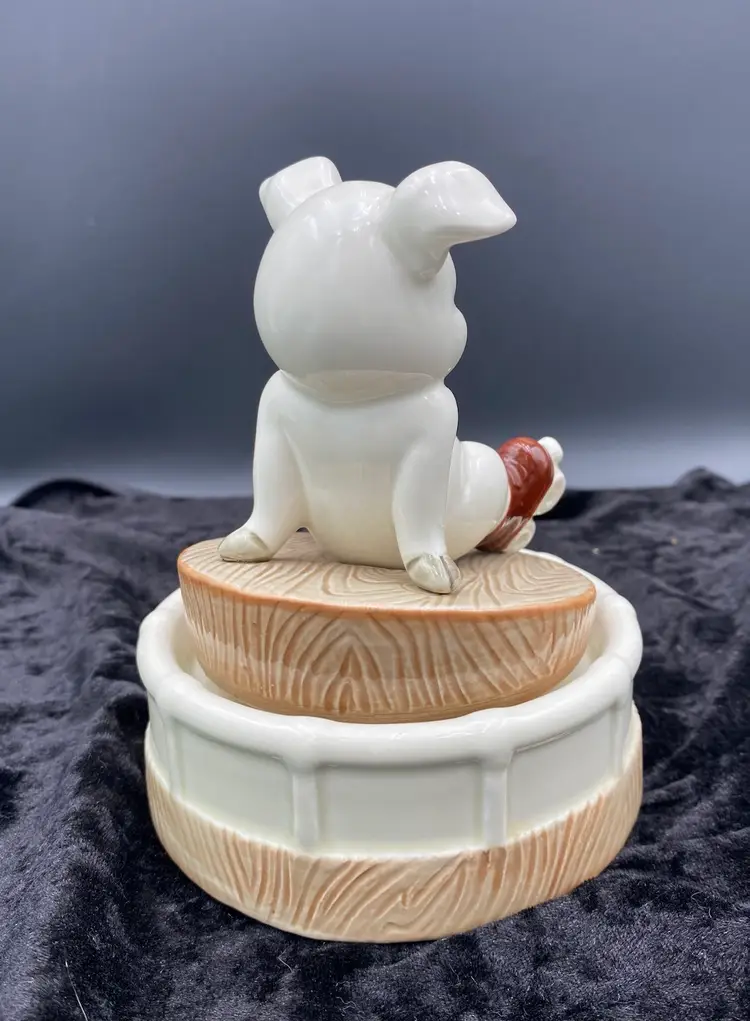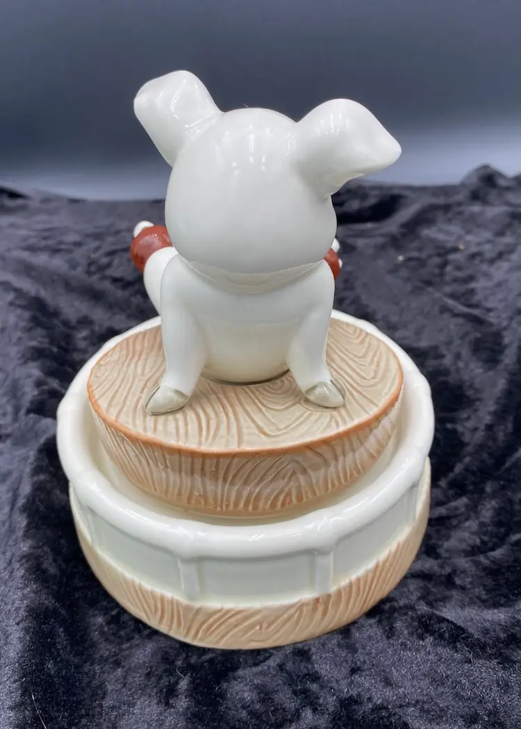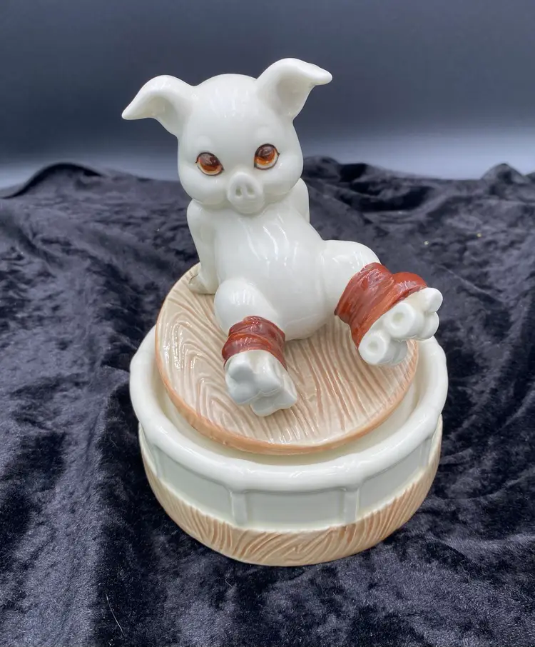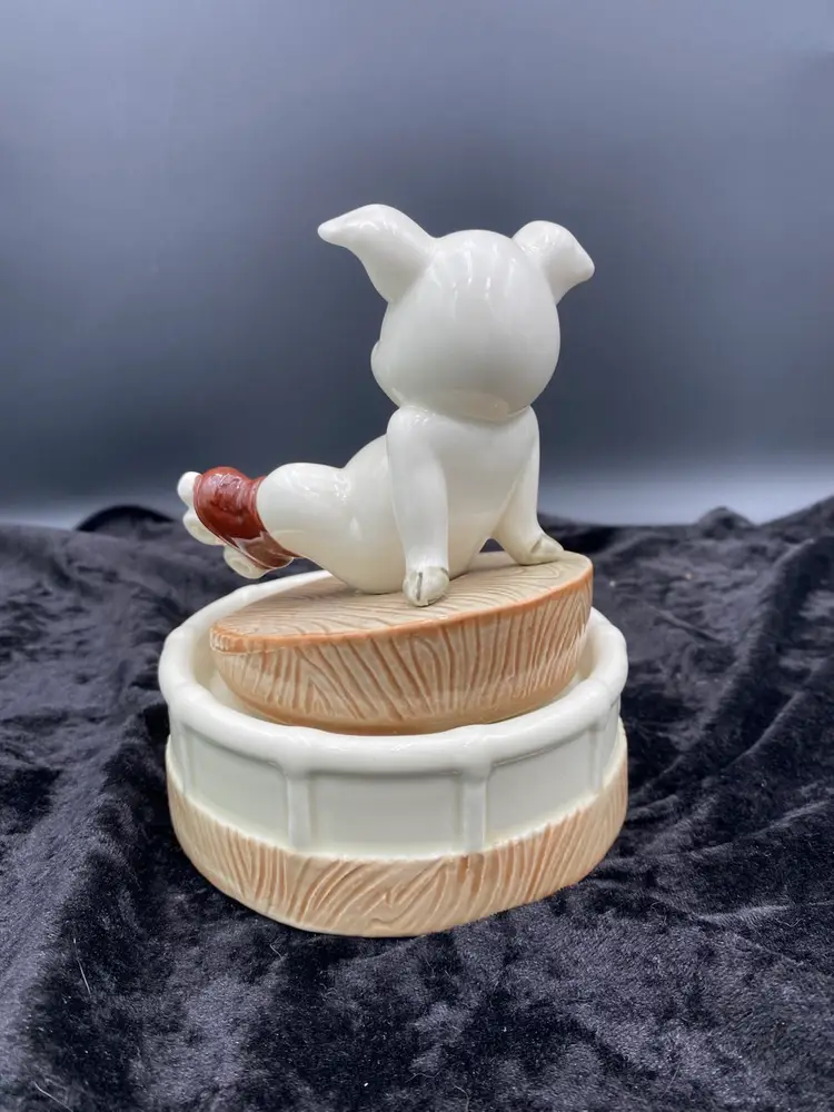 This Roller Skating Pig Music Box is a charming collectible featuring a wind-up mechanism that plays the song "It's Impossible." Standing at 6.4 inches tall and 4.9 inches wide, this unique music box weighs 1 pound and 4.6 ounces. You immediately feel for the little piggy who has lost its footing! It's a delightful addition to any decor or music box collection. Made in Japan during the 1980s, this nostalgic piece captures the whimsical and playful essence of that era.