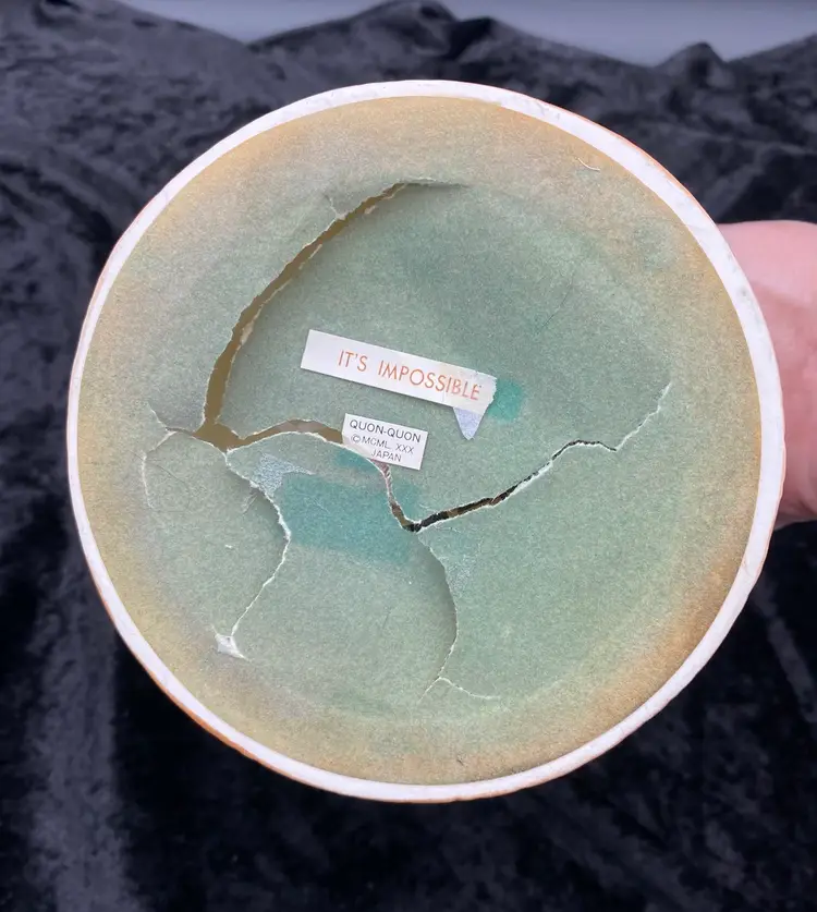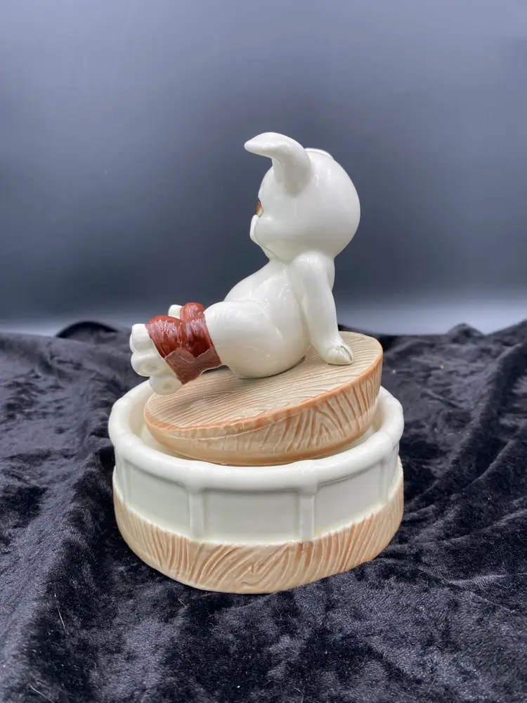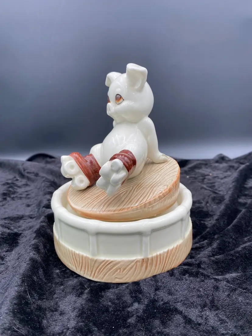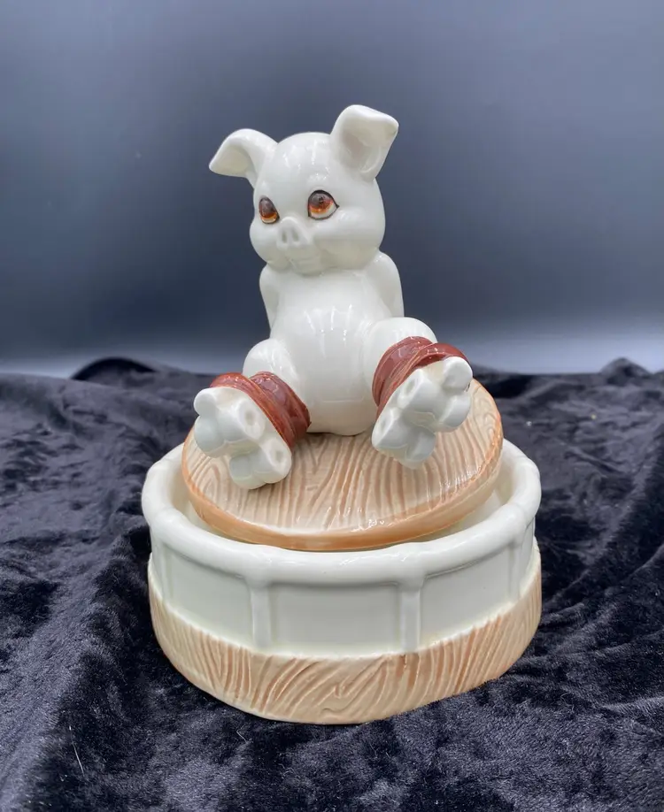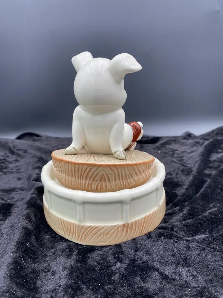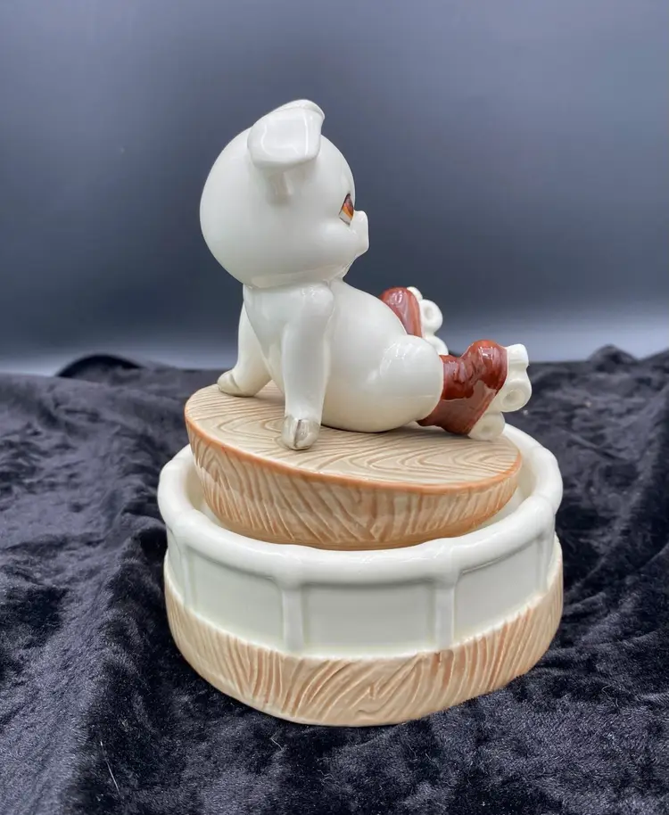 This Roller Skating Pig Music Box is a charming collectible featuring a wind-up mechanism that plays the song "It's Impossible." Standing at 6.4 inches tall and 4.9 inches wide, this unique music box weighs 1 pound and 4.6 ounces. You immediately feel for the little piggy who has lost its footing! It's a delightful addition to any decor or music box collection. Made in Japan during the 1980s, this nostalgic piece captures the whimsical and playful essence of that era.