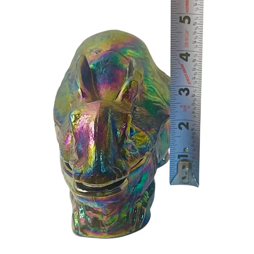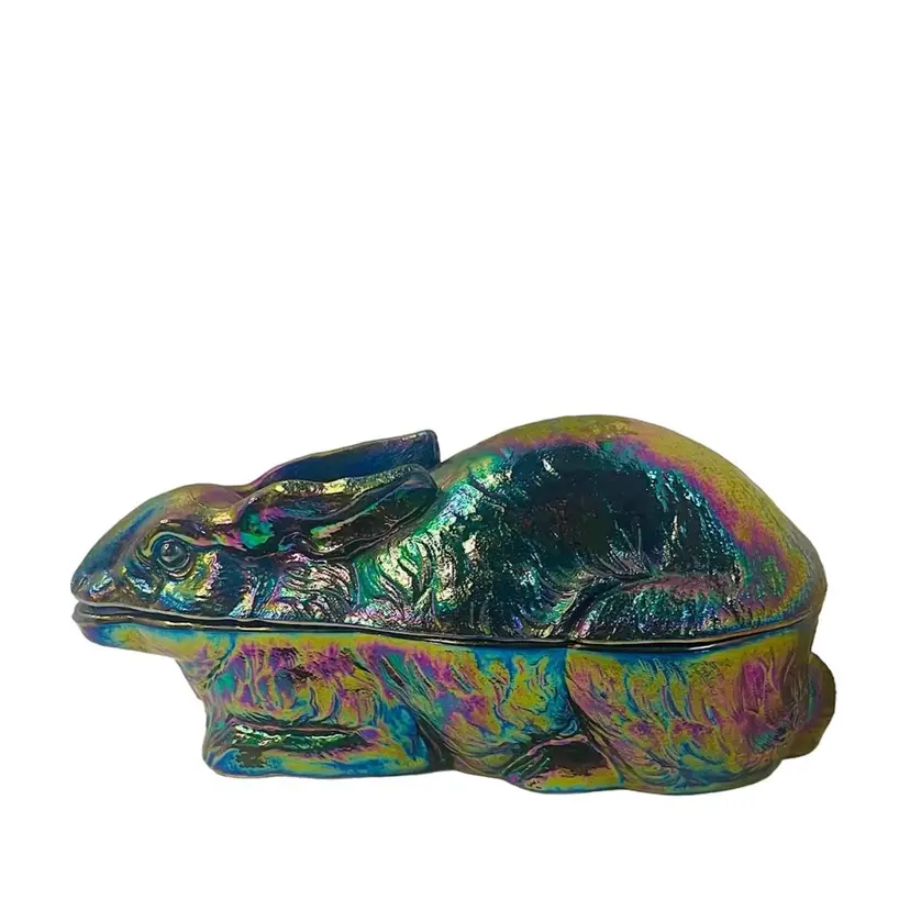 Large Summit Atterbury, blue carnival glass crouching bunny, candy dish/box. Summit patient date 1886, with Imperial logo. Made by Summit Glass from an Imperial Glass mold. The original mold for this piece was made by Atterbury.