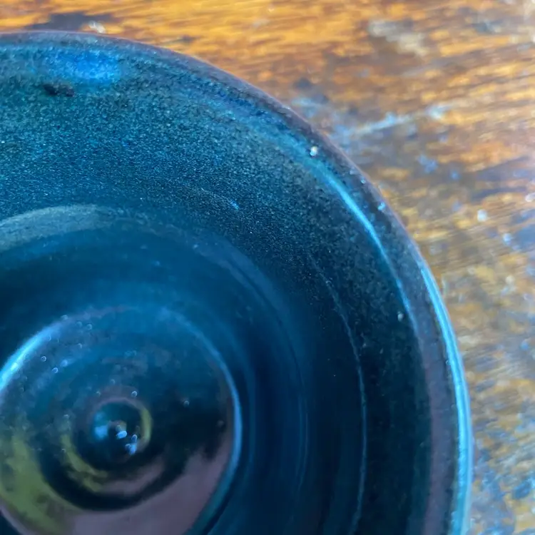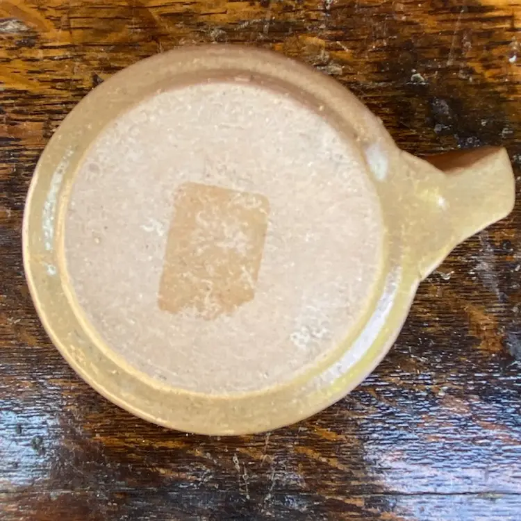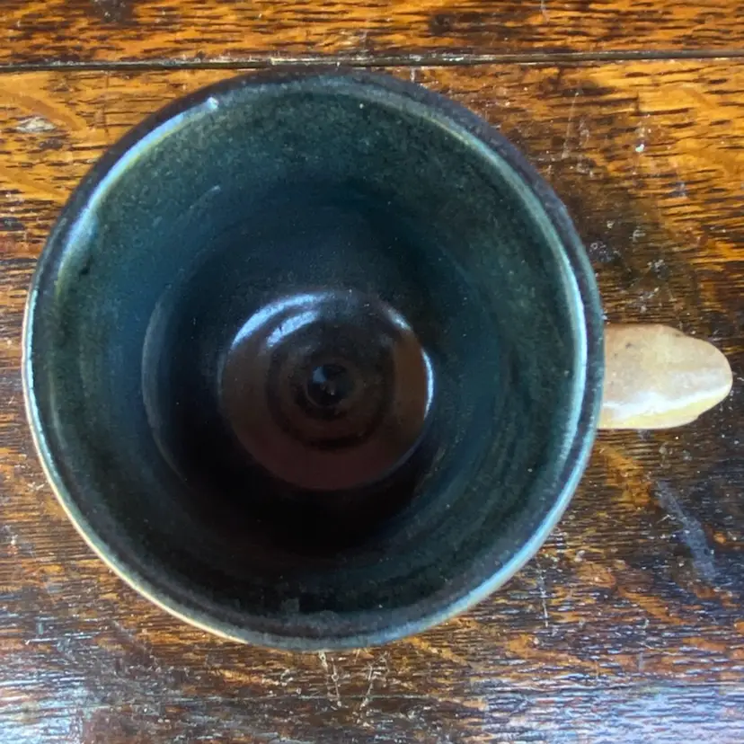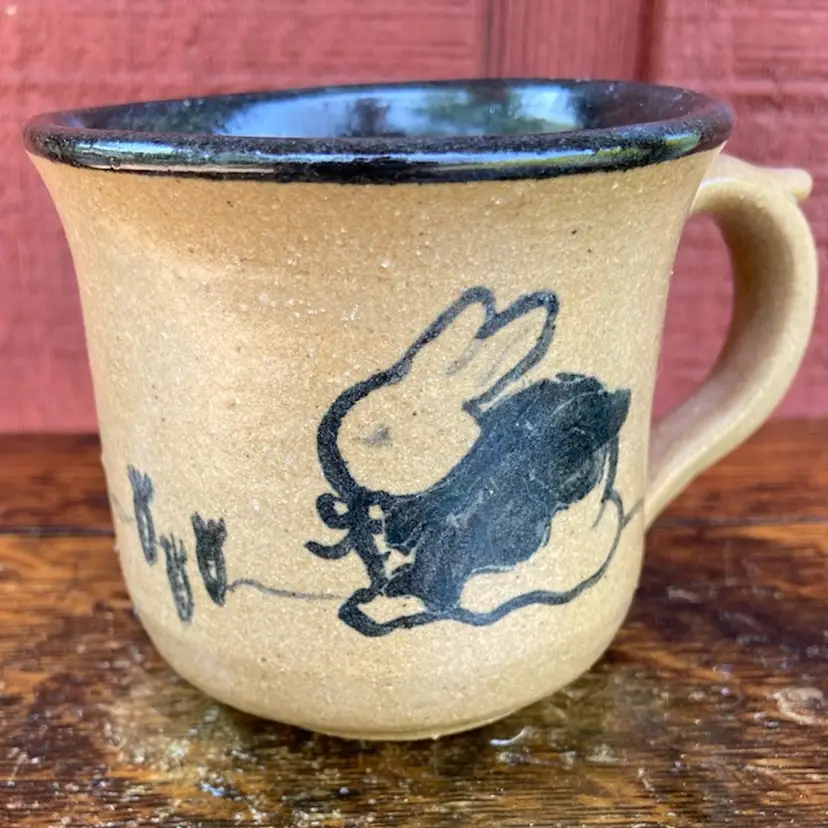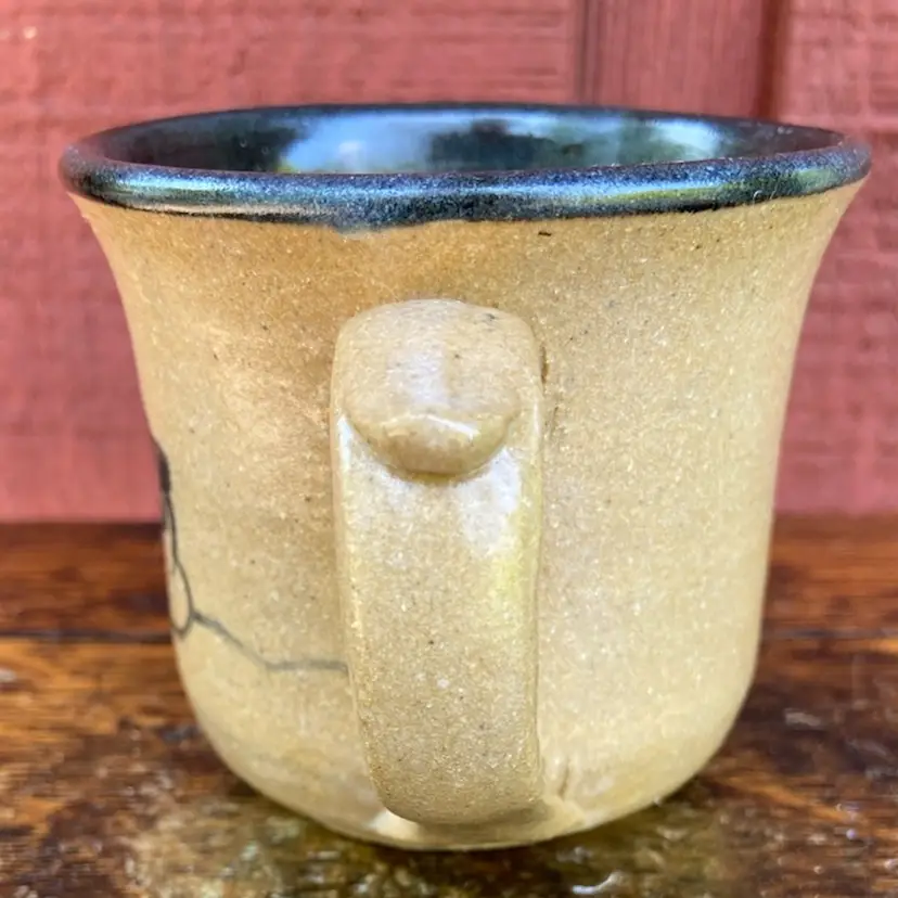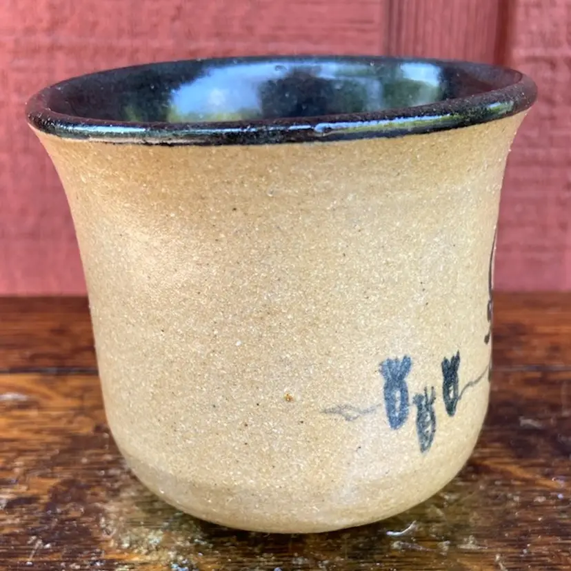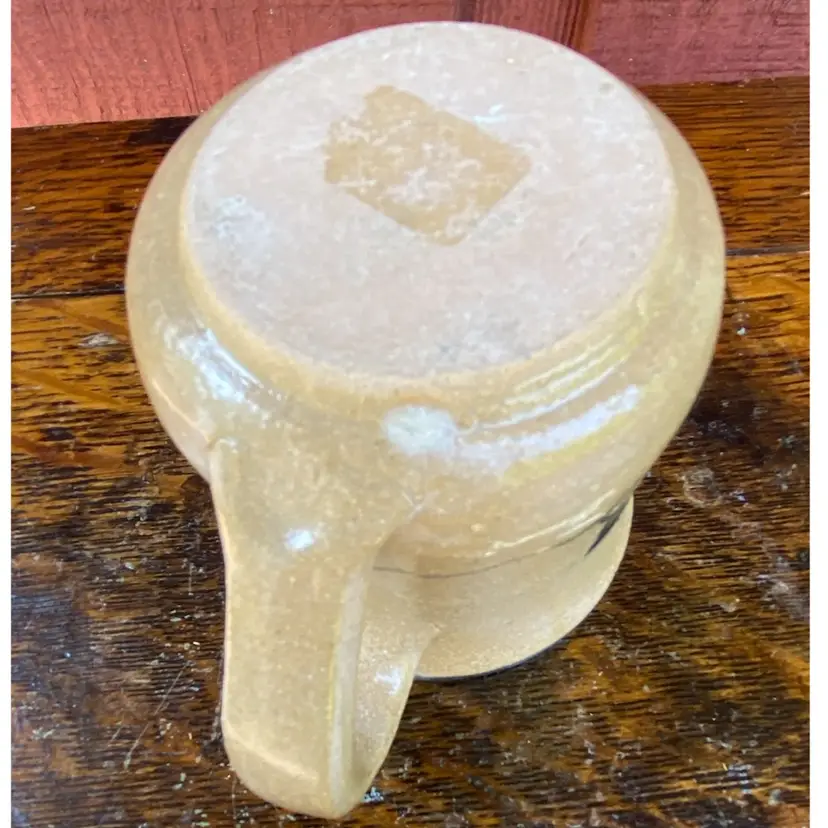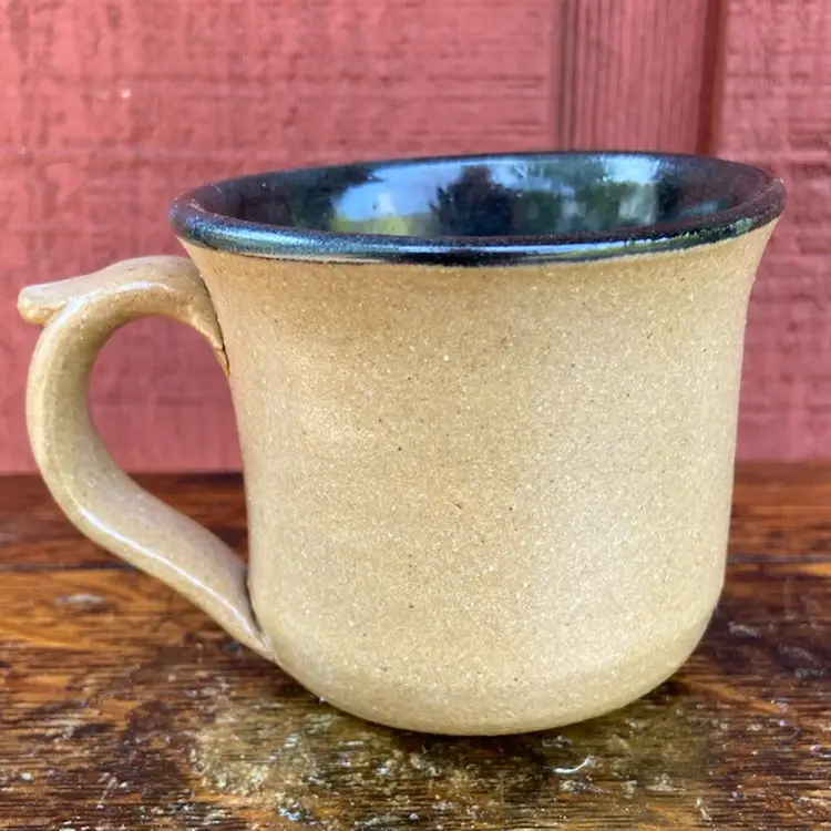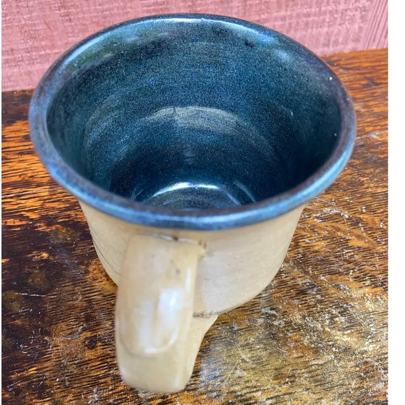Approx 3”h x 4”w (including handle) and holds 8 ounces. Pre-owned condition. Brown inside mug appears to be glaze and not a stain. One small popped glaze bubble on lip. Sticker residue on bottom. No chips or cracks. See images as part of description.