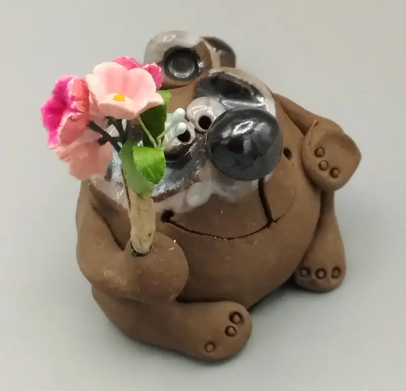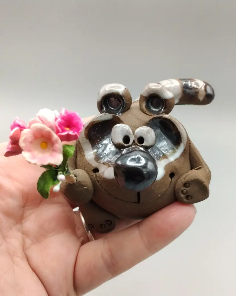 This adorable clay figurine of a Raccoon, with a trashy bouguet of flowers, on his way to pick up his date.