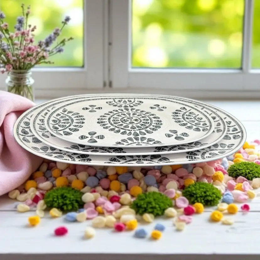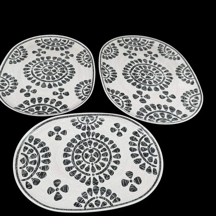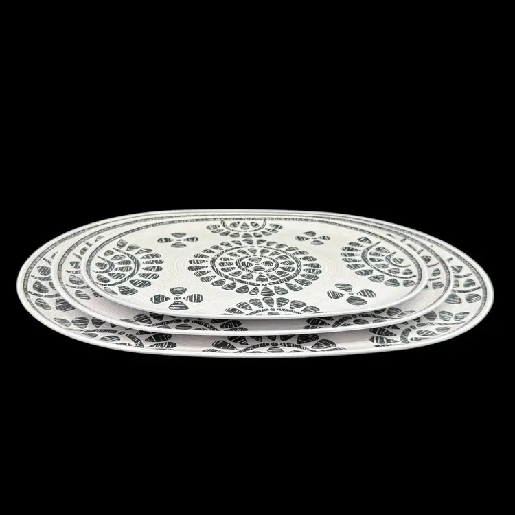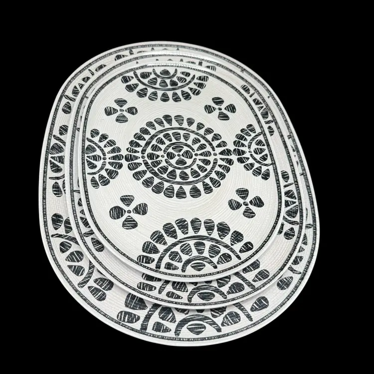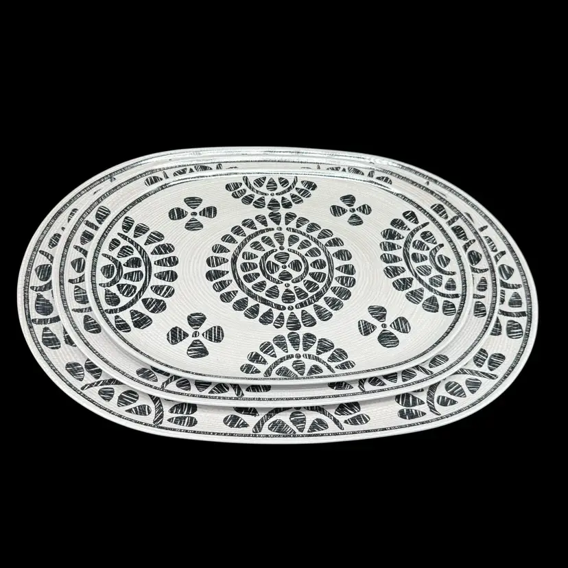 The Rachel Zoe Melamine Set of 3 Serving Platters Trays in a neutral floral geometric design is a stylish addition to any kitchen or dining area. These oval-shaped platters are made of melamine material, making them lightweight and easy to carry. With a contemporary design and beautiful pattern, these serving trays are perfect for all occasions, including holidays, family gatherings, and everyday entertaining. The gray color and geometric theme add a modern touch to your presentation, while the break-resistant and dishwasher-safe feature ensures easy maintenance and durability. Perfect for serving up your favorite dishes in style.