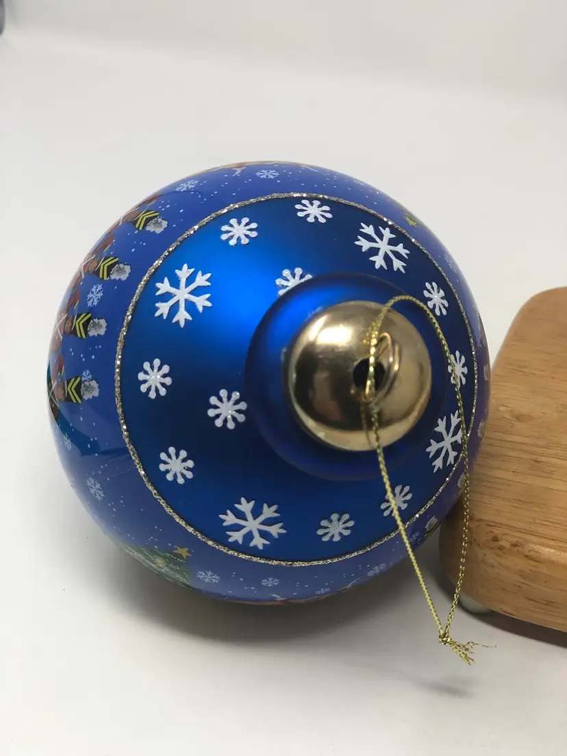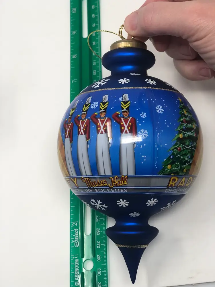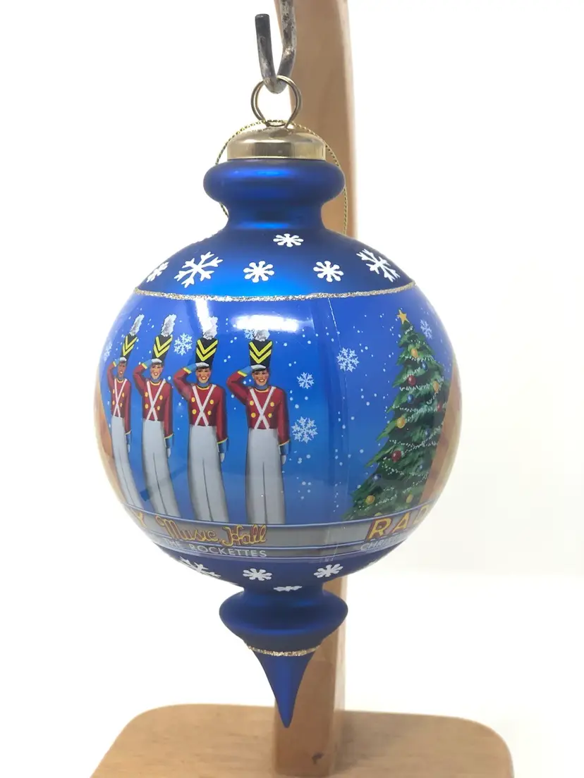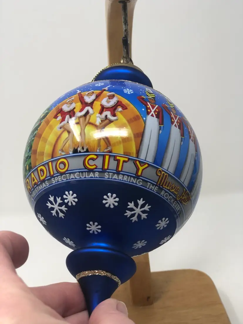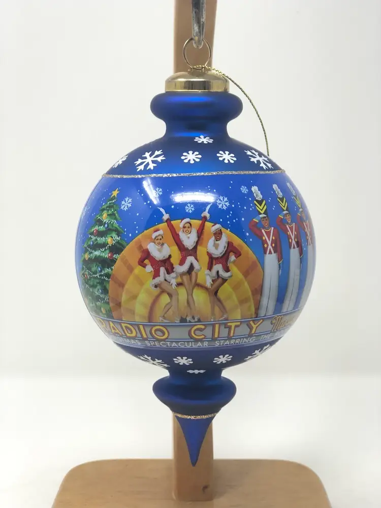 4" in diameter features a blue satin finish with glitter snowflakes and a digital film wrap of the Rockettes. Beautiful collector's item ready to display