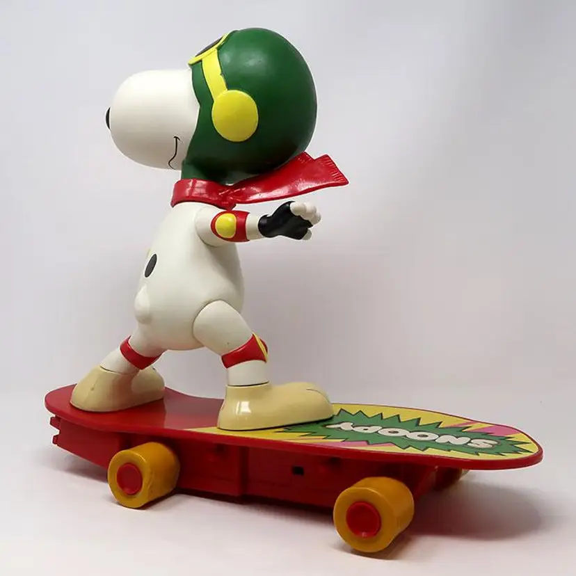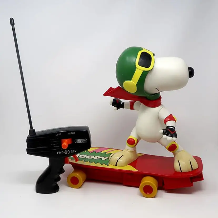Hit the pavement with Snoopy on this awesome remote control skateboard! Featuring Snoopy in his Flying Ace helmet, goggles and scarf, this collectible toy from Matchbox is perfect for any Peanuts fan. The set includes a classic remote control for hours of fun. Requires two 9 Volt and 8 AA batteries - not included. From the 1980s.