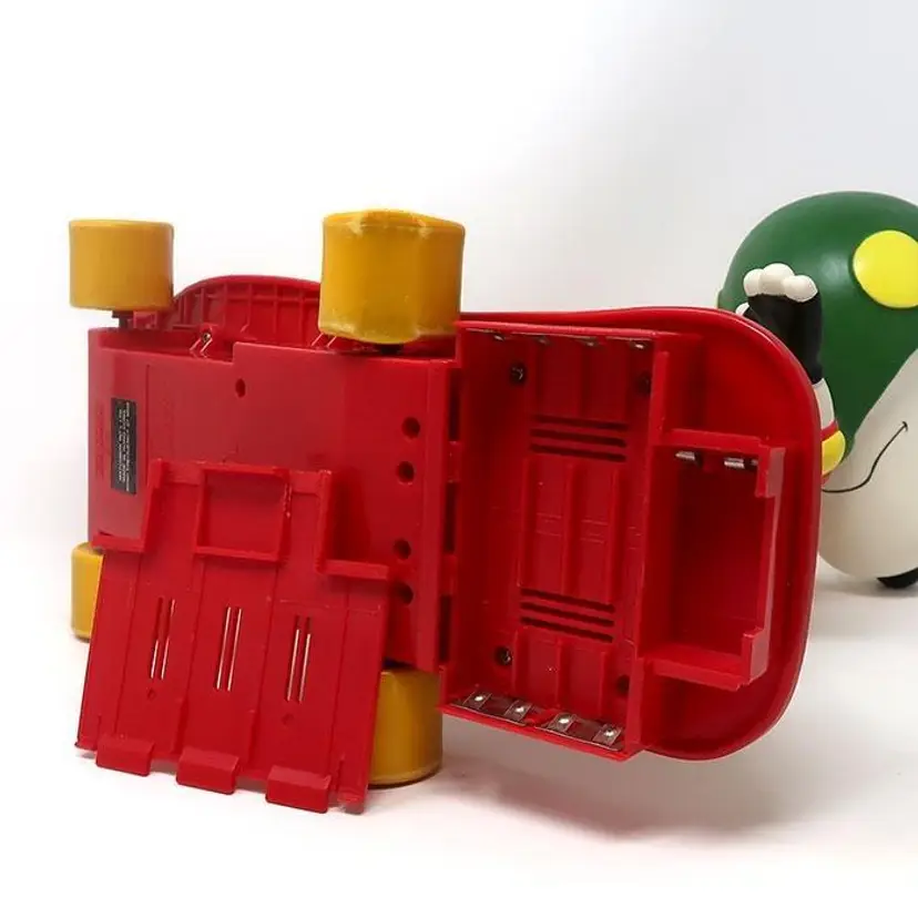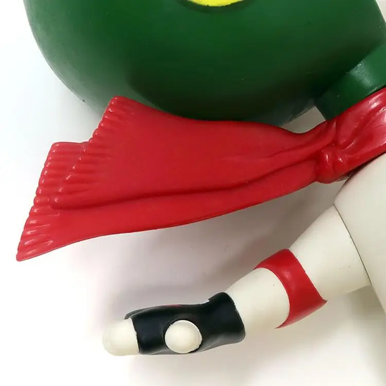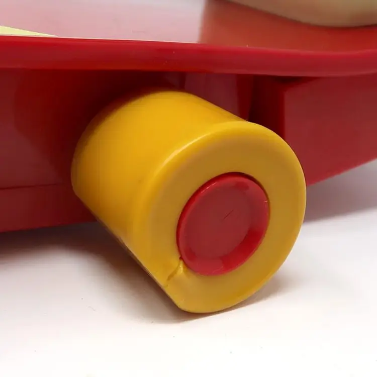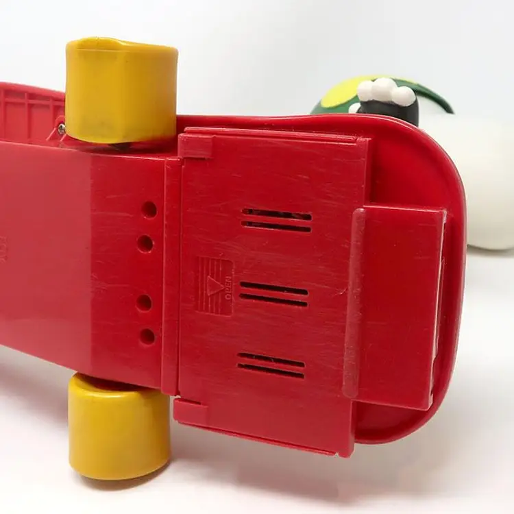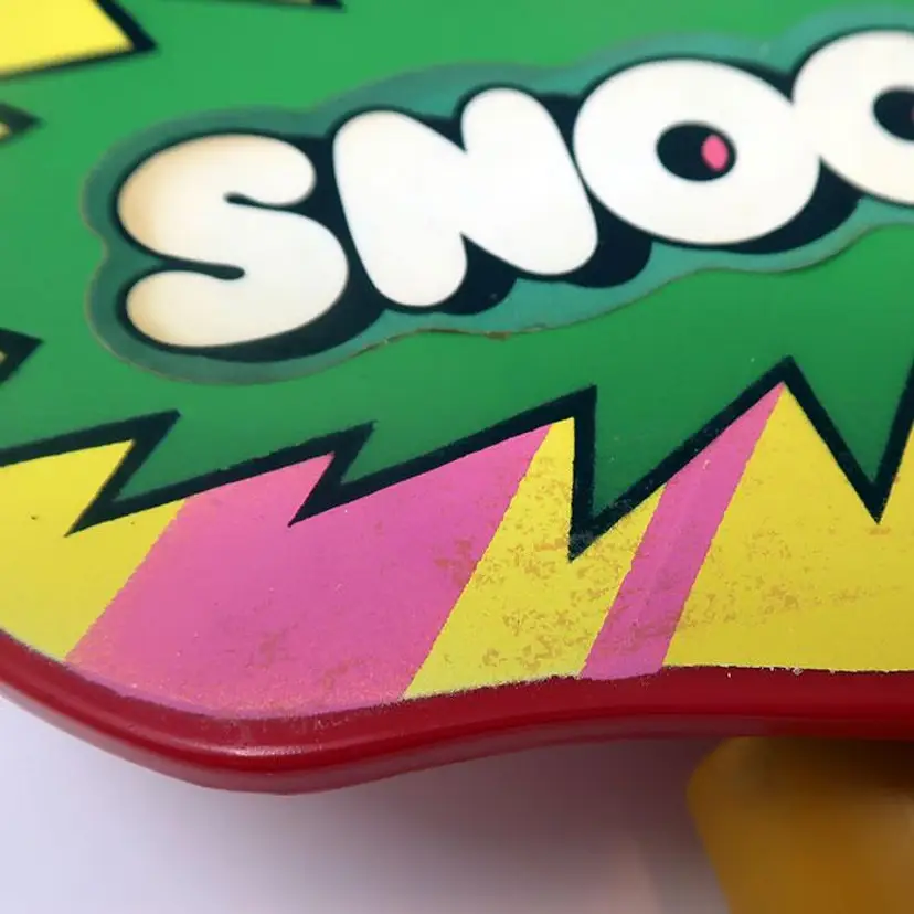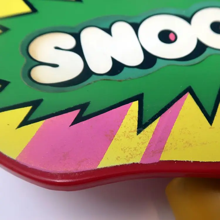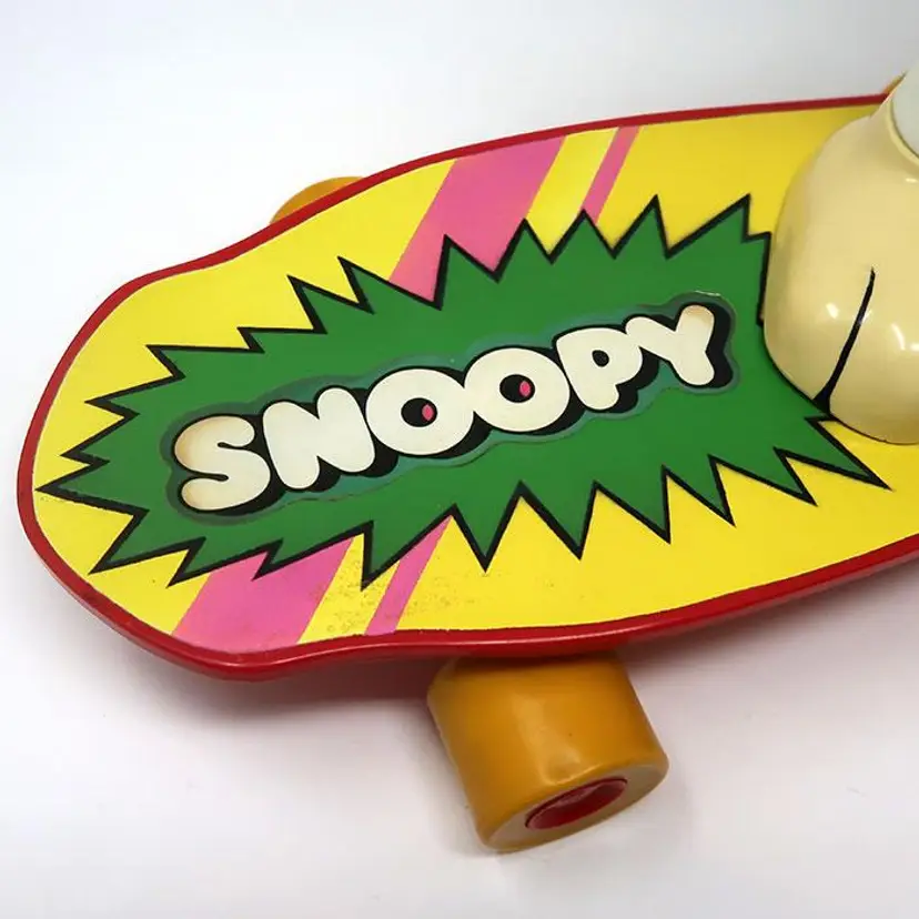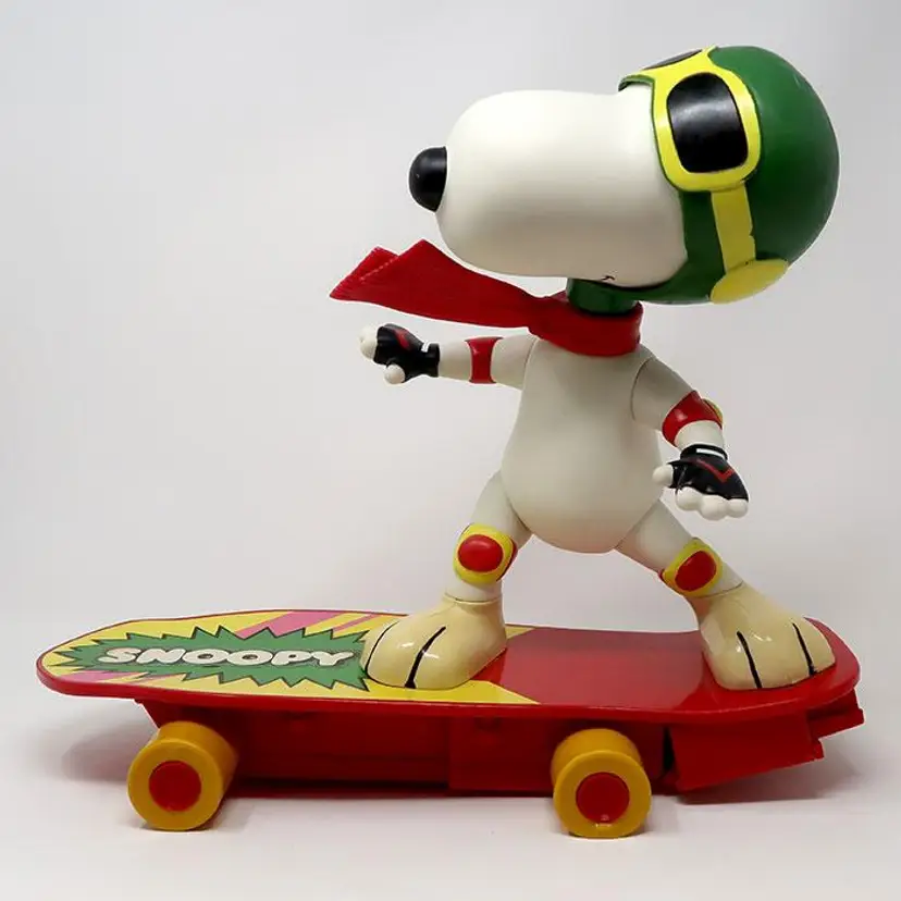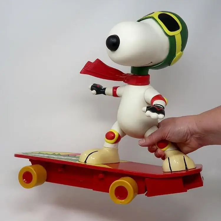 Shows signs of use overall. Baseplate has typical scratches from use. Back wheels have flat spots that partially interfere with use, but generally only when starting from a standstill. Scarf has some minor spotting, possibly from age. Snoopy sticker has some discoloration on edges. Some "overspray" on front of skateboard top. Typical yellowed feet on Snoopy. Remote is missing the battery cover, but it's easy enough to keep the battery in with your hand or use tape.