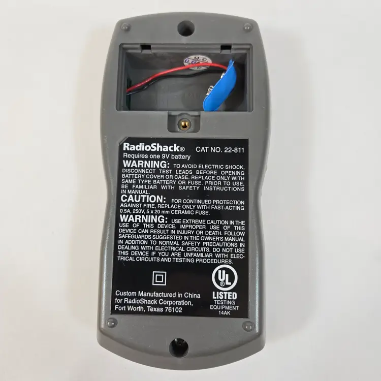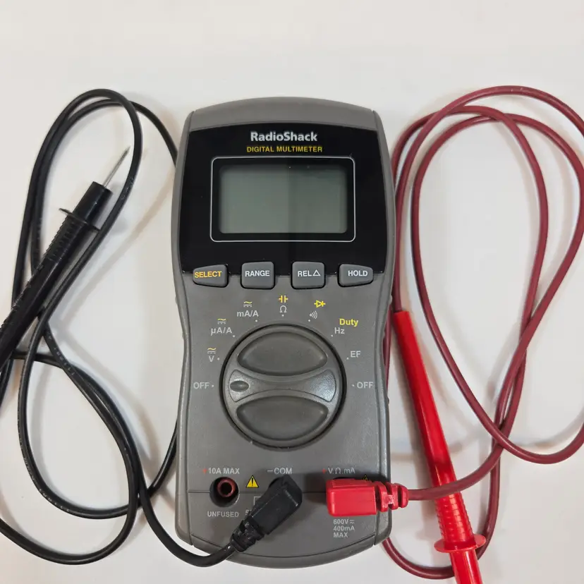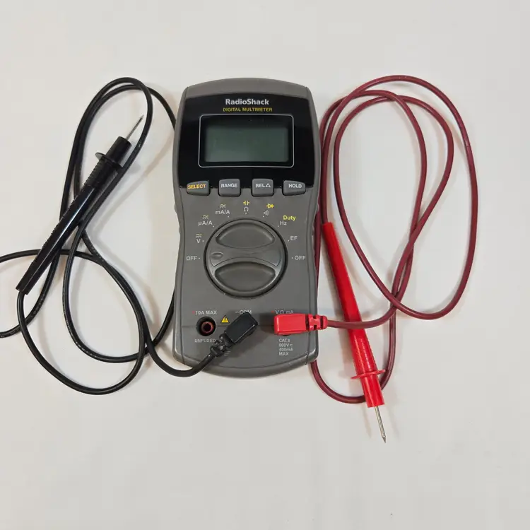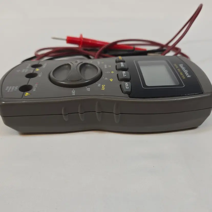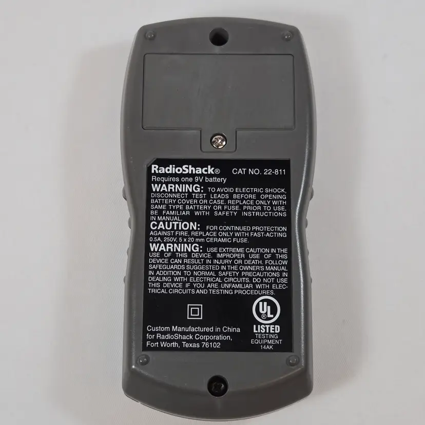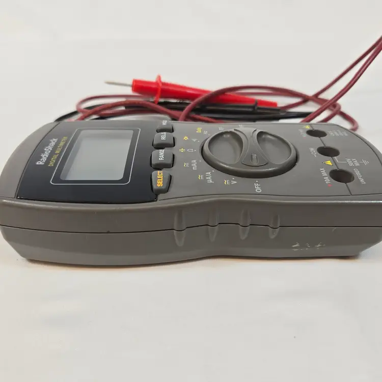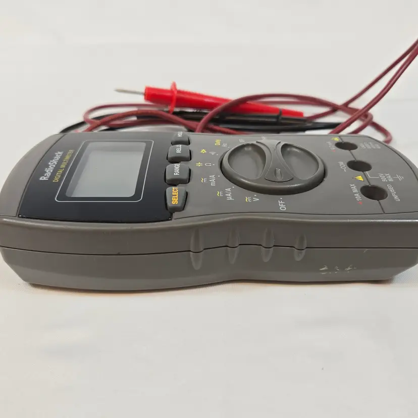 RadioShack digital multimeter, model 22-811. Tested and working (see photos). Includes attached leads. Runs on one 9V battery (not included). Handy tool for testing voltage, resistance, and current. Shows normal signs of use but functions as intended.