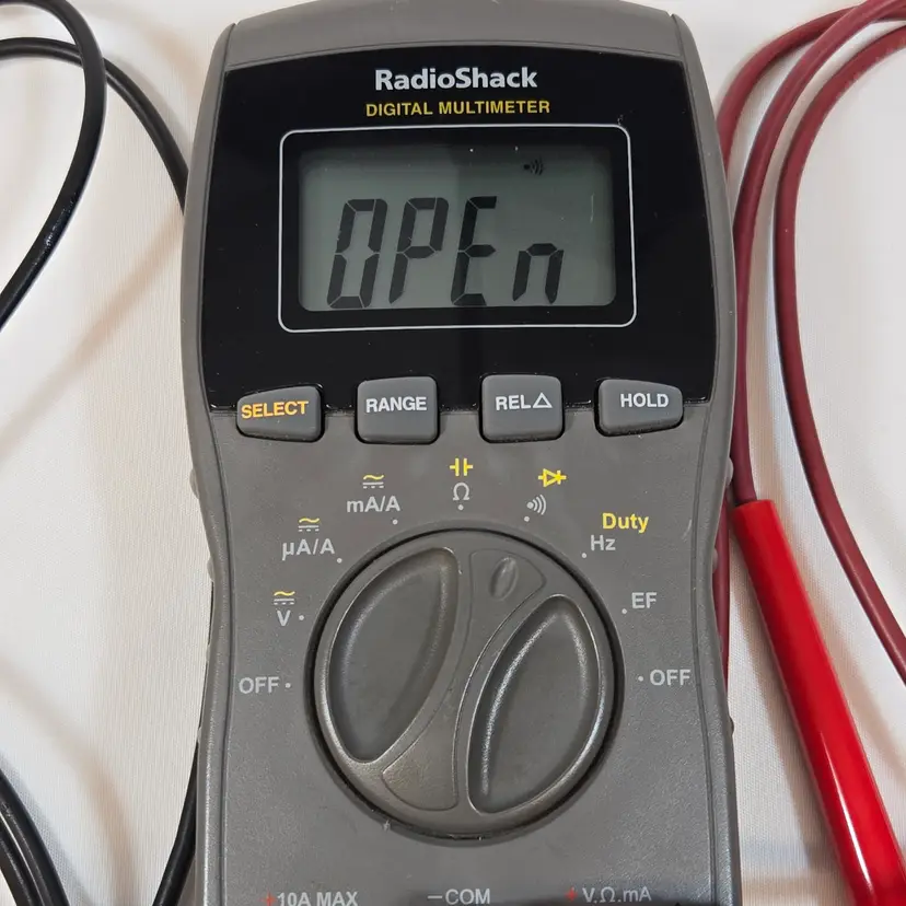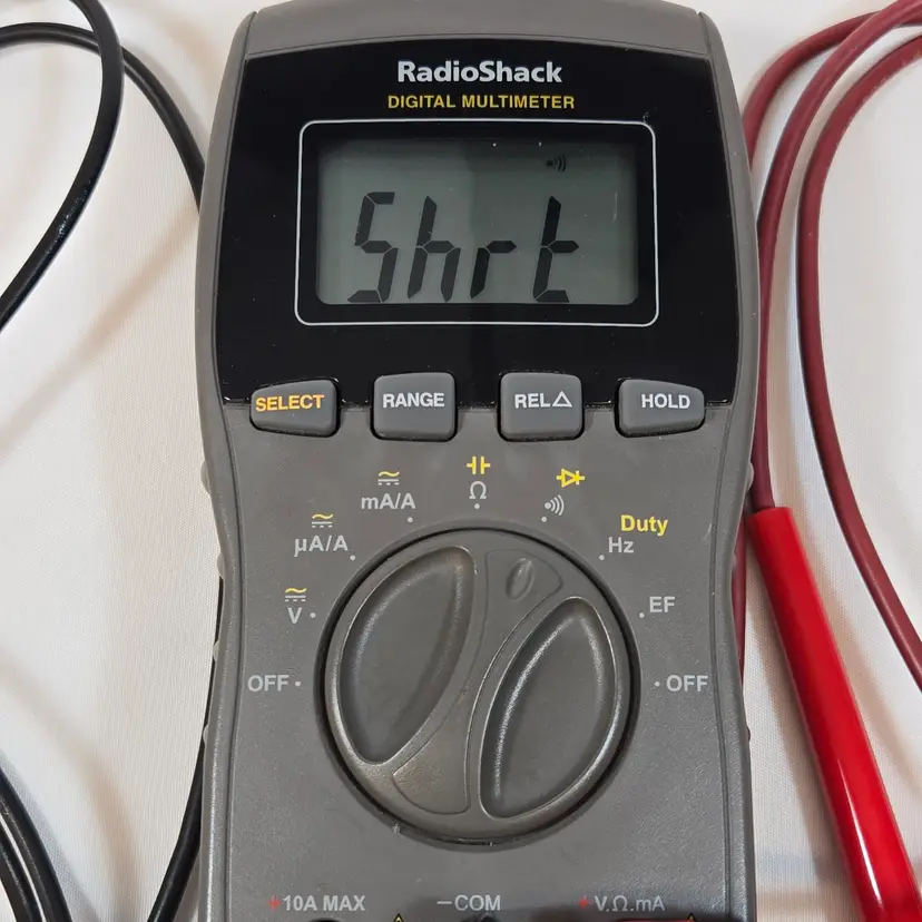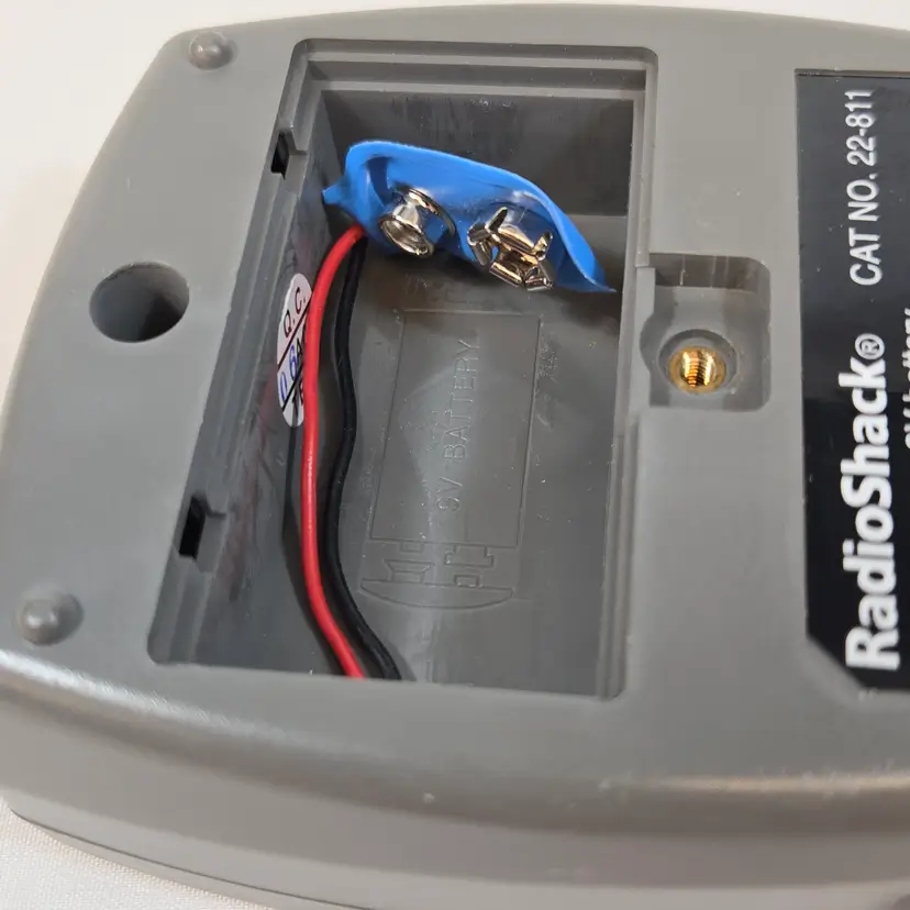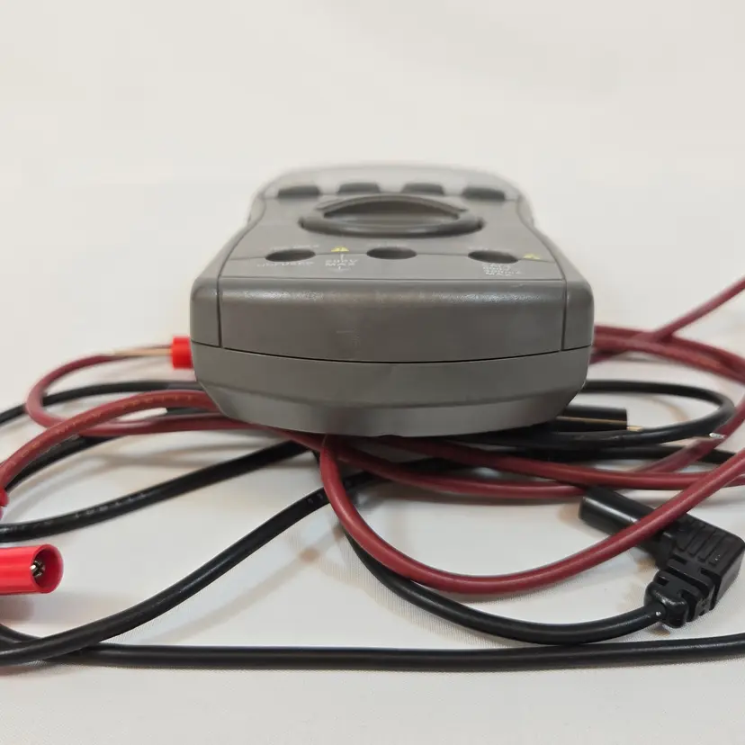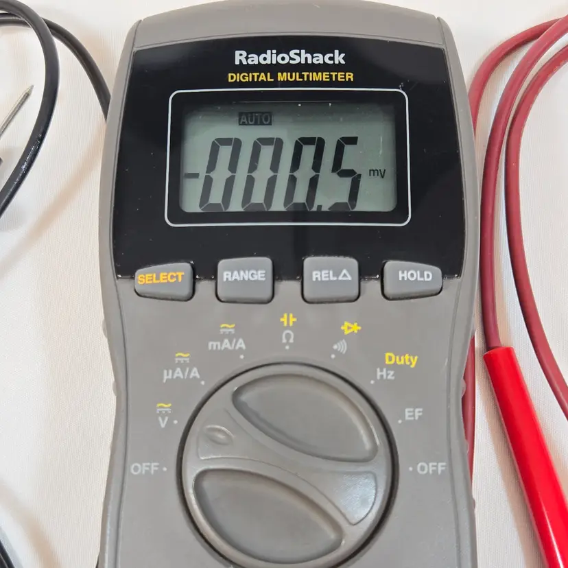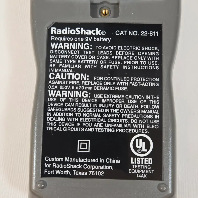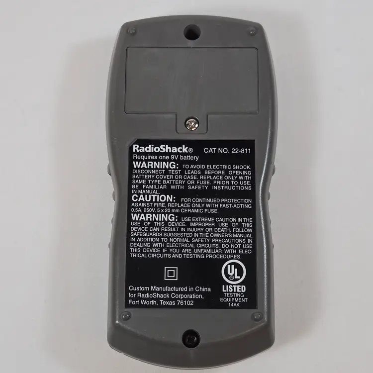 RadioShack digital multimeter, model 22-811. Tested and working (see photos). Includes attached leads. Runs on one 9V battery (not included). Handy tool for testing voltage, resistance, and current. Shows normal signs of use but functions as intended.