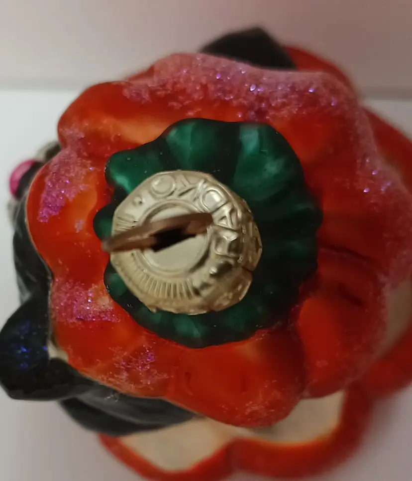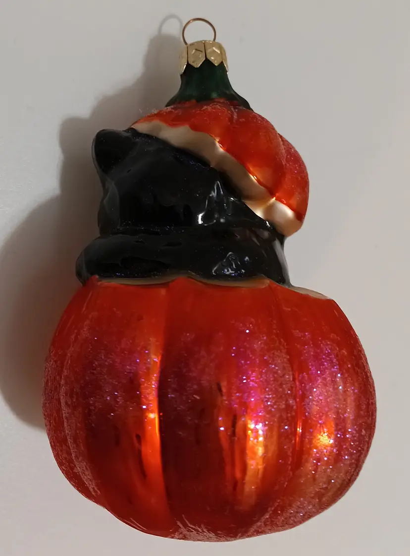 RADKO Black Cat in a Pumpkin Ornament; Round on Bottom; Very Sweet!; 5" T x 3" W; Excellent Condition; No Chips or Cracks;
