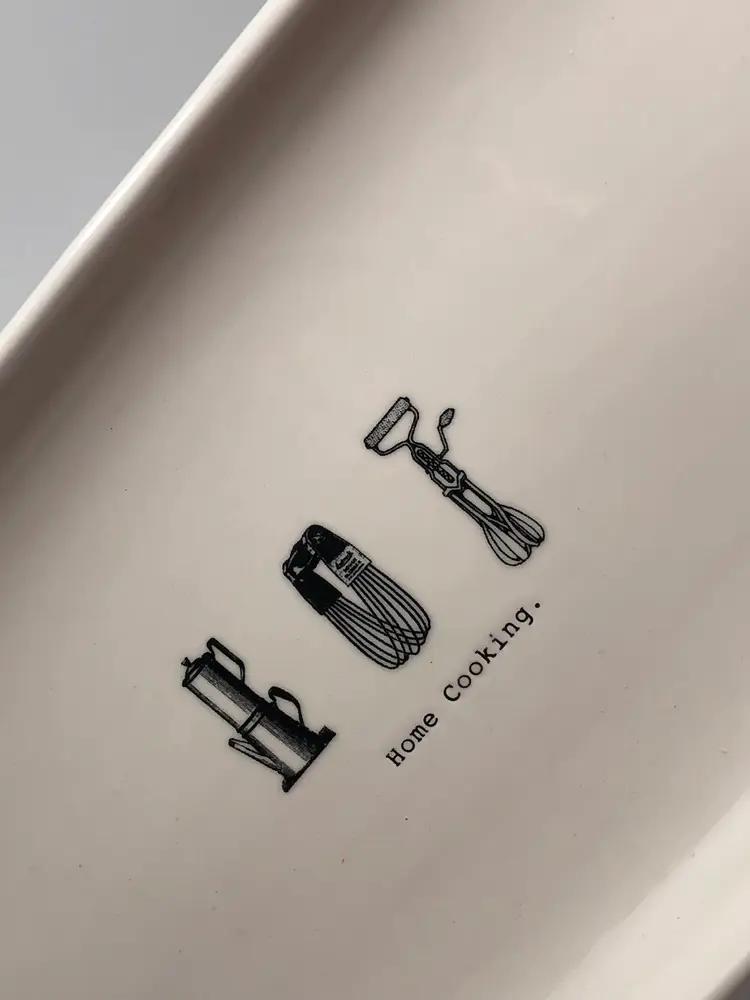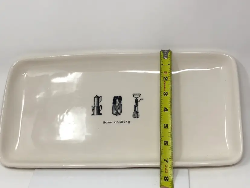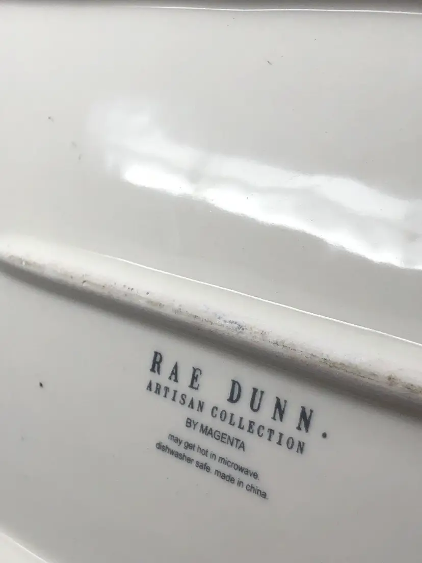 14 1/2" x 7" rectangle serving tray, ceramic with impressed letters. Stamped on the back Rae Dunn Artisan Collection by Magenta. No chips or cracks