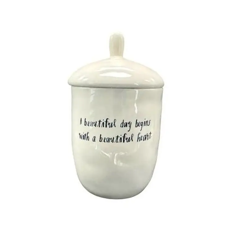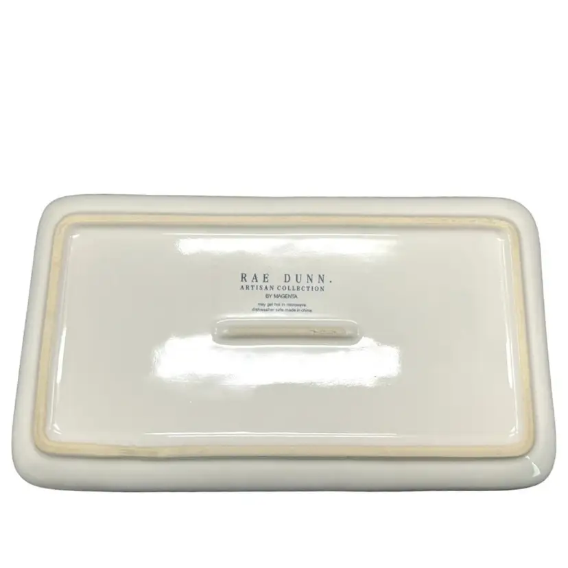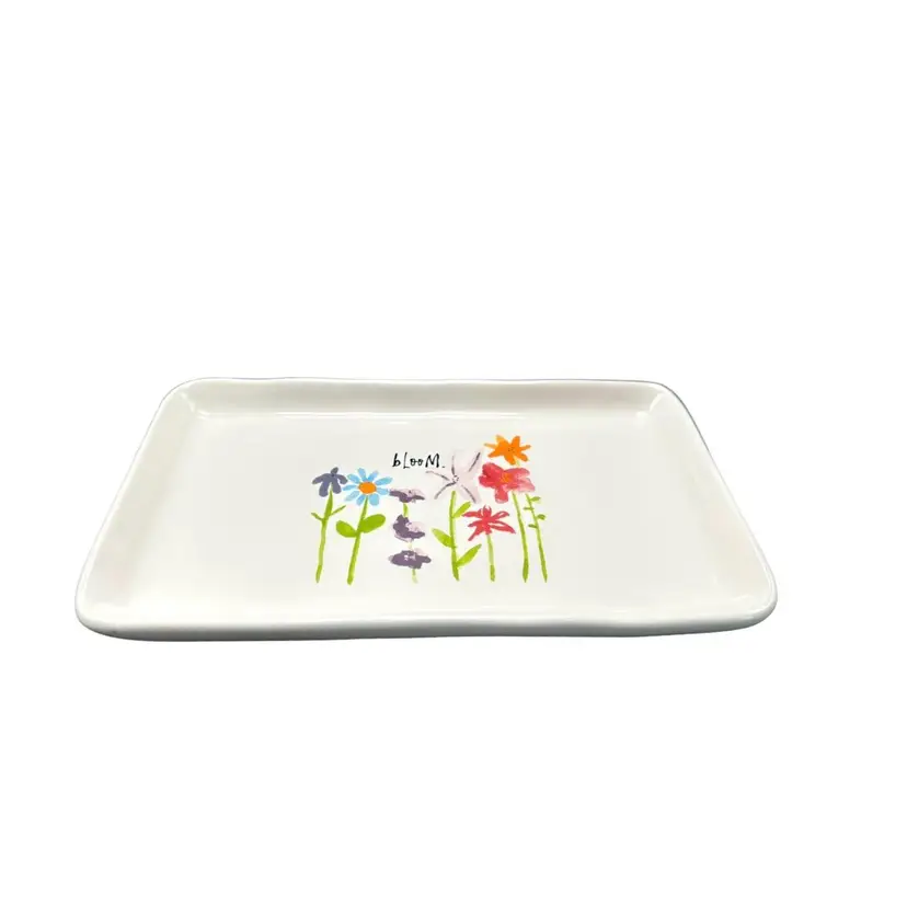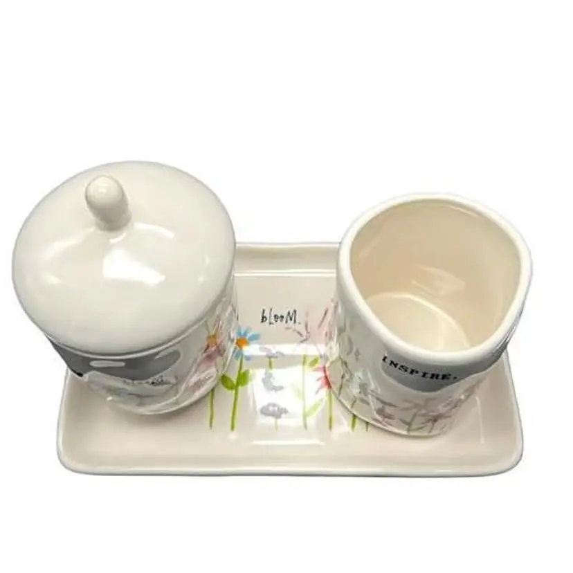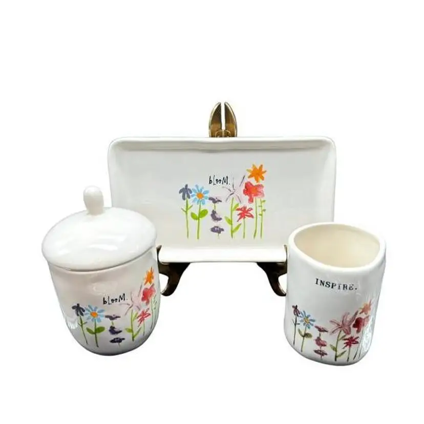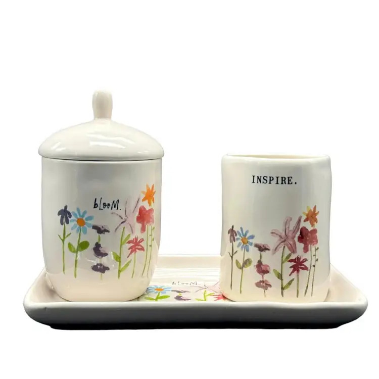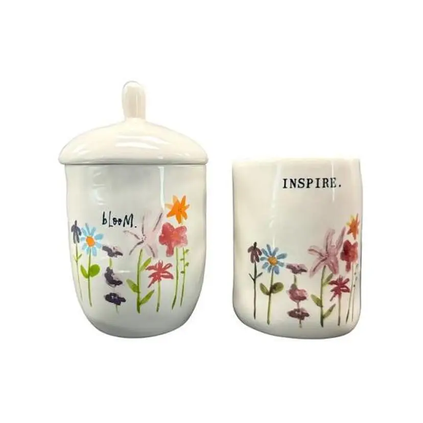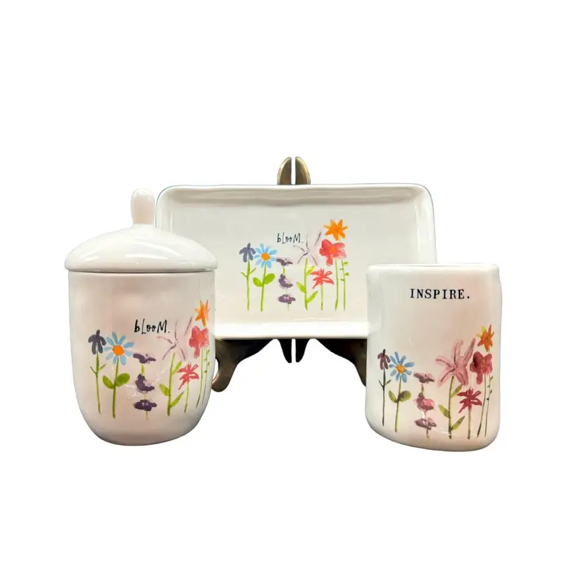 Rae Dunn Artisan Collection by Magenta "BLOOM" discounted pattern set has a rectangle tray "BLOOM", canister with lid "BLOOM" and cup "INSPIRE".