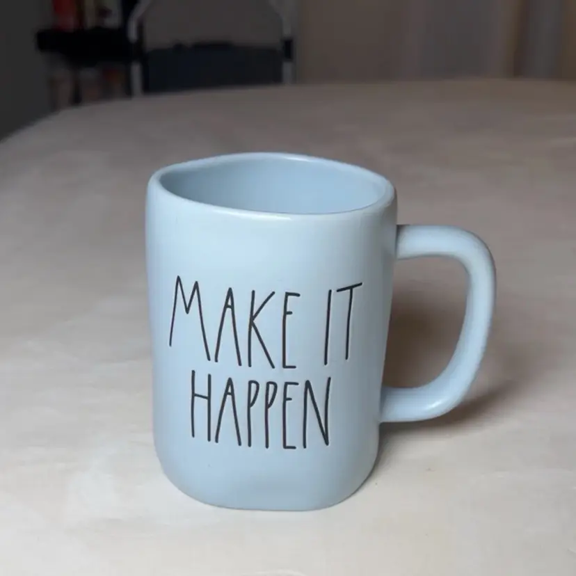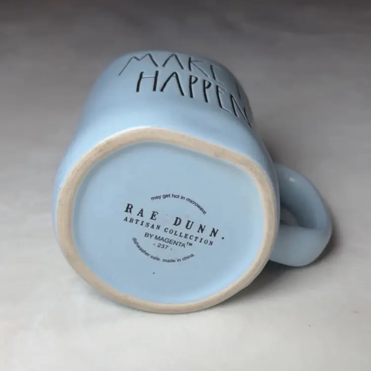 The Rae Dunn Blue “Make It Happen” 5” Mug from the Artisan Collection by Magenta is a stylish and functional ceramic mug perfect for all occasions. With a glossy finish, this mug features the brand's signature minimalist design in a beautiful blue color. Made in China using pottery techniques, this original piece is dishwasher safe and features the words "Make It Happen" to inspire positivity and motivation in your daily coffee or tea routine. A must-have for any Rae Dunn fan looking to add a touch of artistry to their kitchen collection. 3.5” width.