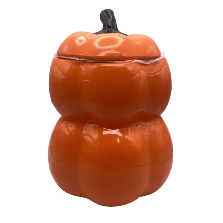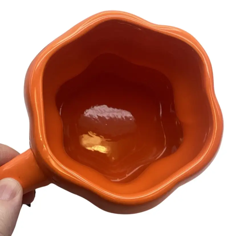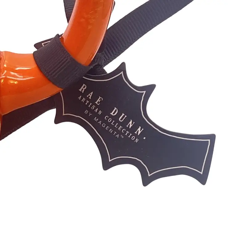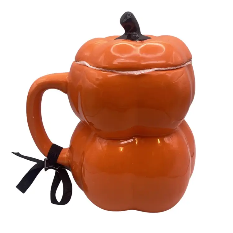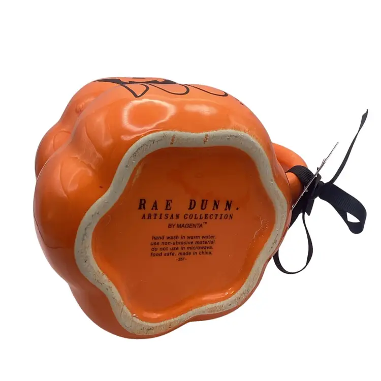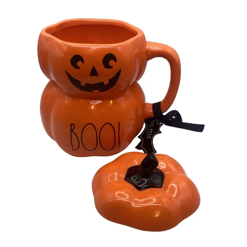 Orange mug, in the shape of two stacked pumpkins with a topper lid and an applied handle Reads “Boo!” on the front just underneath a jack-o’-lantern face Marked as Rae Dunn on the bottom Brand new, unused, still has the original tag No damage