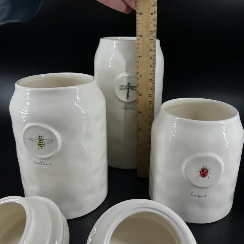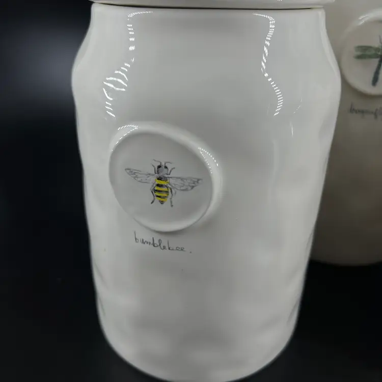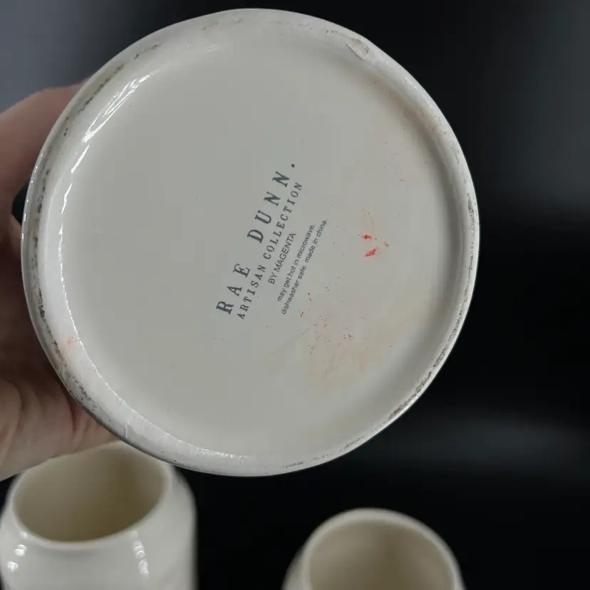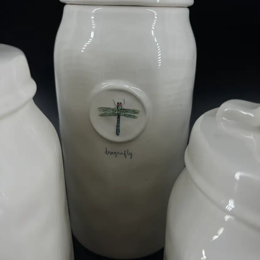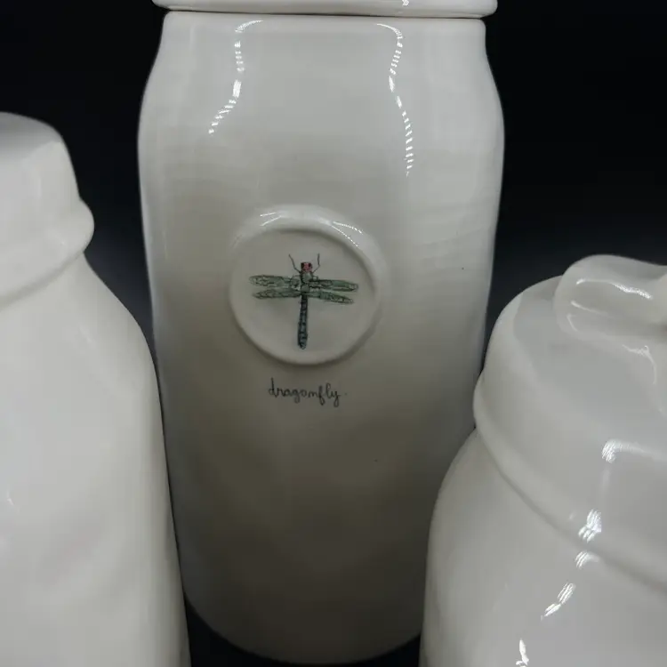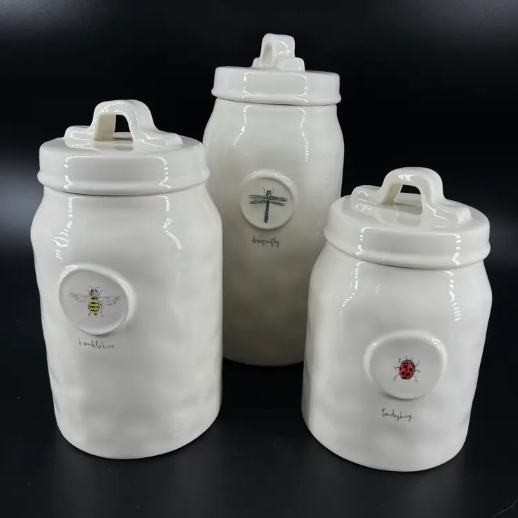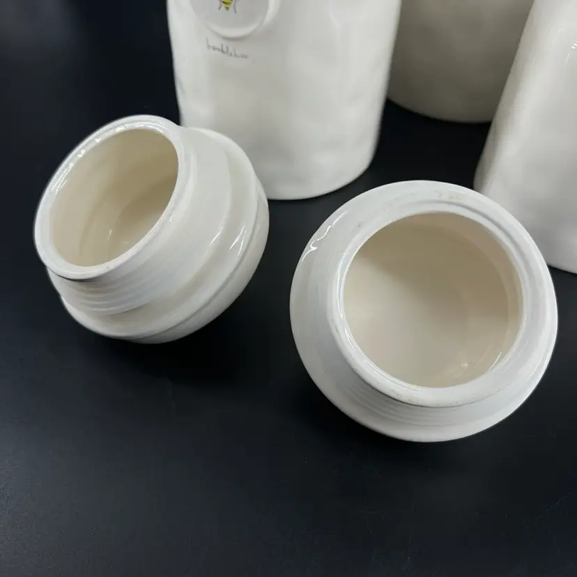 This set of canister is attributed to Rae Dunn. The sizes vary, so please view photos. There is a small chip on the edge of one canister—as shown.