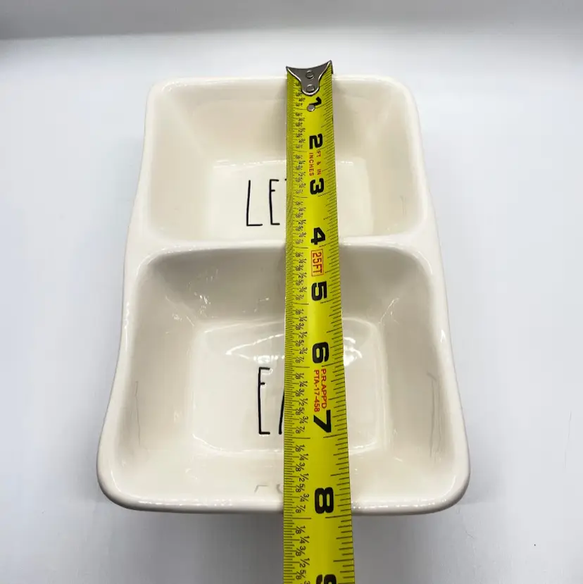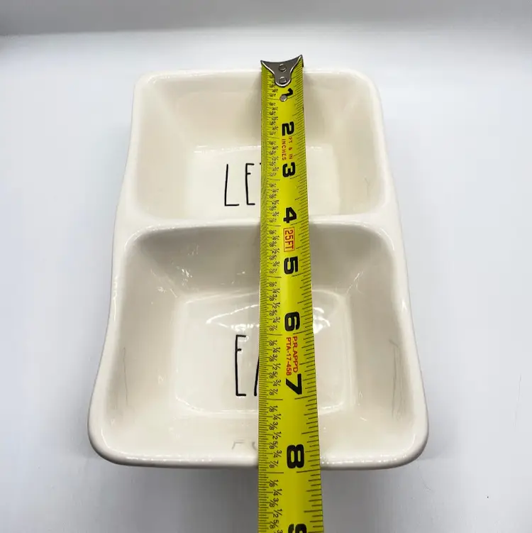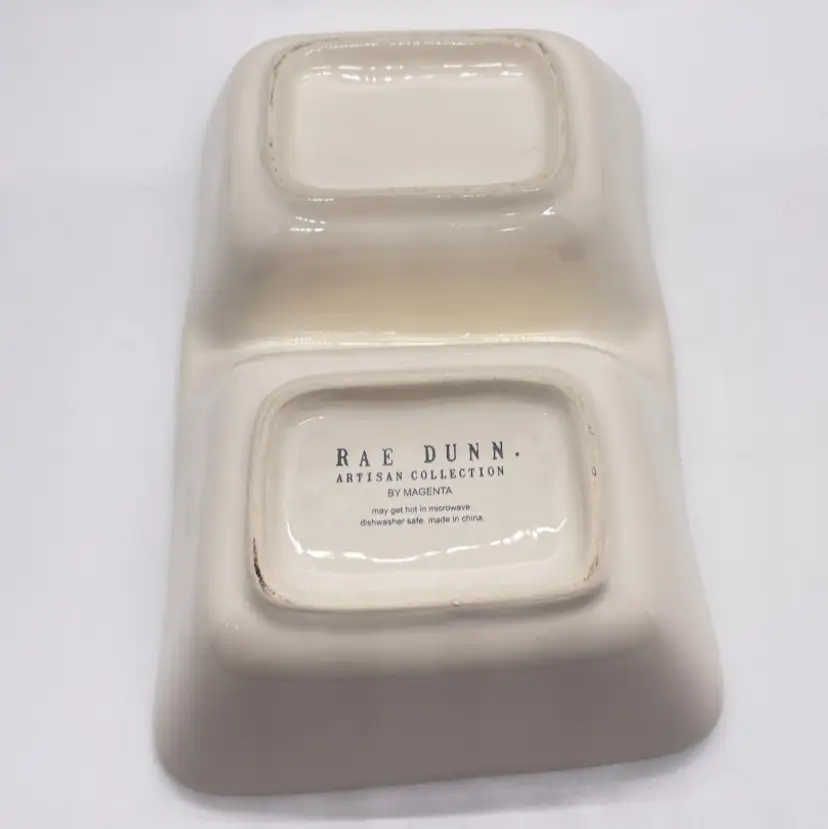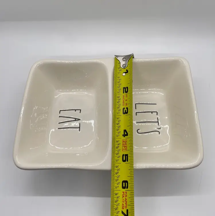 Rae Dunn Artisan Collection by Magenta "Let's Eat" Ceramic Stoneware Divided Snack Dish. No chips or cracks. Signs of light wear and use, such as light scratching and scuffing.