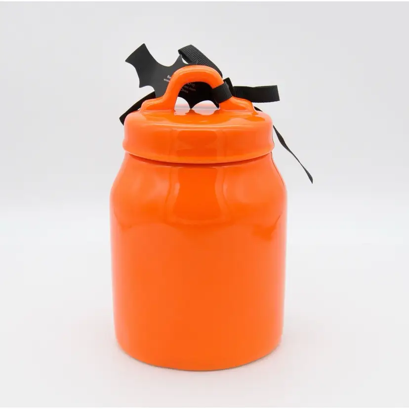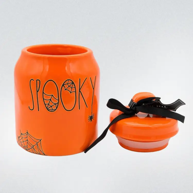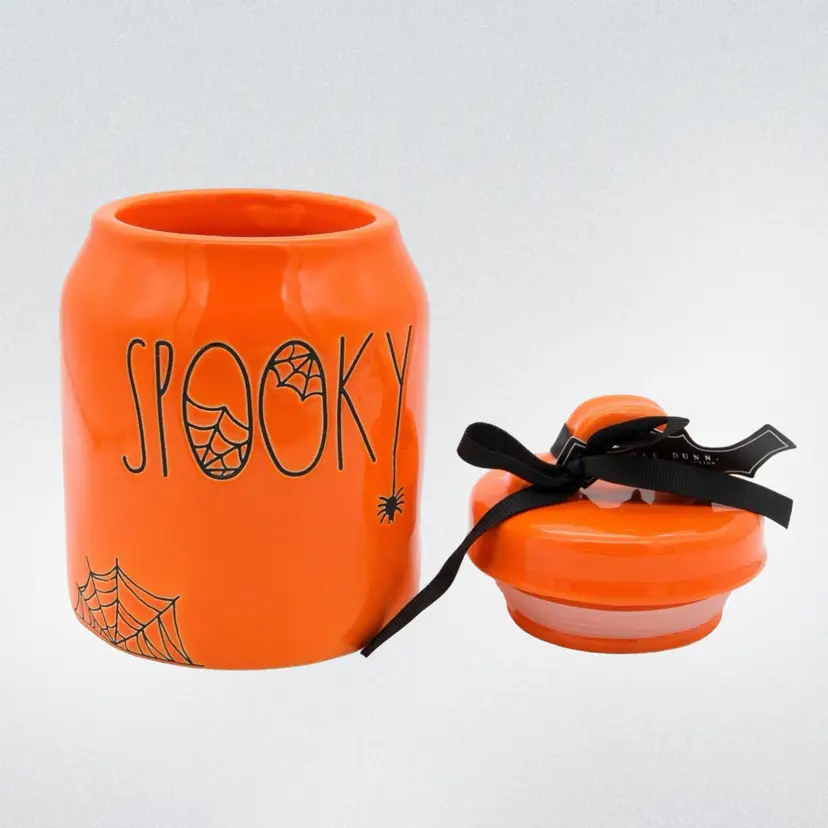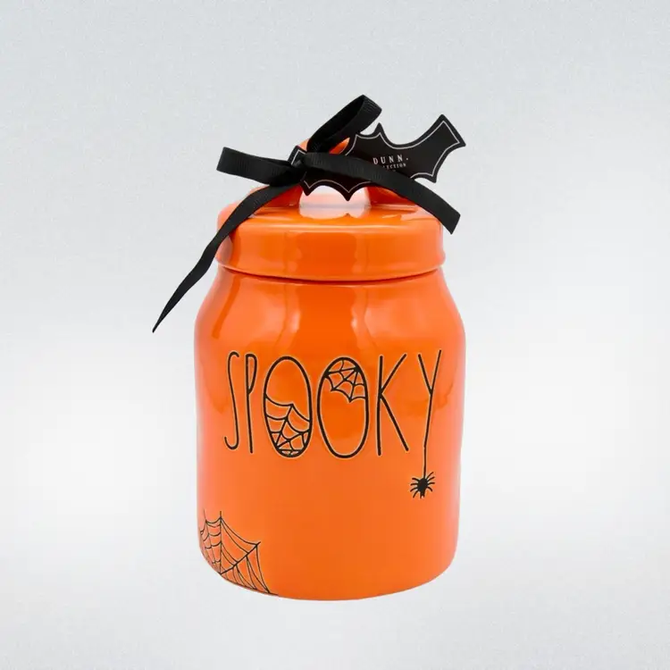 This little ceramic canister by Rae Dunn is 7” high and 4” wide at the base. Decorated in typical Rae Dunn style with the word “Spooky” and embellished with a little spider and web. Perfect for little candies and treats. It is in perfect condition with no chips or cracks.