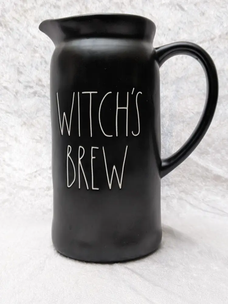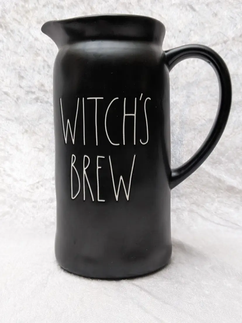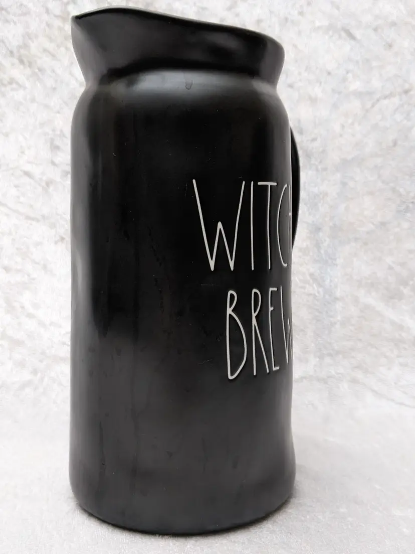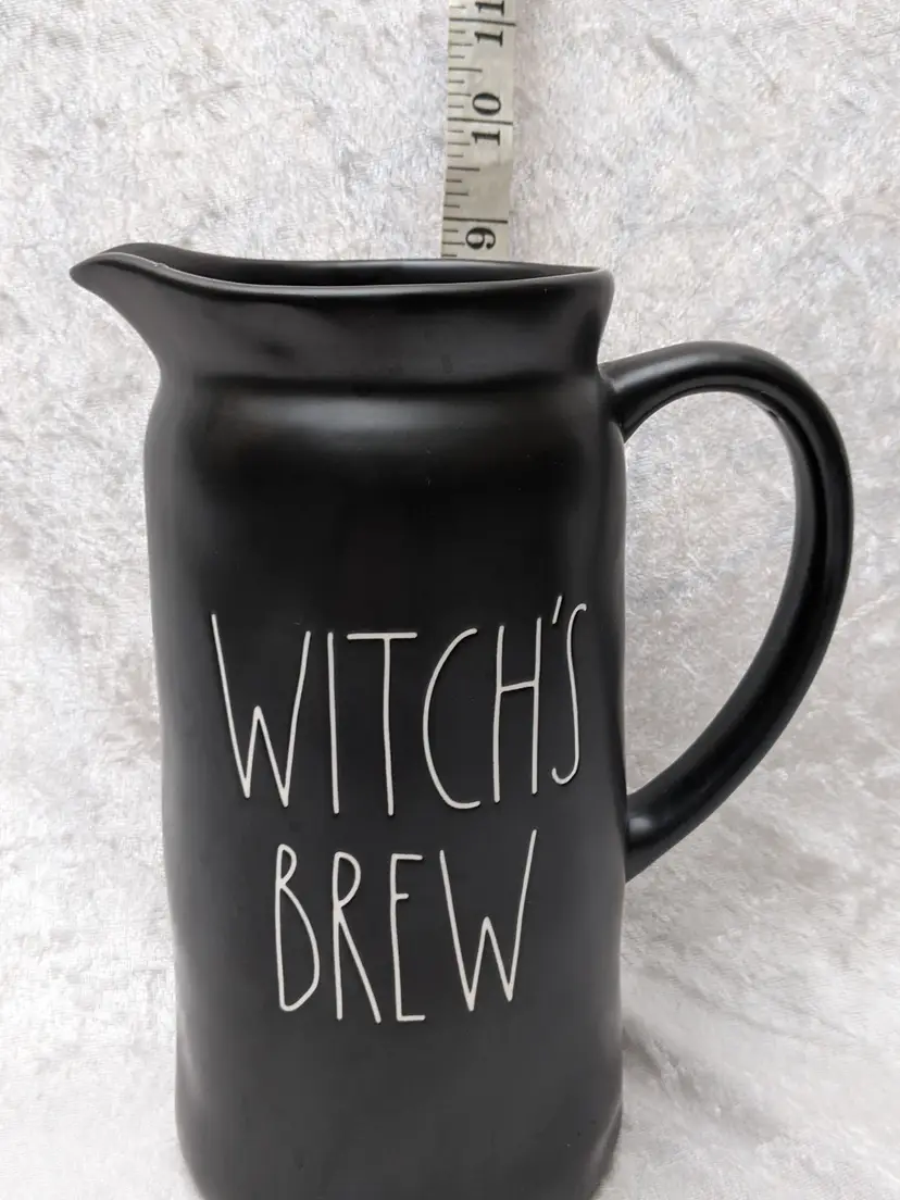 Rae Dunn Witches Brew Pitcher Halloween Black Ceramic Recipe on the Back With bats It is 9"inches tall and 7.5 in wide tot he handle. Perfect Witch Decor and Halloween punch use. Great condition Clean with no damage.no chips or cracks no weird smells. Please check the photos for details. Comes from a smoke free home. We do have pets. It is kept away from them