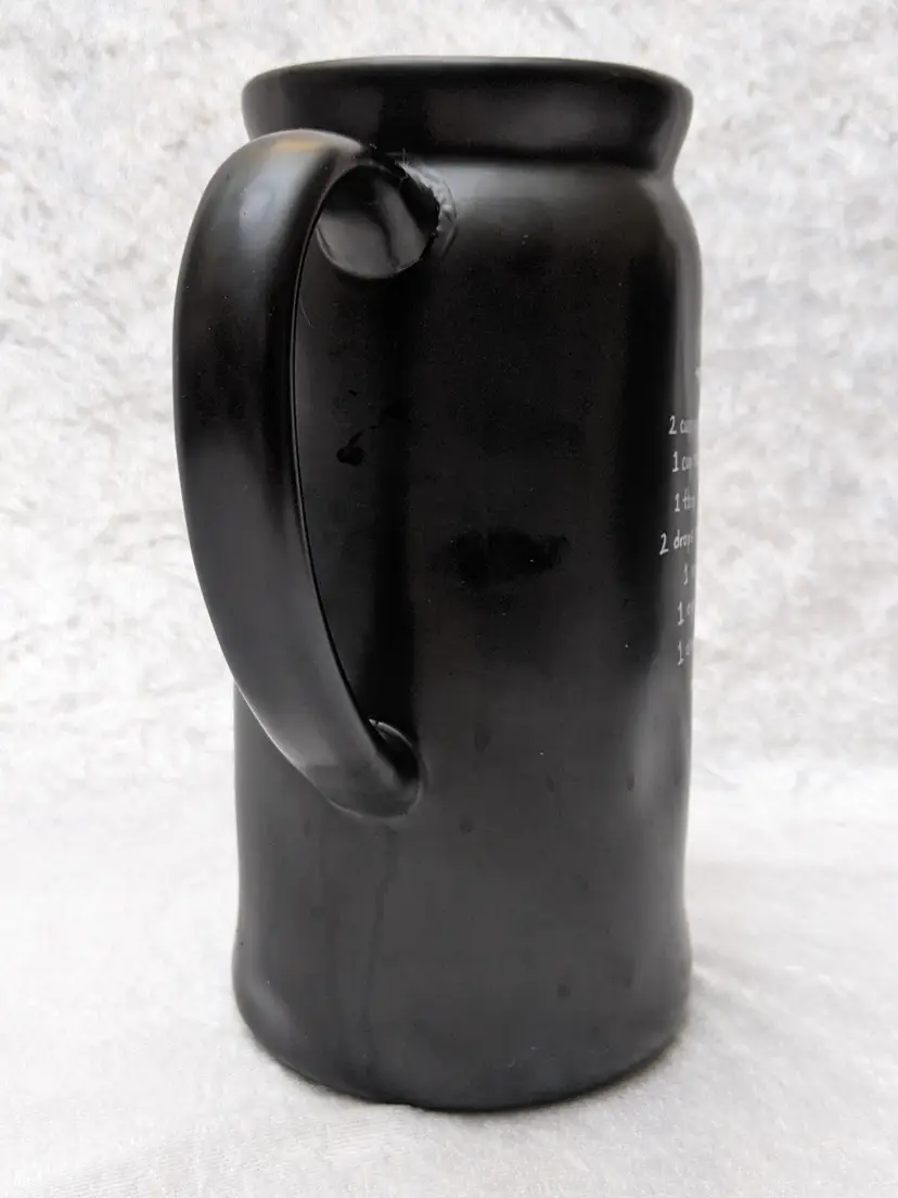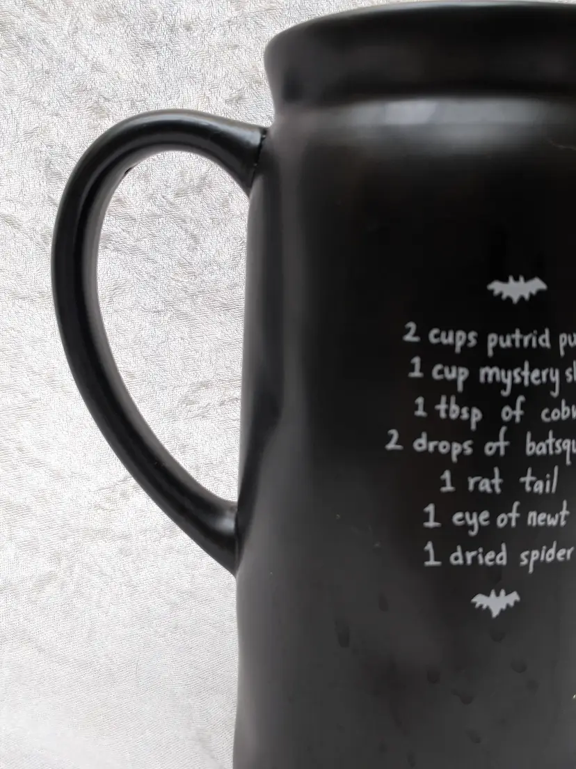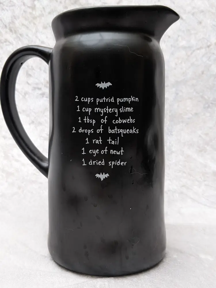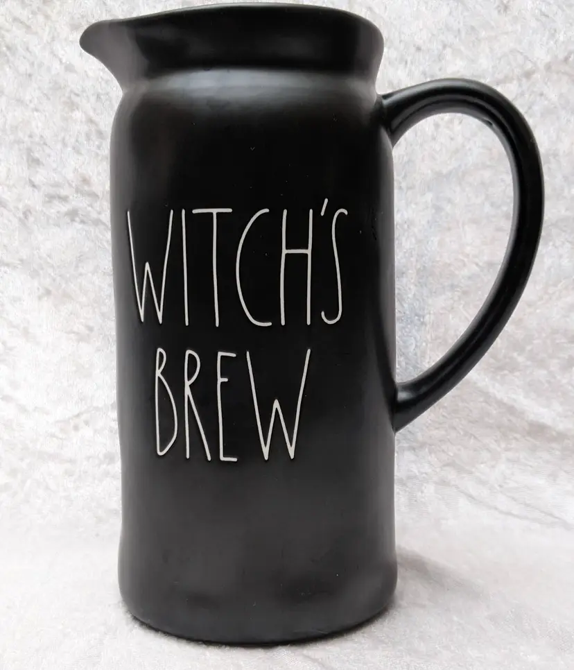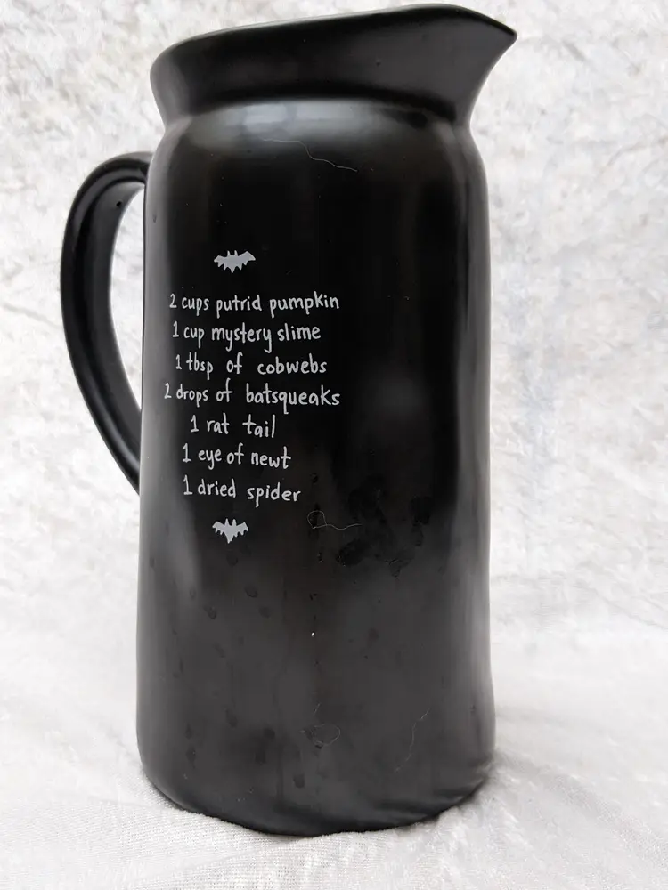Rae Dunn Witches Brew Pitcher Halloween Black Ceramic Recipe on the Back With bats It is 9"inches tall and 7.5 in wide tot he handle. Perfect Witch Decor and Halloween punch use. Great condition Clean with no damage.no chips or cracks no weird smells. Please check the photos for details. Comes from a smoke free home. We do have pets. It is kept away from them